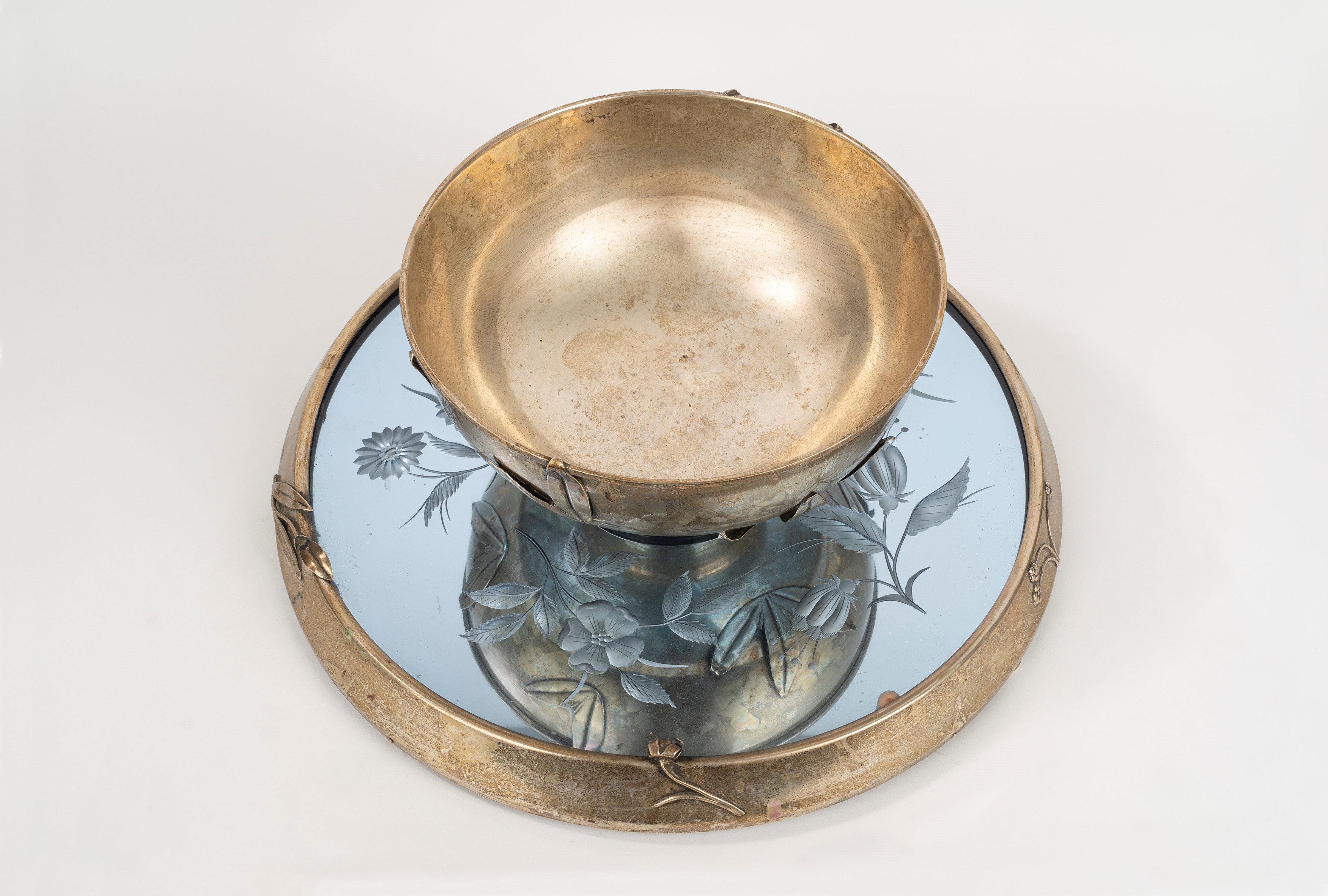 composto da vassoio con bordo in argento e piano in specchio decorato a motivi floreali, e ciotola in argento