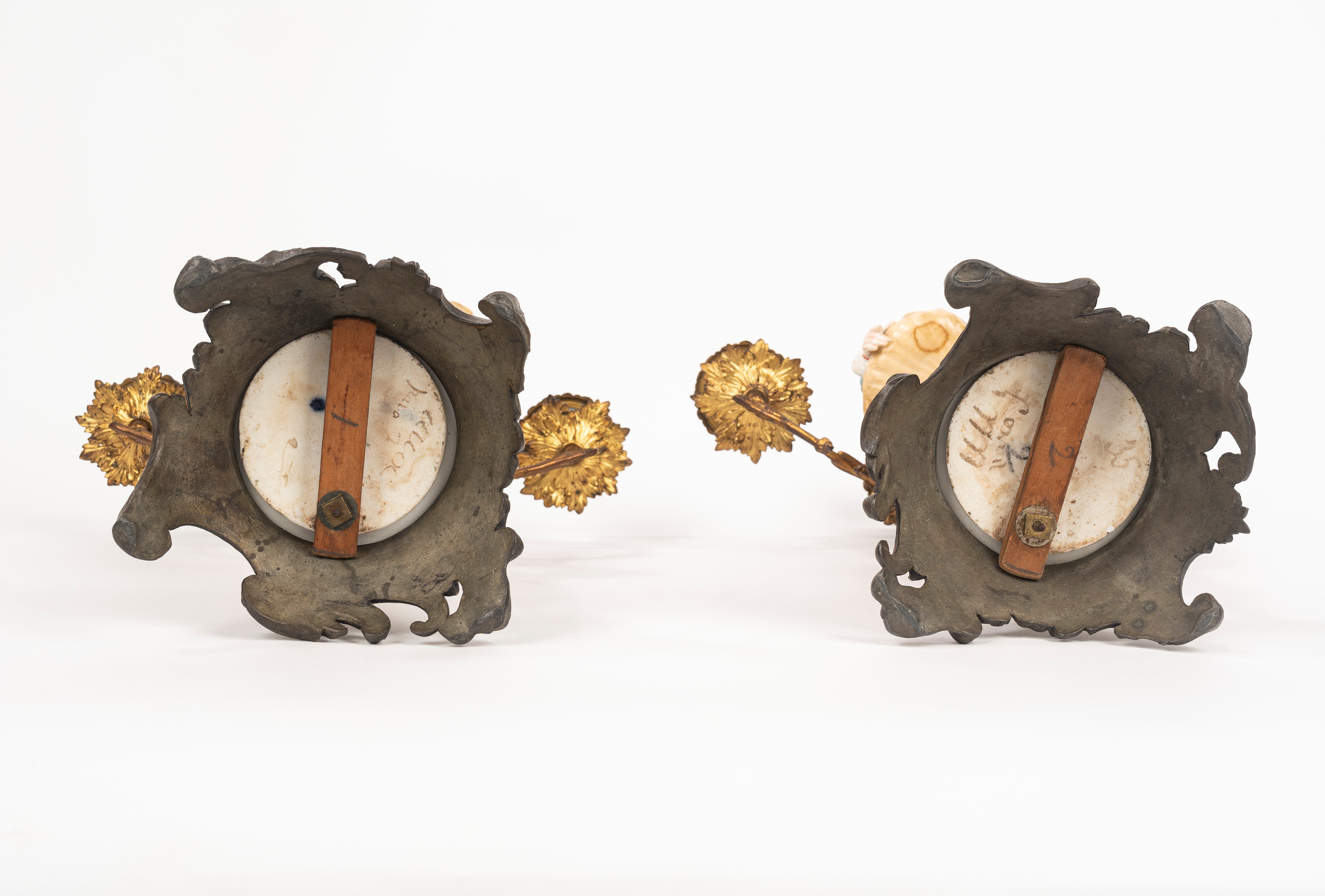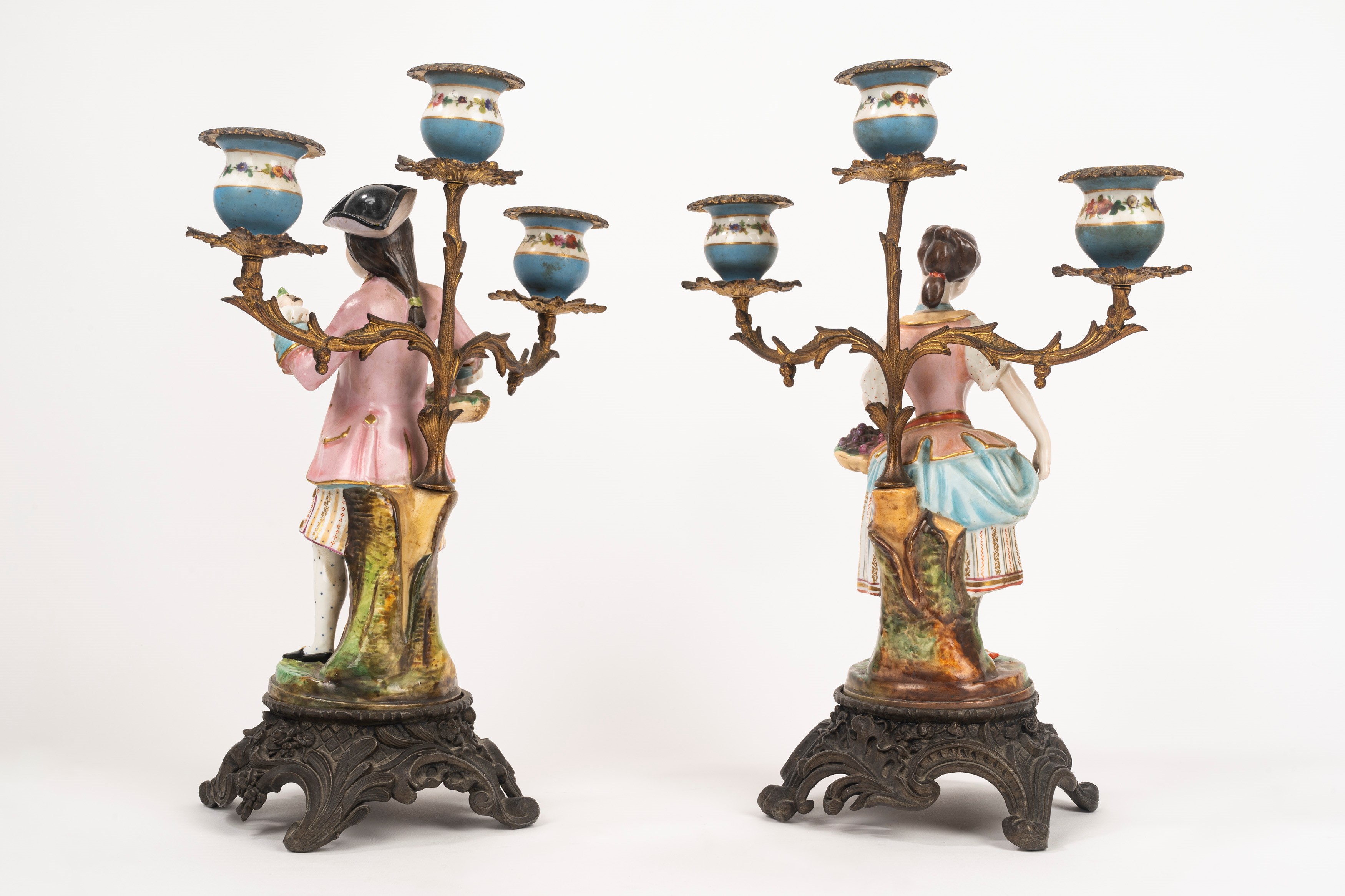 Coppia di candelabri in porcellana policroma e metallo, secolo XIX