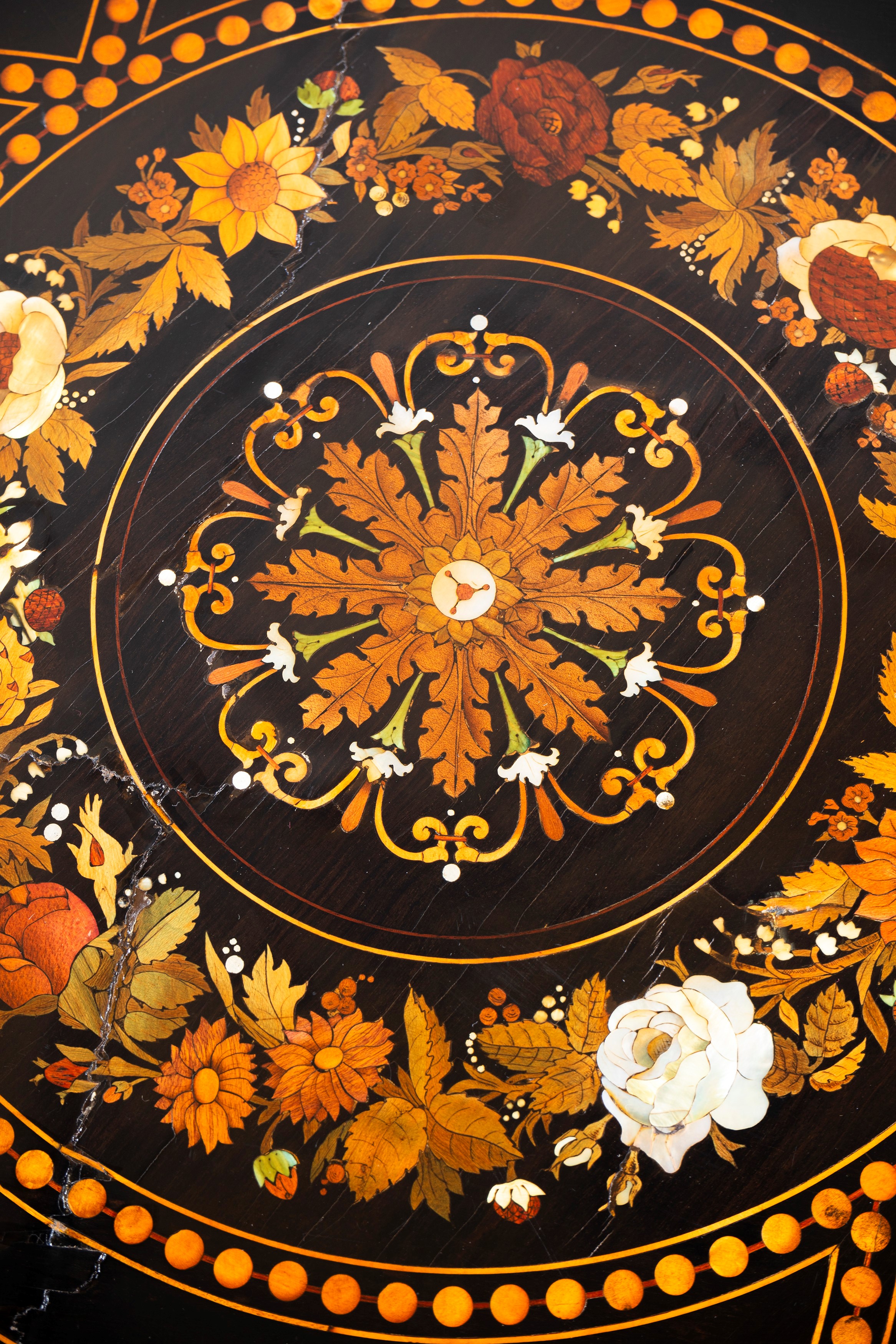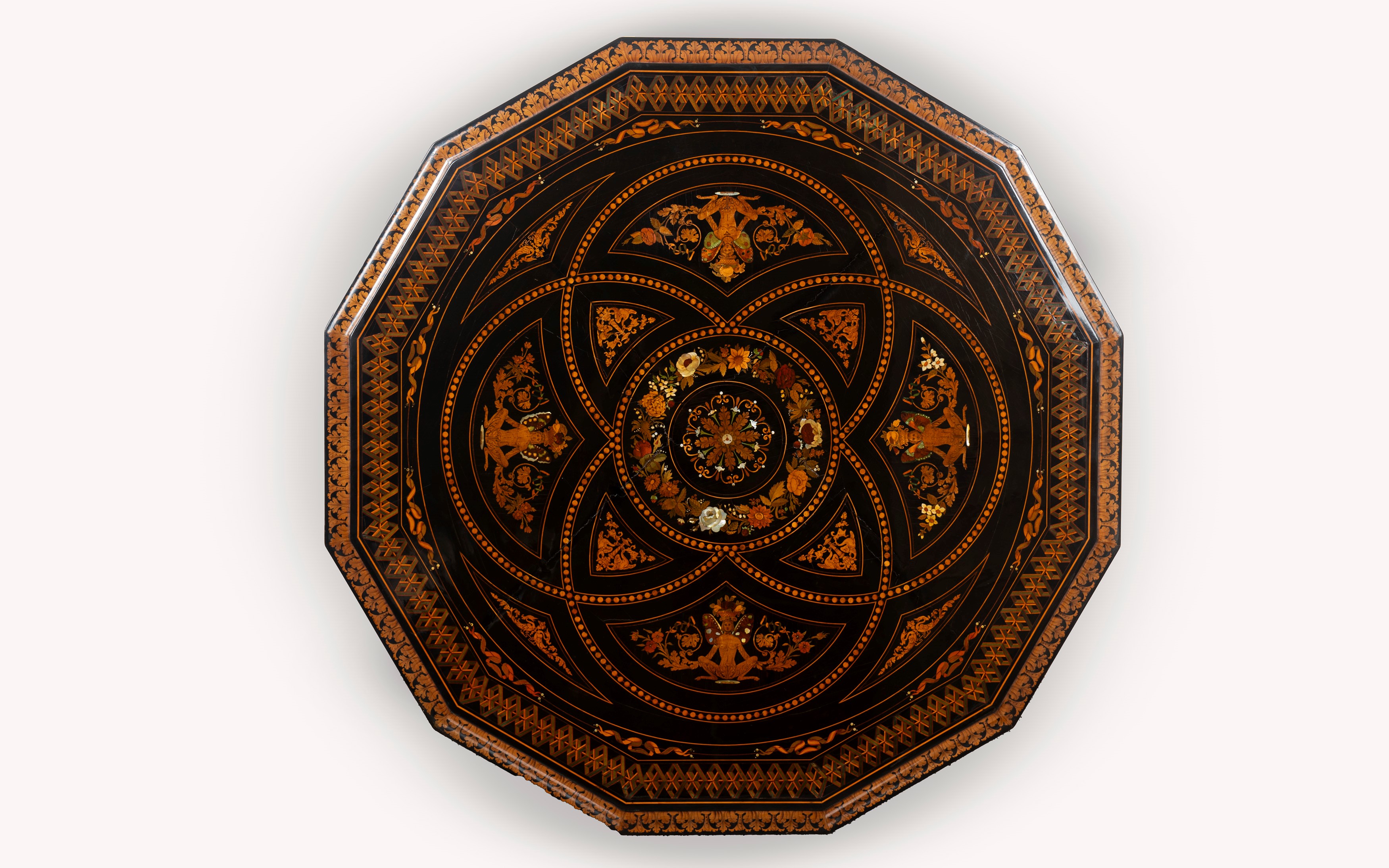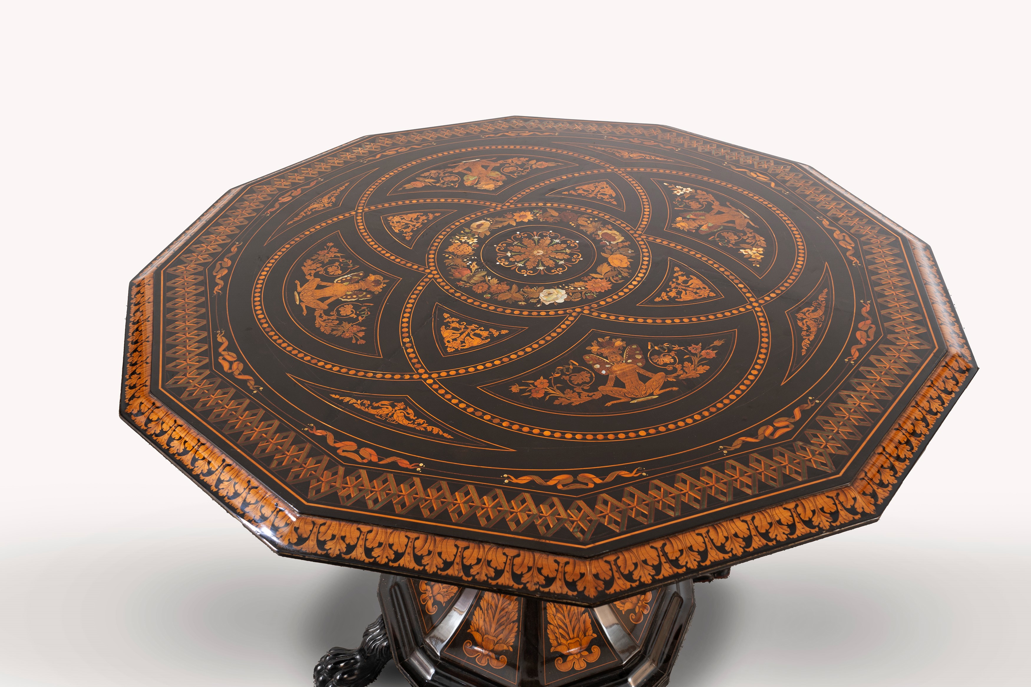 Importante tavolo magistralmente intarsiato in legni, essenze varie e madreperla, secolo XIX