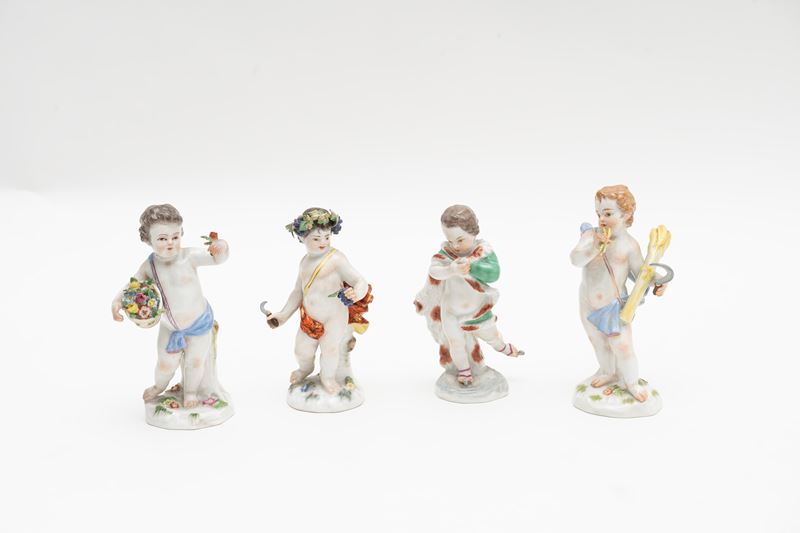 Quattro putti in porcellana policroma, raffiguranti allegorie delle Quattro Stagioni, manifattura di Messein, secolo XX