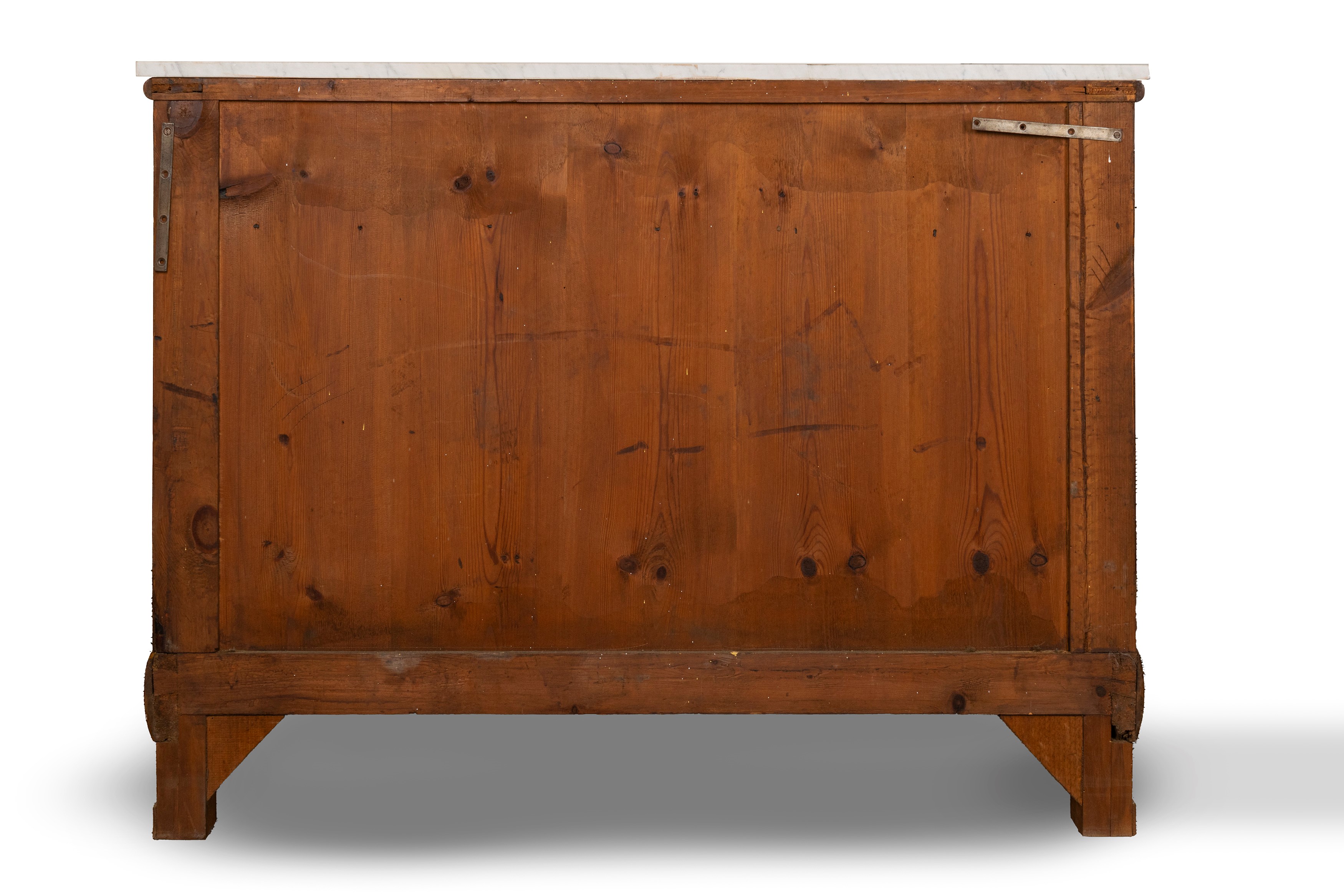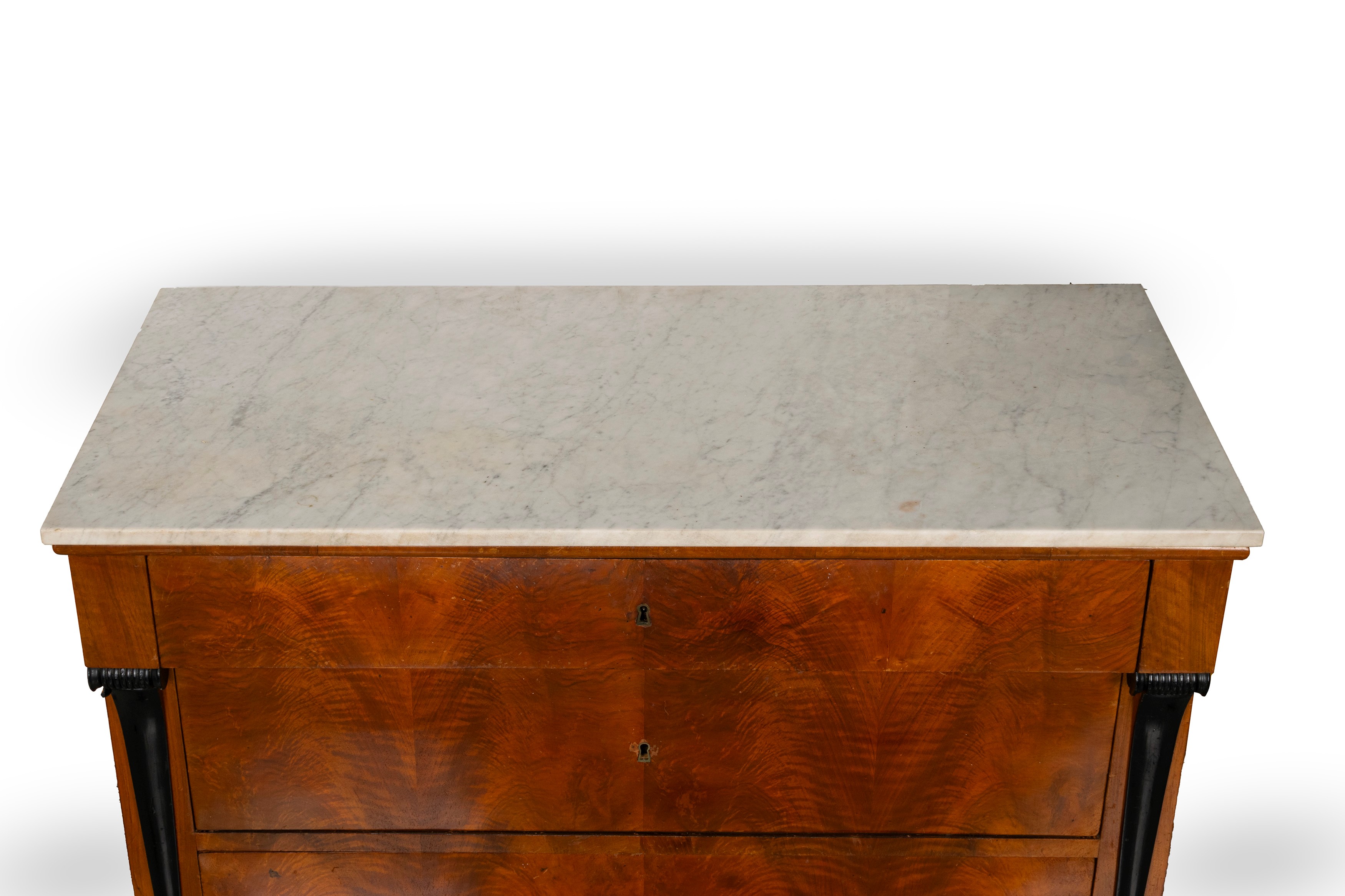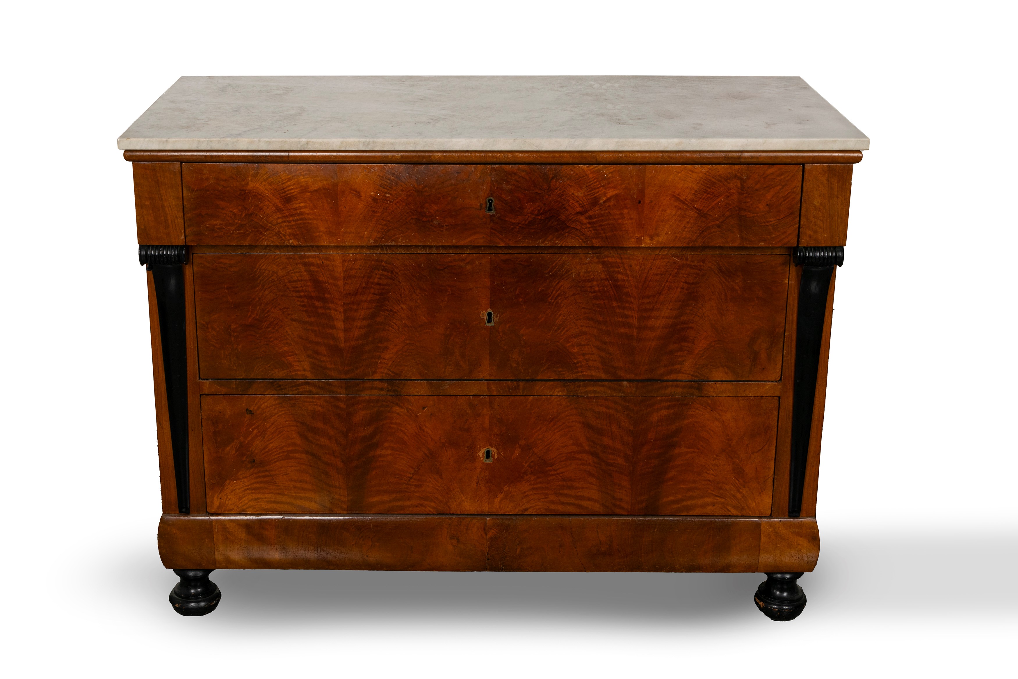 fronte a tre cassetti, montanti a colonna rastremata ed ebanizzata, piedi anteriori a cipolla, piano in marmo bianco