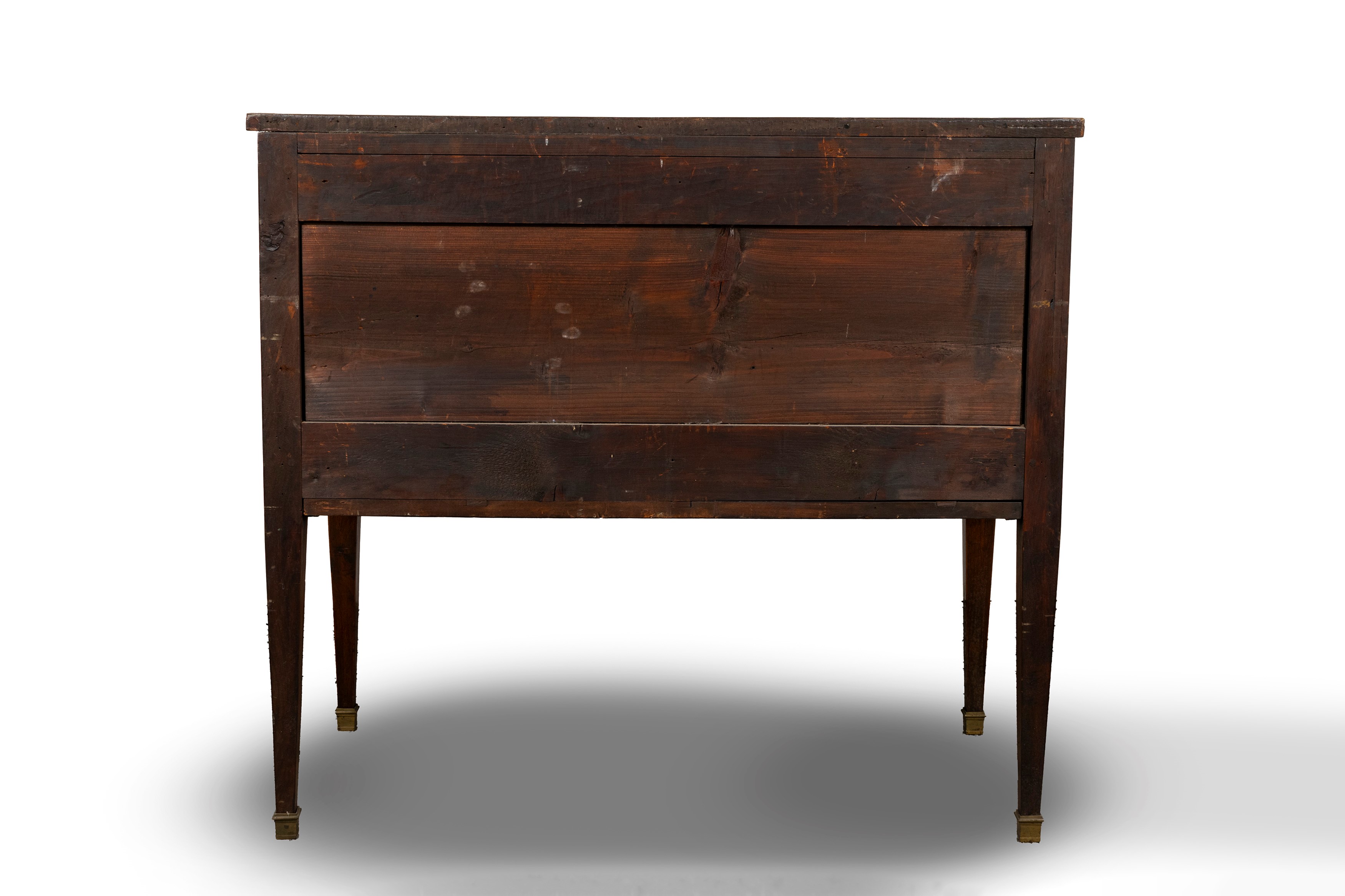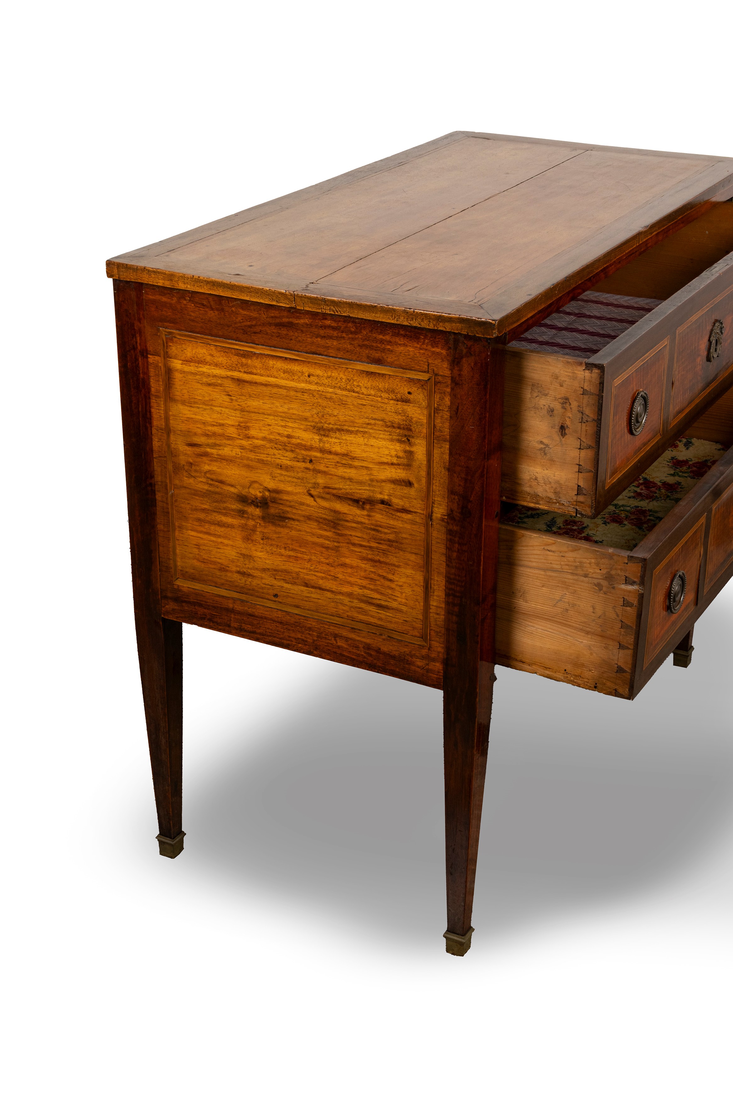 in legno intarsiato con filettature a riserve rettangolari, due cassetti, maniglie, bocchette e scarpette in bronzo