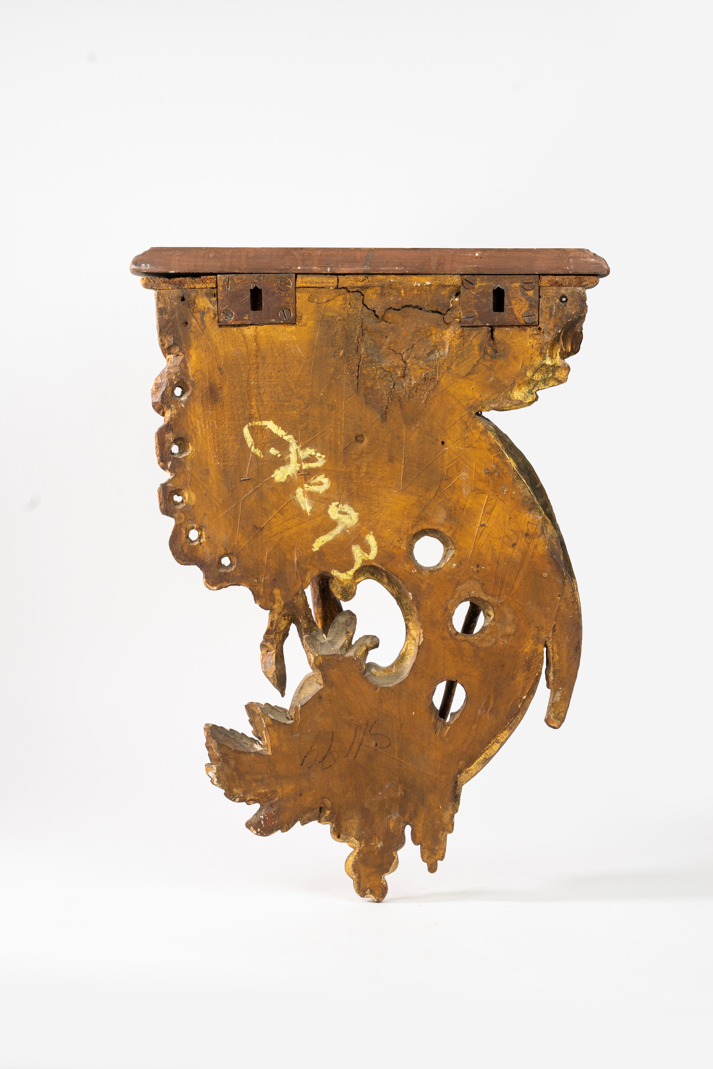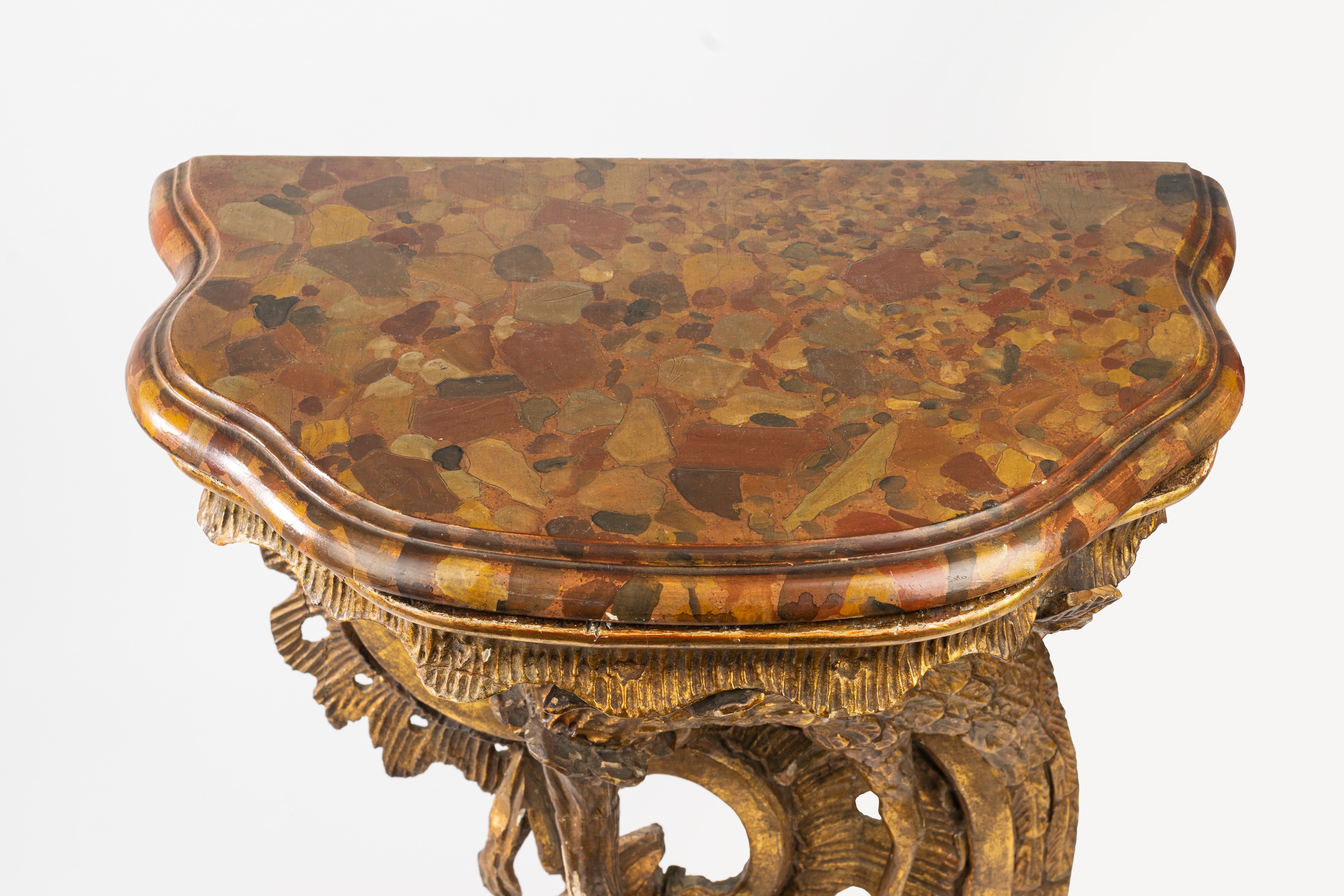 sostegno a rocaille con fenice a rilievo tra fiori, foglie, grappolo d'uva e melograno, piano sagomato a finto marmo (difetti, una con mancanze)