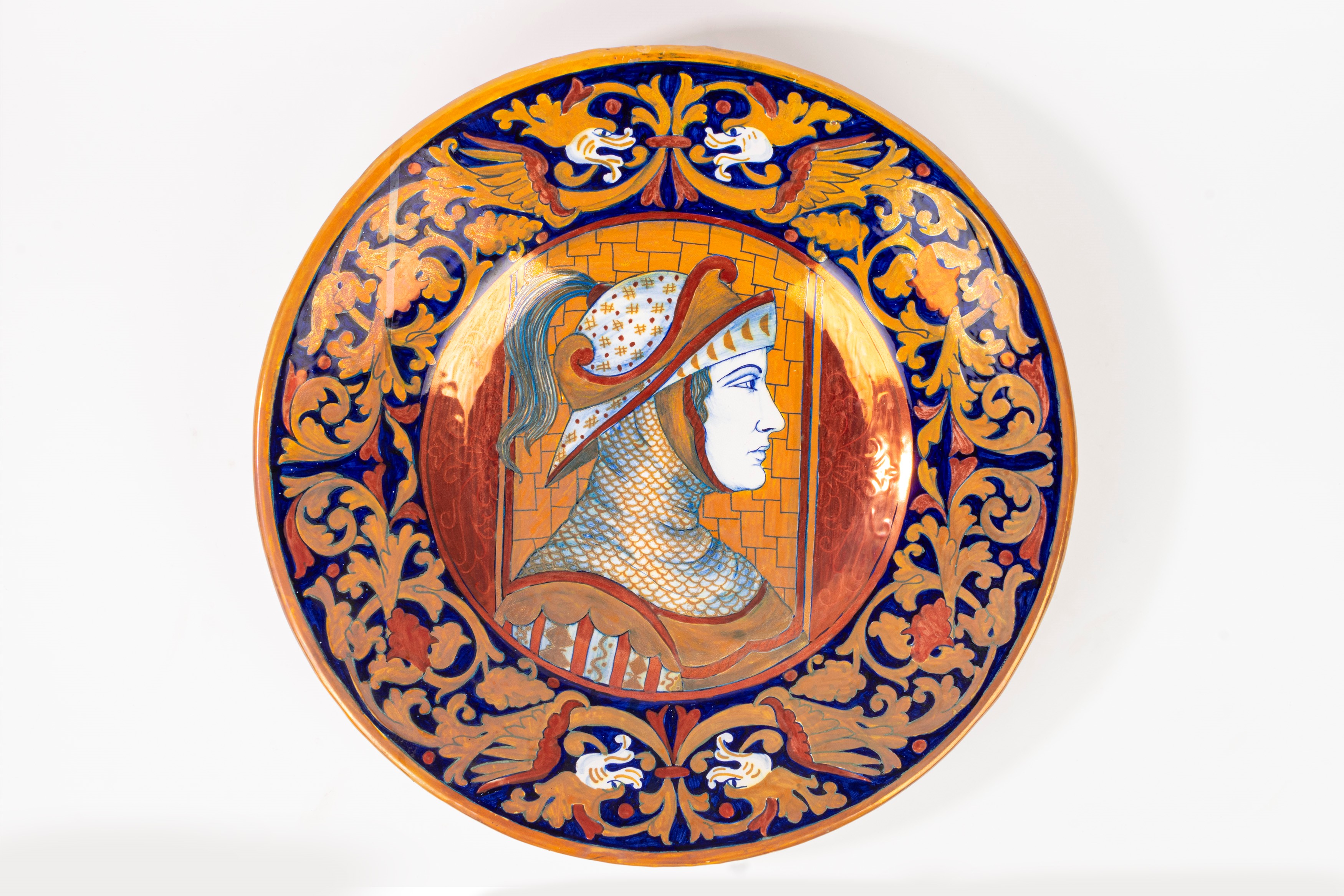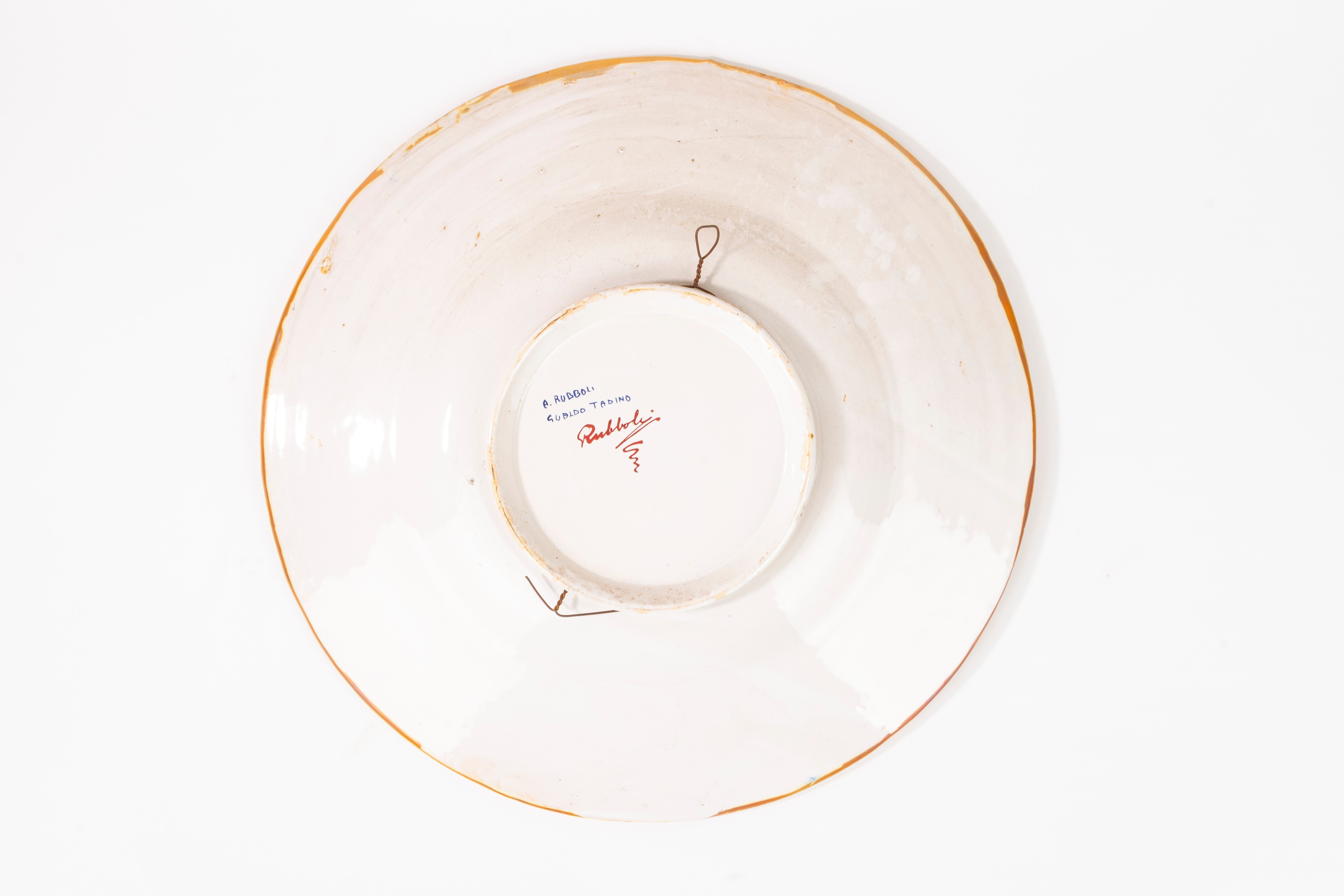 il cavetto decorato con Bella e Guerriero di profilo, la tesa a grottesche. Firmati al retro A. Rubboli in blu, Rubboli a lustro
