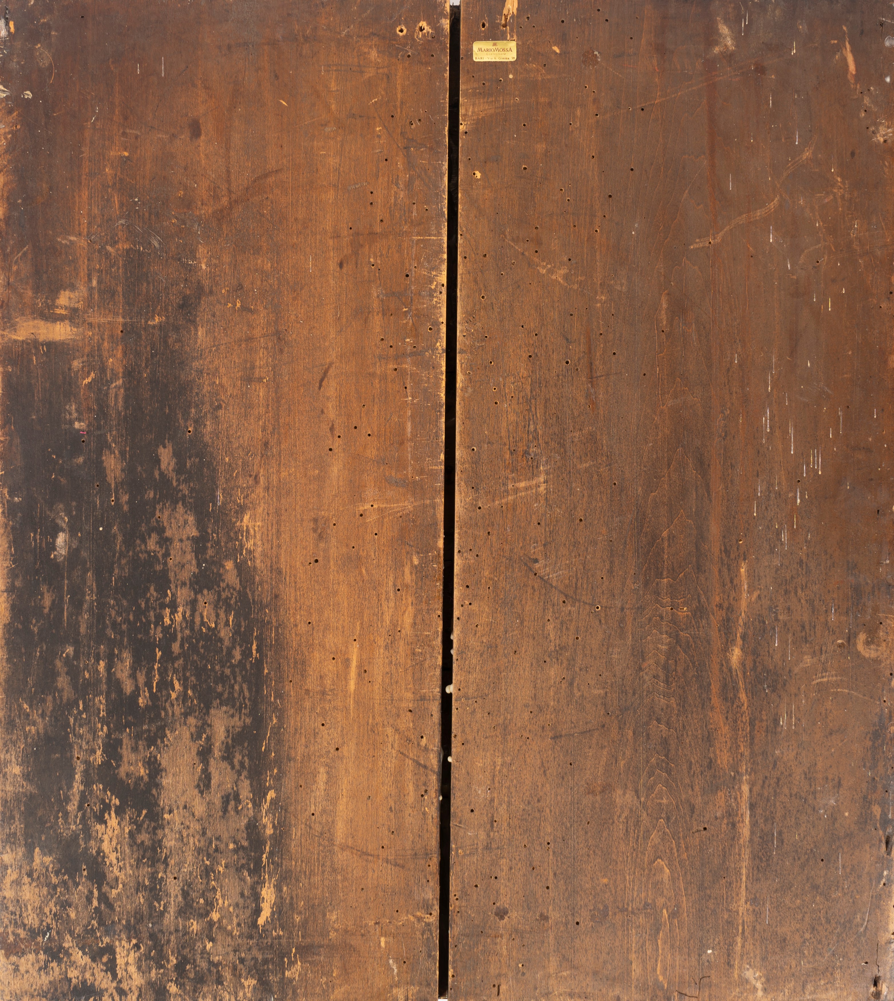 sulla tavola sono raffigurate: a sinistra della Croce, le tre Marie (Madonna, Marta e Maria); a destra San Giovanni Evangelista, San Longino e San Nicodemo; sullo sfondo i due ladroni crocifissi e veduta di Gerusalemme; agli angoli medaglioni con i quattro Evangelisti; sui lati sei santi
