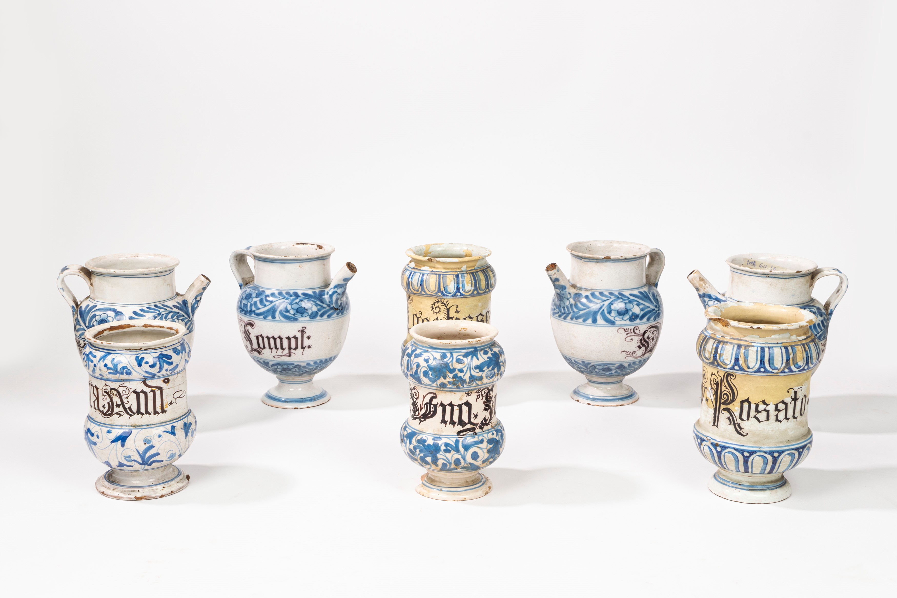 corpi decorati in monocromia blu a volute fogliate e baccellature centrati da cartigli con scritte apotecarie (difetti, mancanze e restauri)