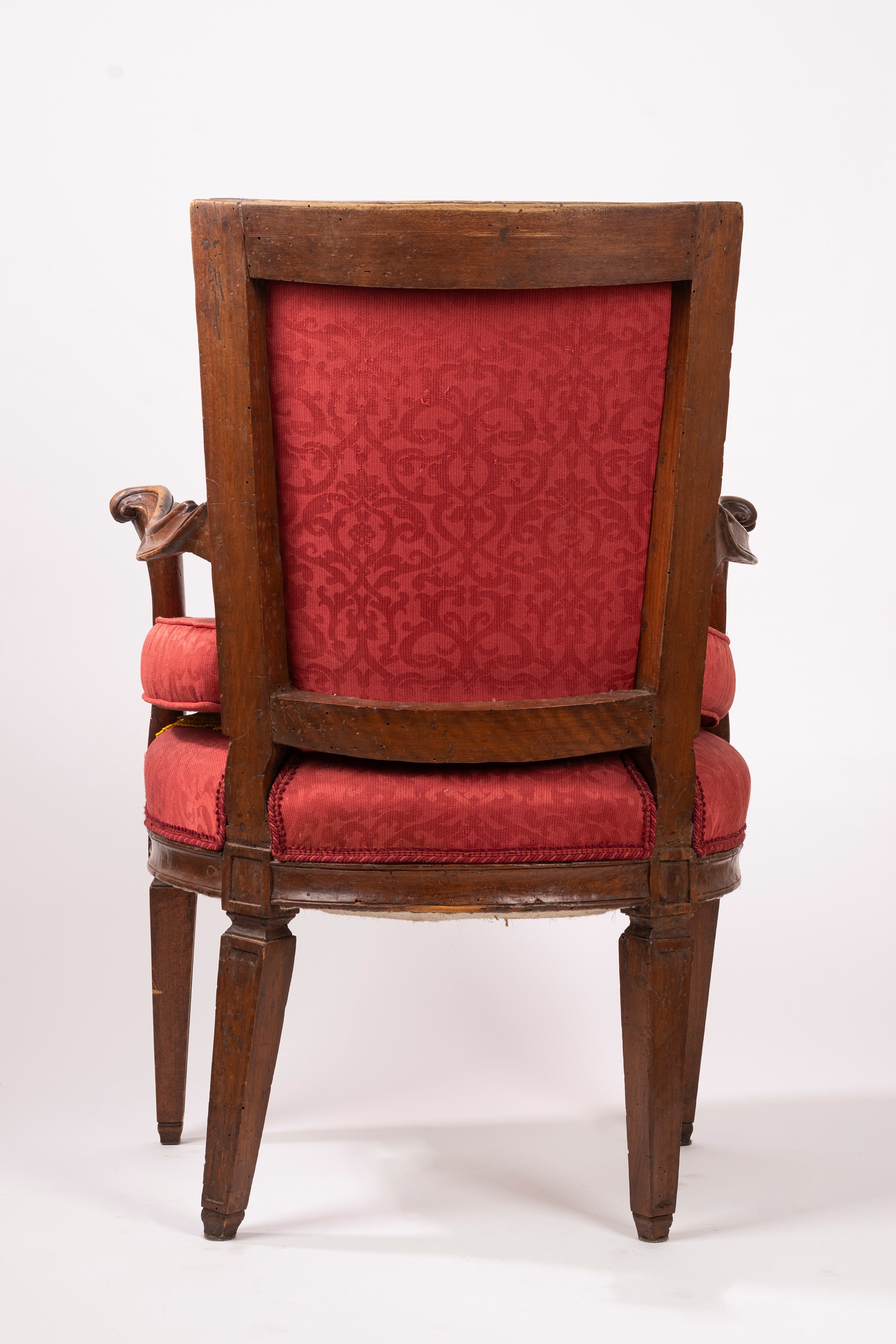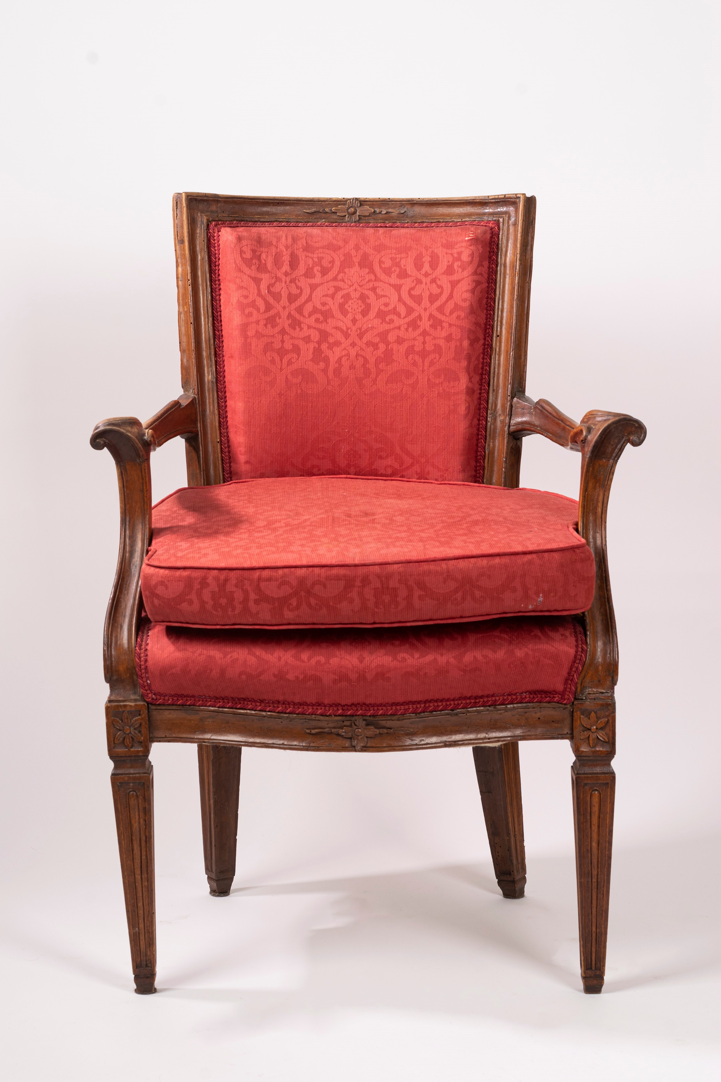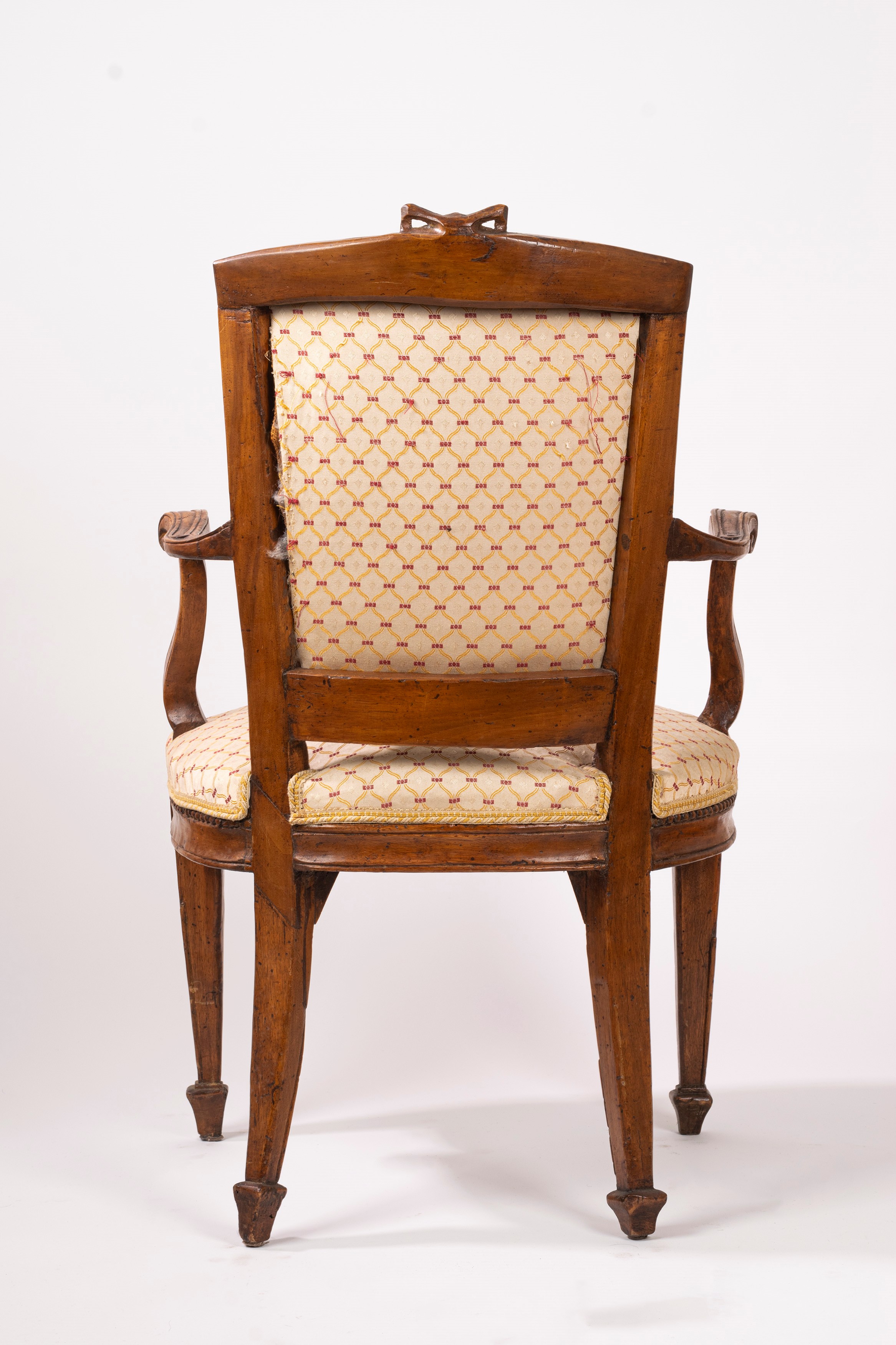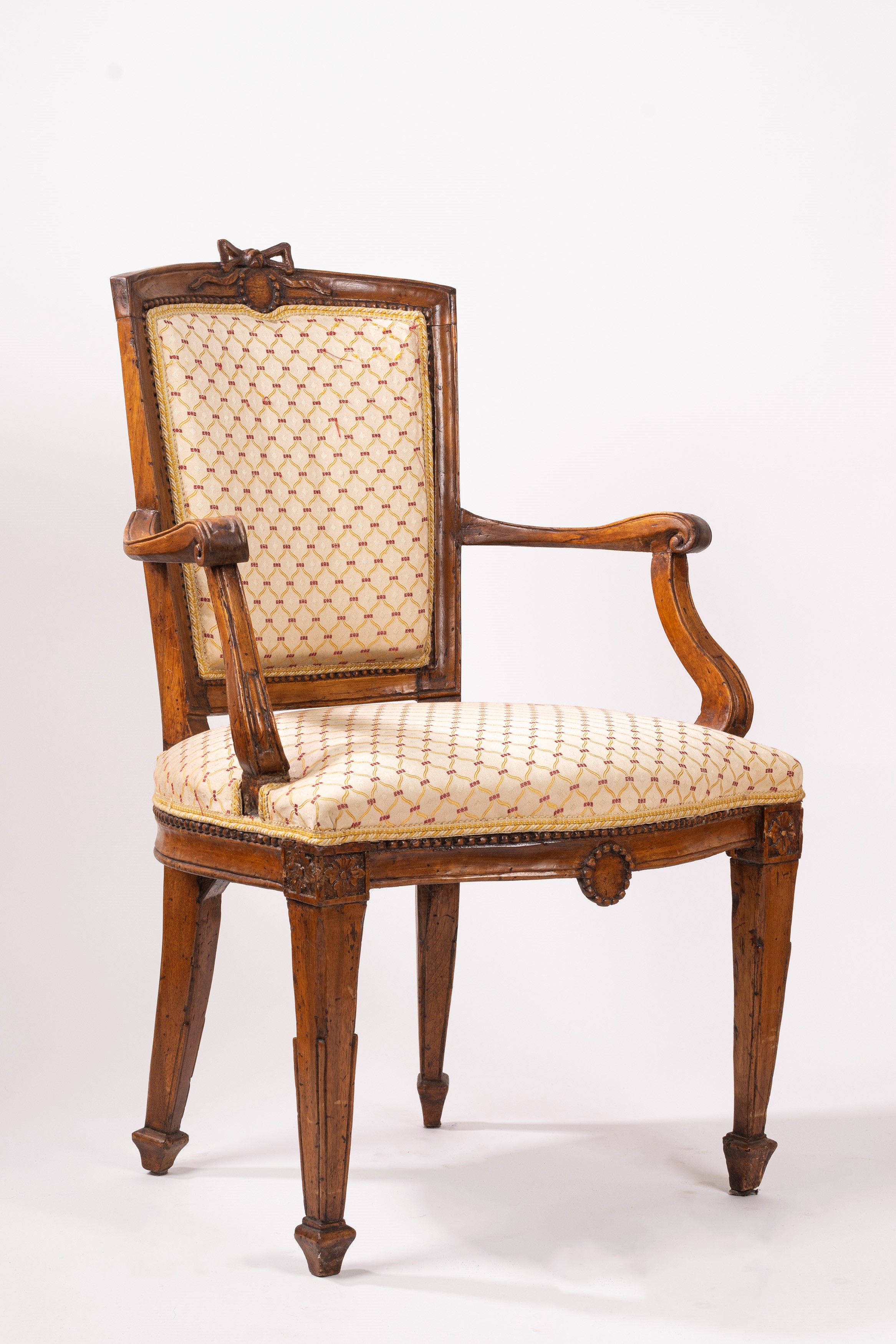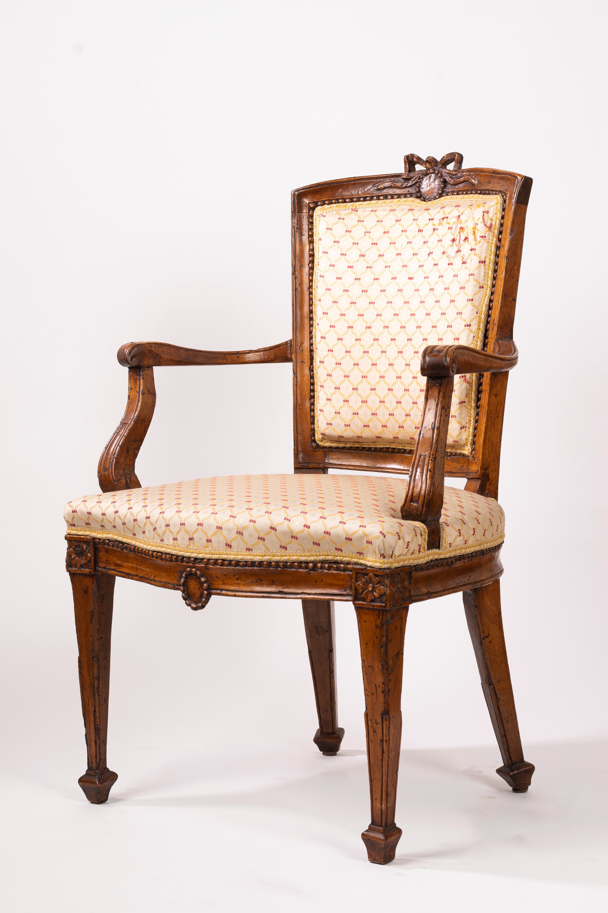 con gambe rastremate con motivo floreale all'attacco, montanti mossi, braccioli terminanti a ricciolo e schienale di forma squadrata