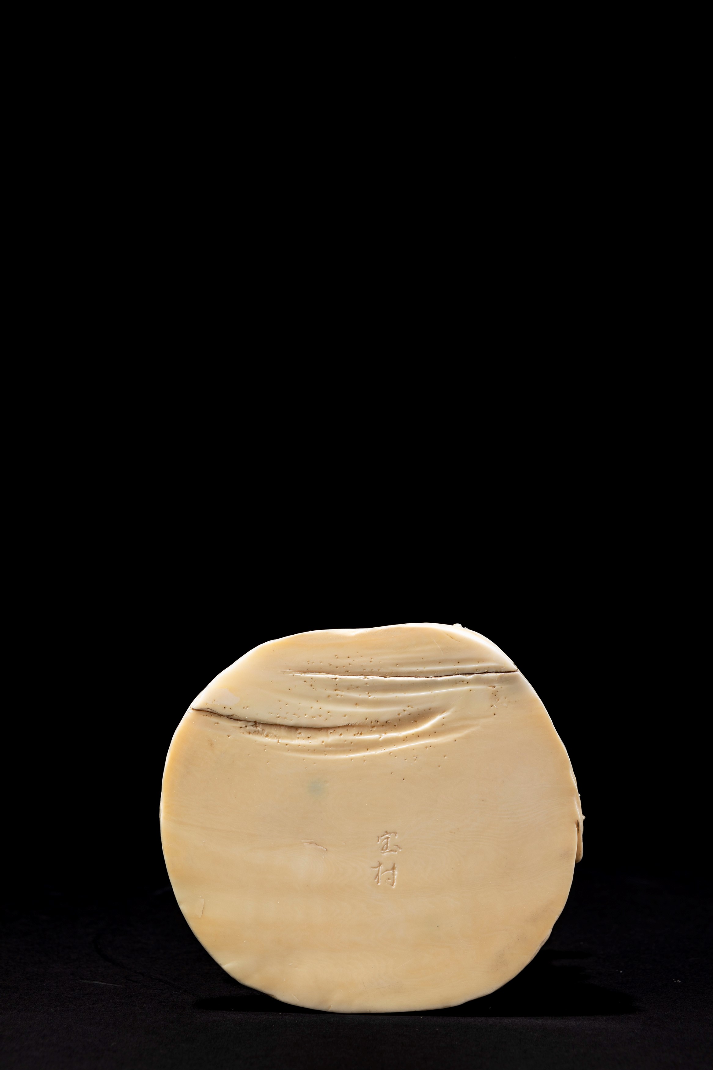 finemente lavorato e raffigurante carpa koi tra onde sormontato da saggio seduto mentre dispiega una pergamente verso il suo allievo (difetti)