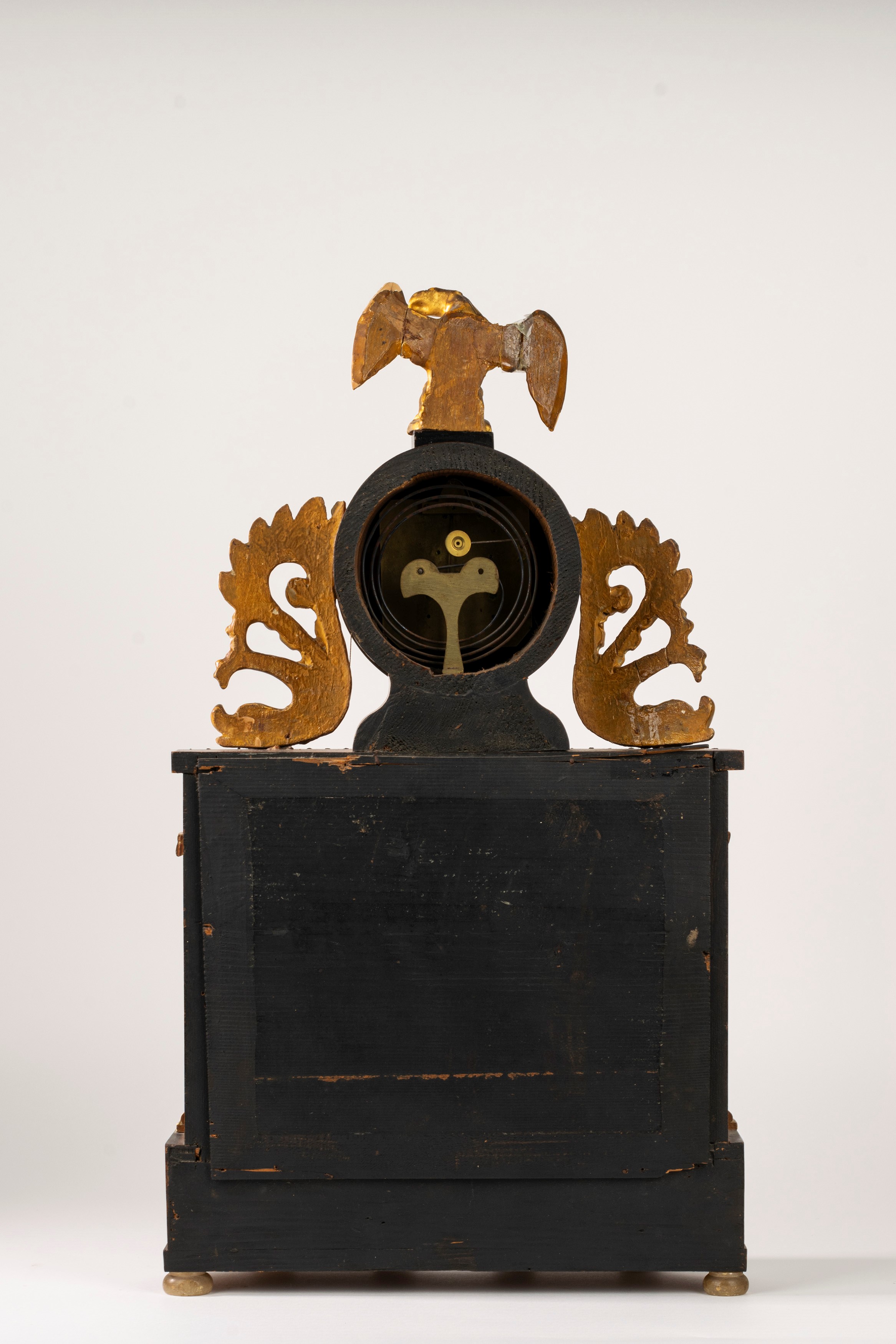 sul fronte applicazioni in bronzo dorato e sei colonne in alabastro con capitello corinzio e base in legno intagliato e dorato, quadrante a numeri arabi in porcellana sormonto da aquila lignea, ai lati fregi dorati a guisa di delfini