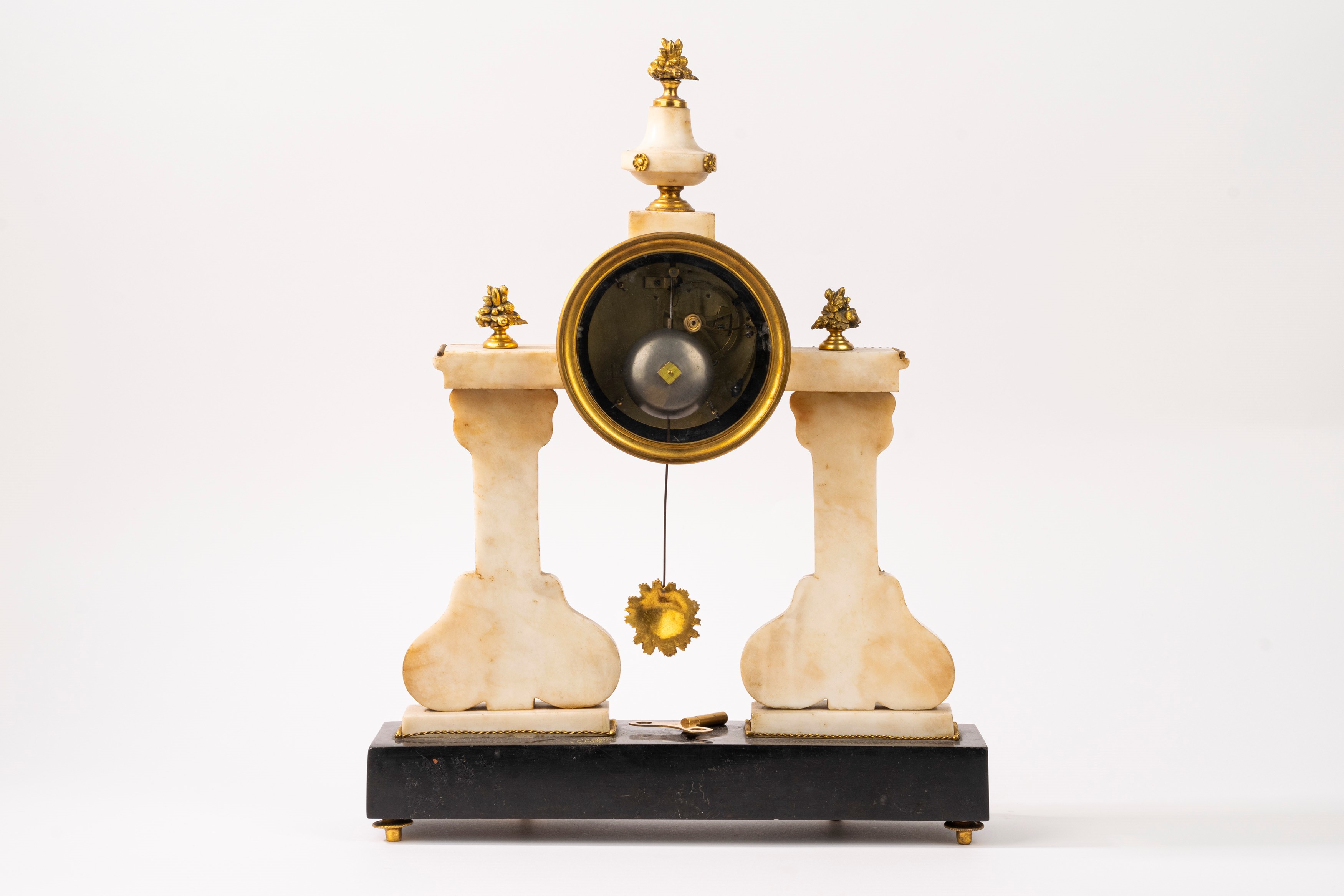 poggiante su base rettangolare in marmo nero, applicazioni in bronzo dorato e cammei in bisquit, quadrante in smalto bianco a numeri arabi