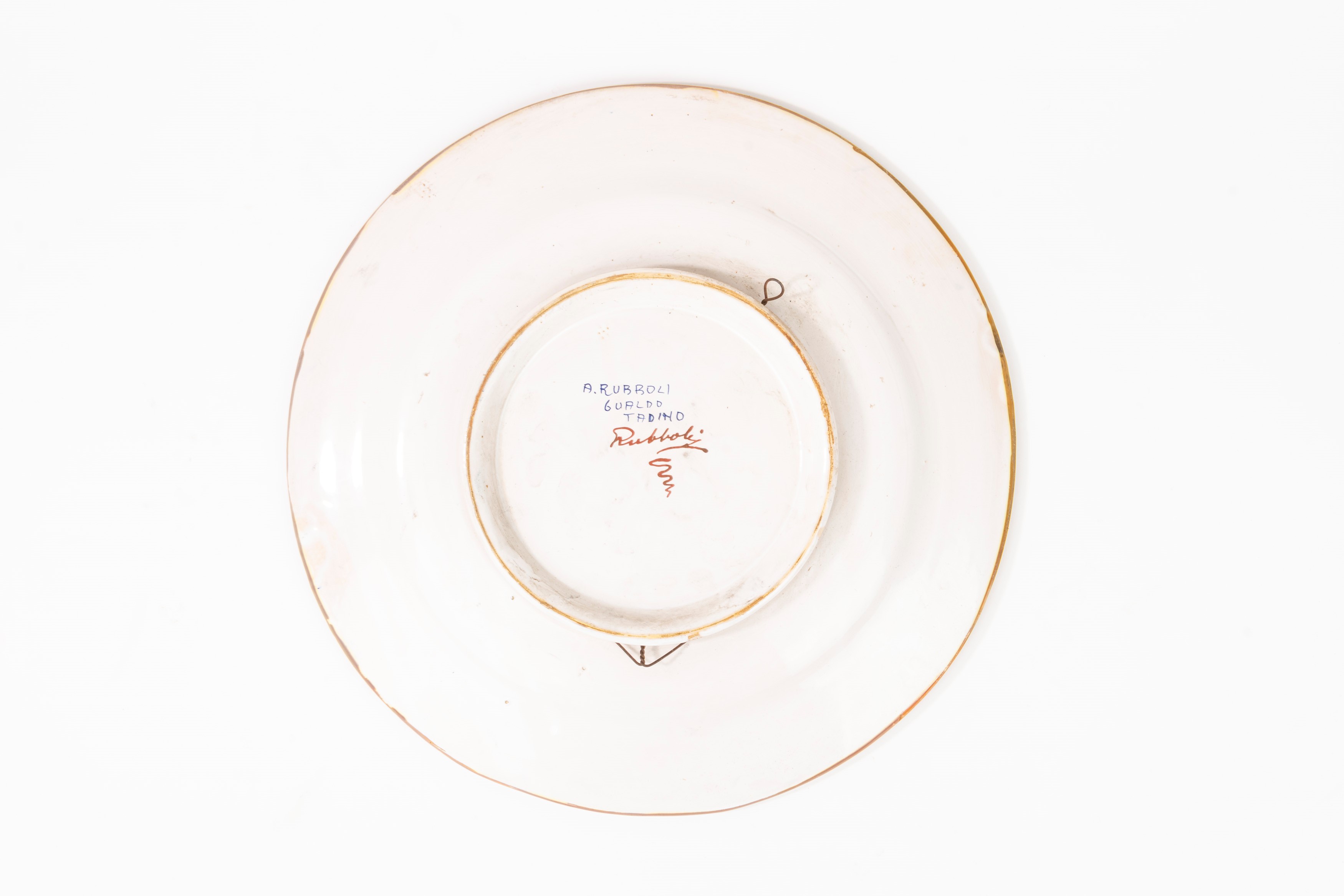 il cavetto decorato a grottesche con mascherone di satiro, la tesa a quartieri con motivo a embricazioni a occhio di penna di pavone alternato a girali di foglie e fiori. Al retro firmato A. Rubboli Gualdo Tadino in blu, Rubboli a lustro