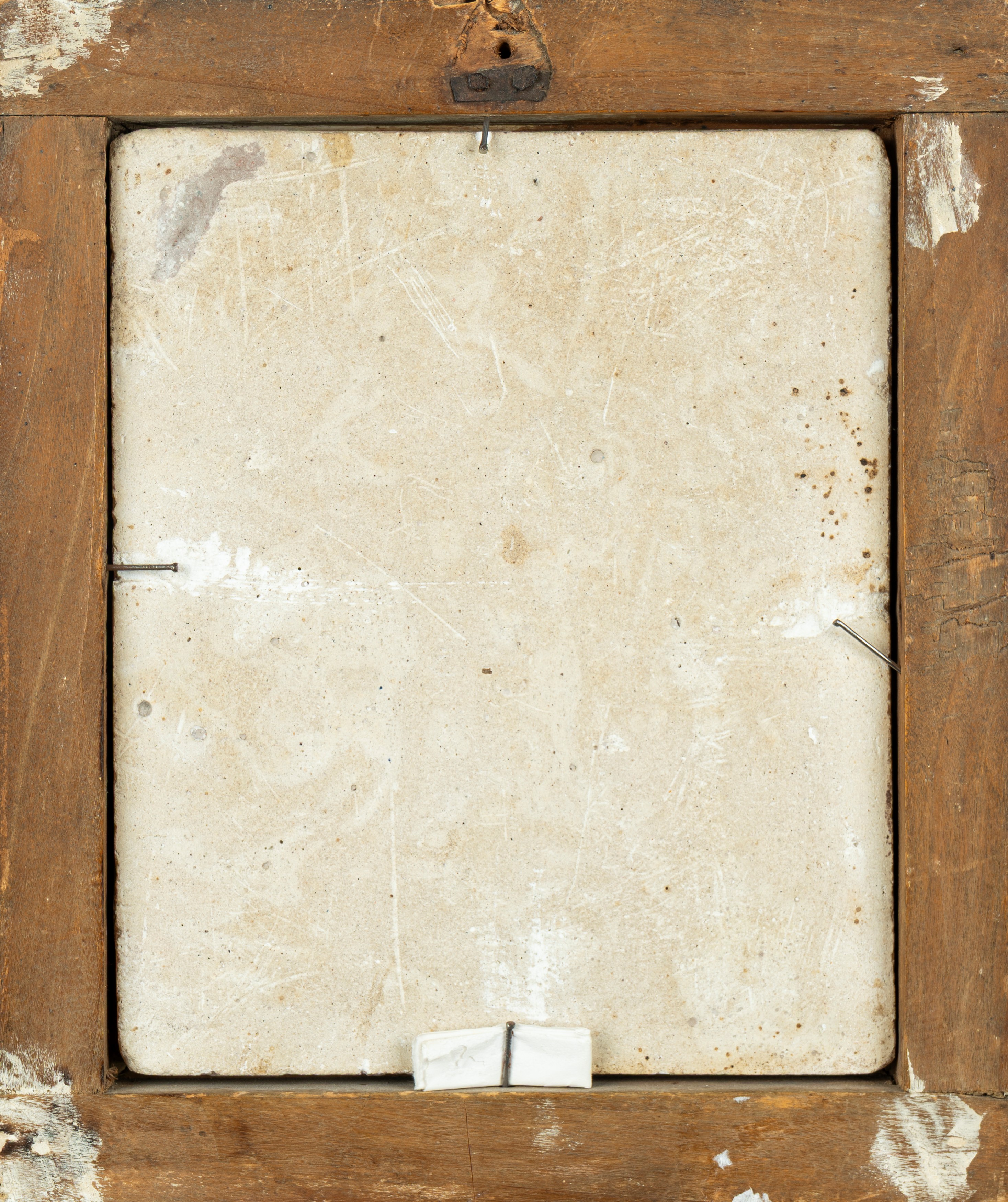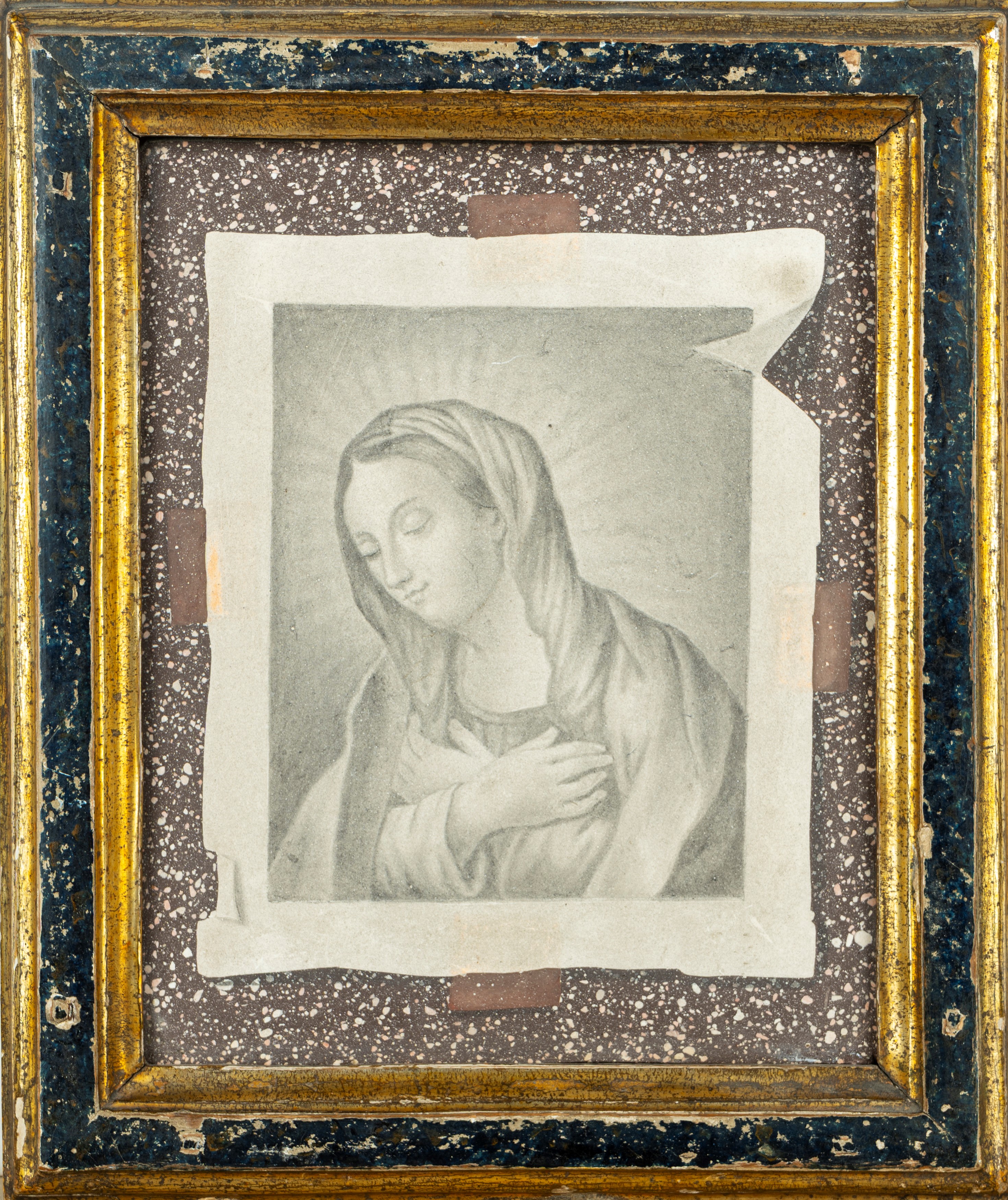 trompe-l'oeil con stampa raffigurante Madonna orante, entro antica cornice in legno laccato e dorato