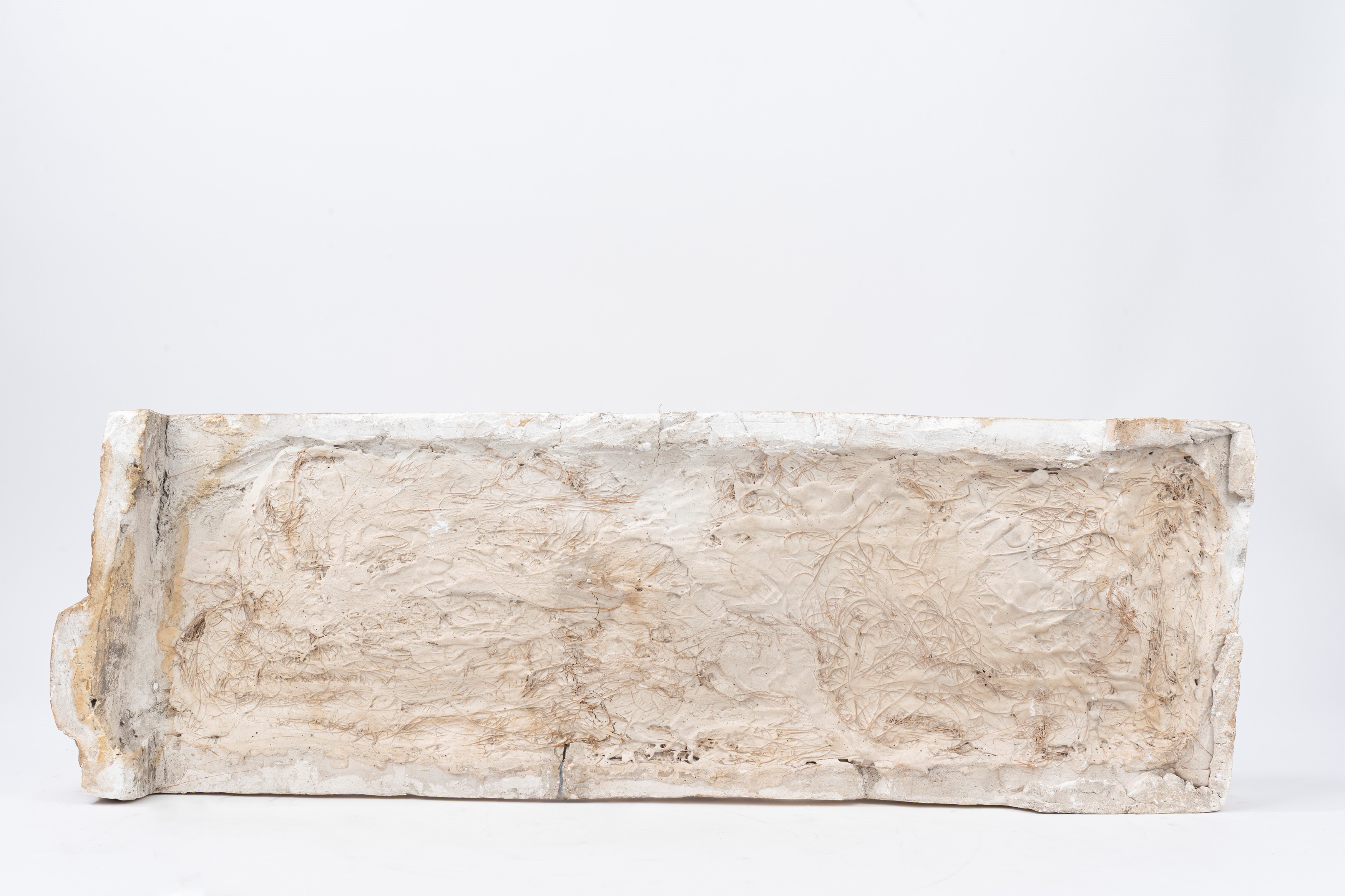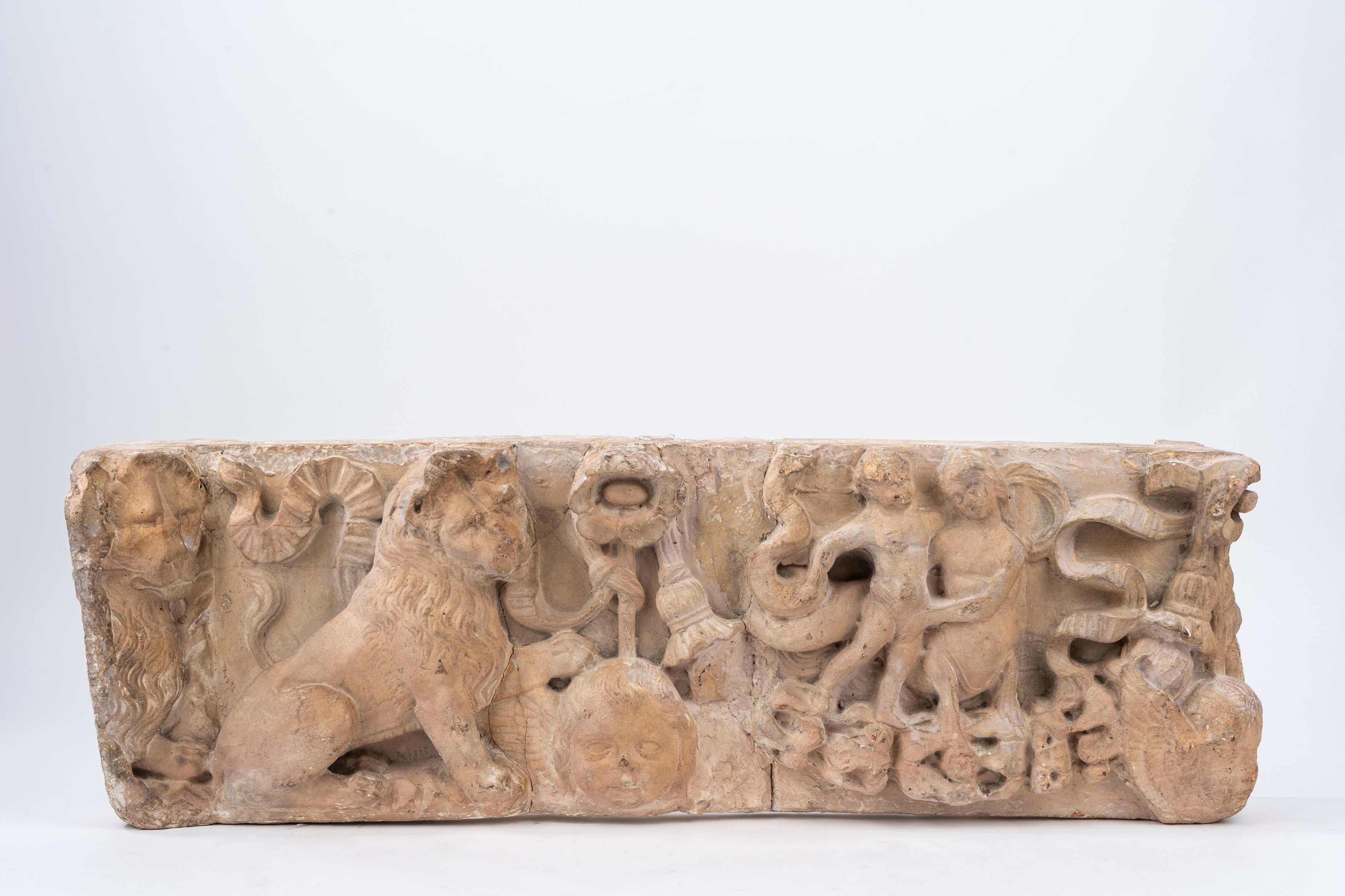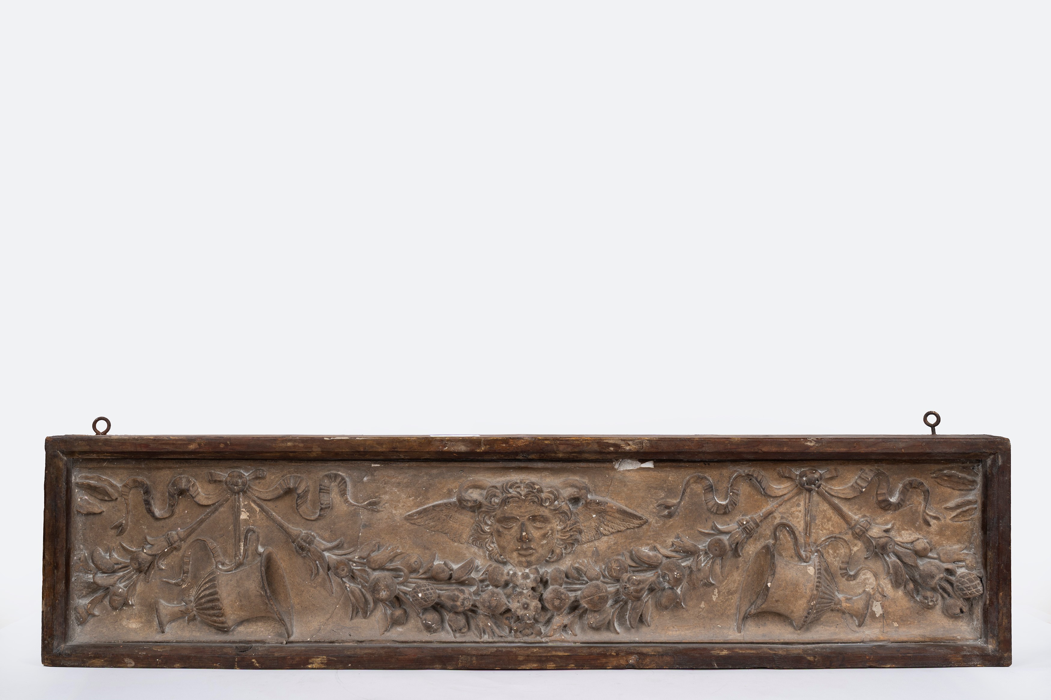 Bassorilievo raffigurante fregio architettonico con testa di Medusa e festone di frutta, montato su telaio ligneo, e fregio architettonico con leoni e tritoni