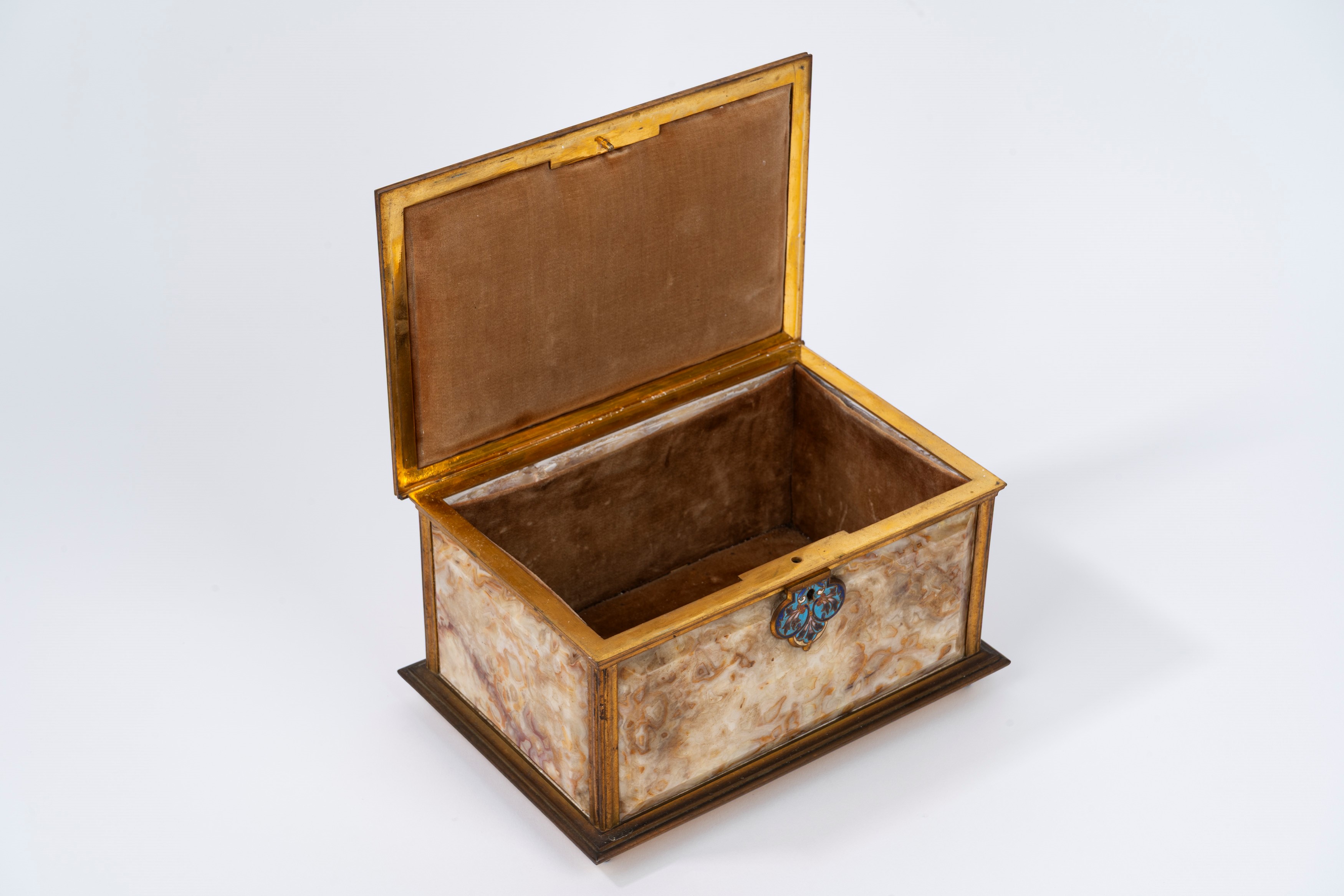 struttura in bronzo dorato con placche in onice su tutti i lati e dettagli in smalti policromi agli angoli