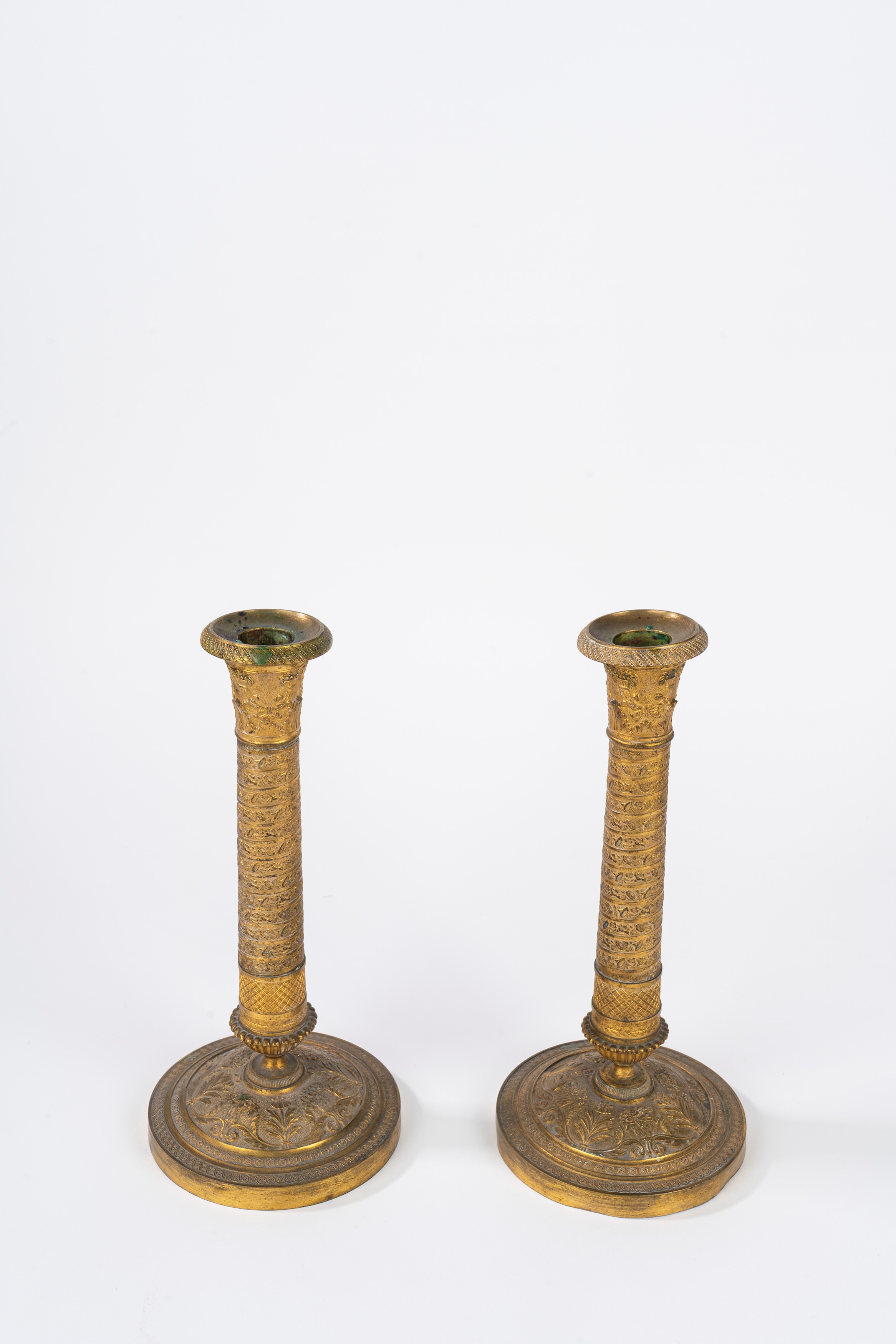 Coppia di candelieri Impero in bronzo dorato a colonna coclide, secolo XIX