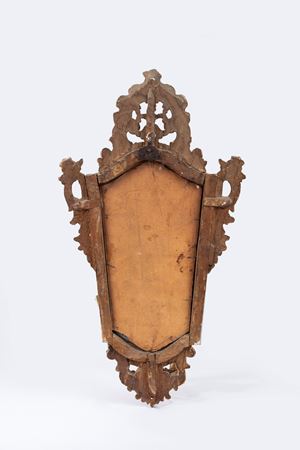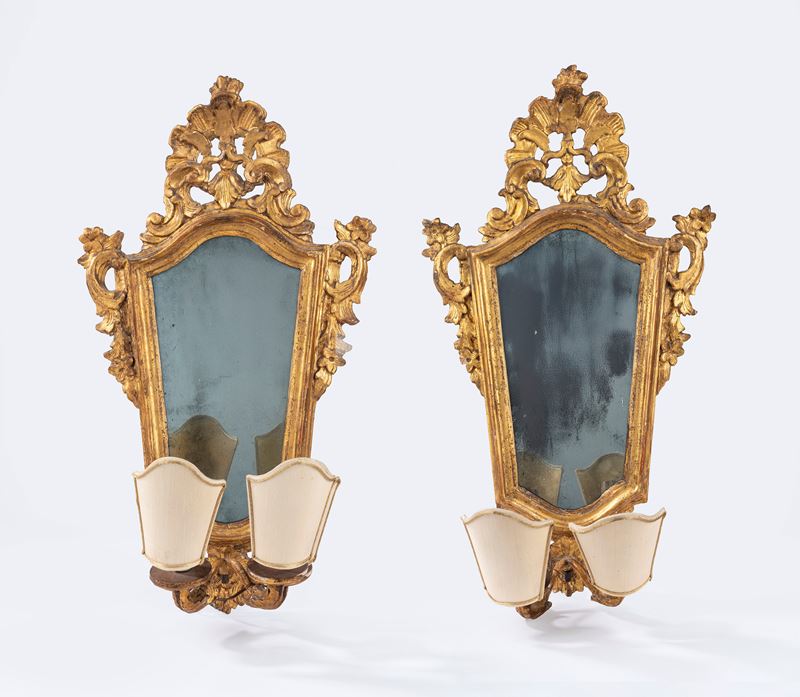 Coppia di specchiere a ventolina in legno intagliato e dorato, secolo XIX