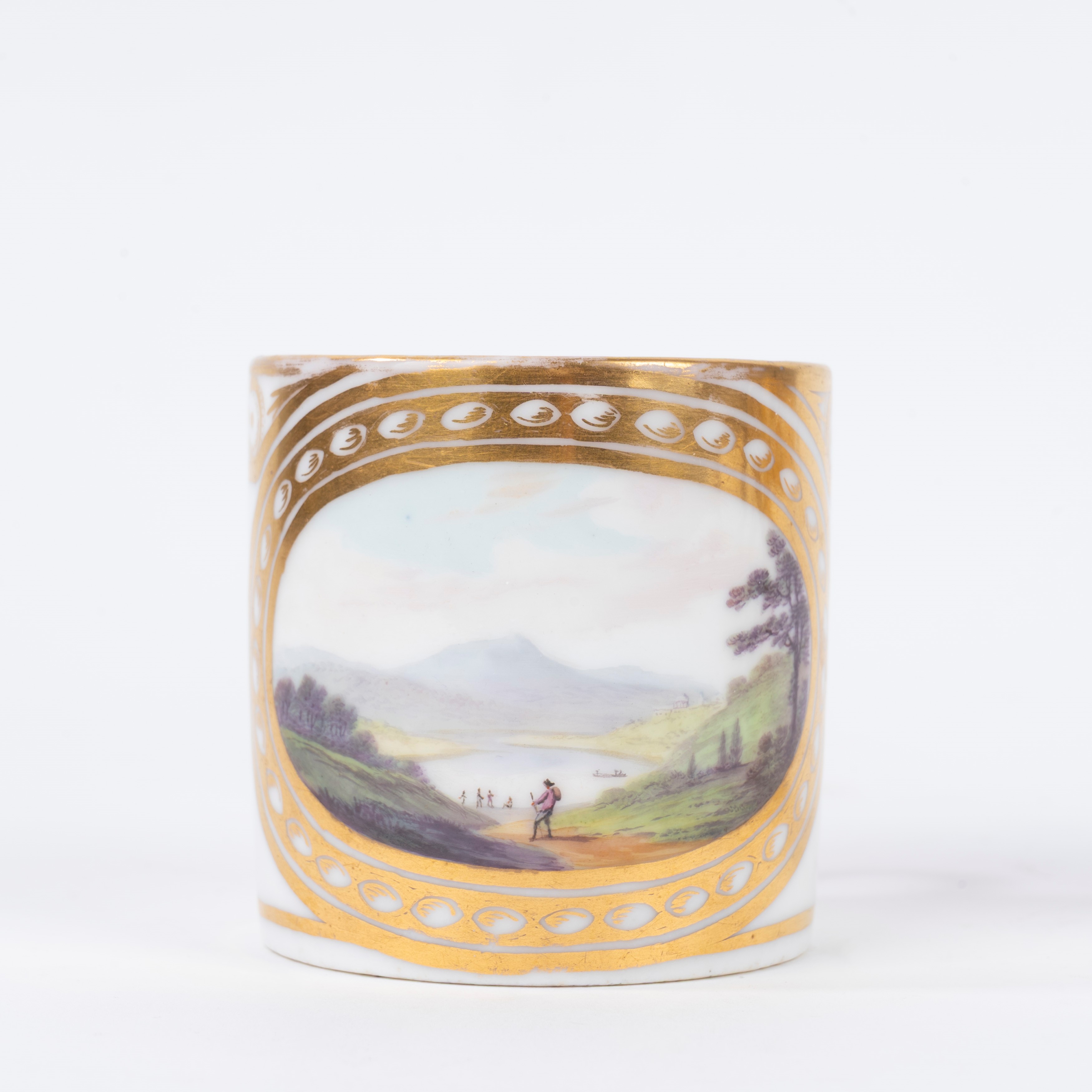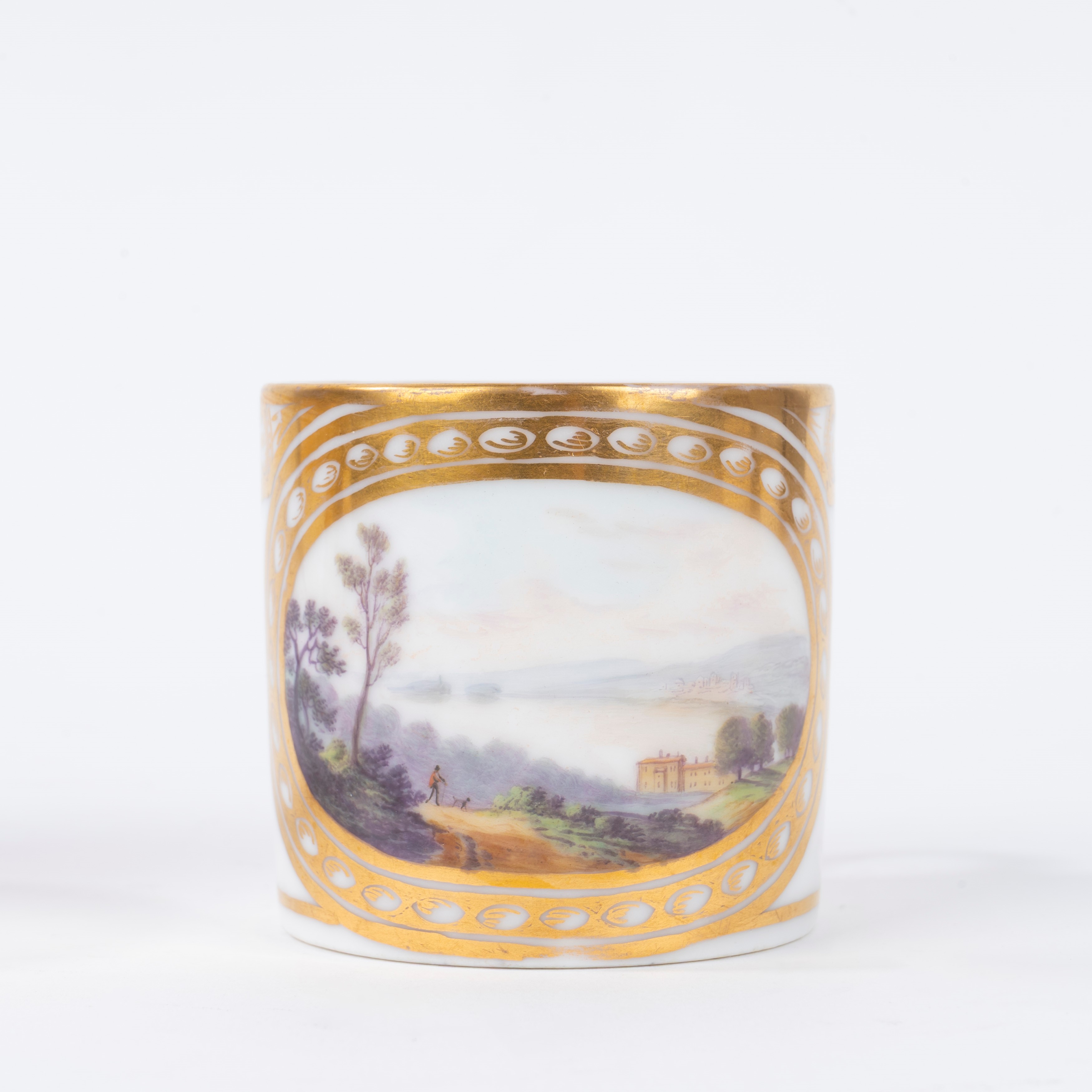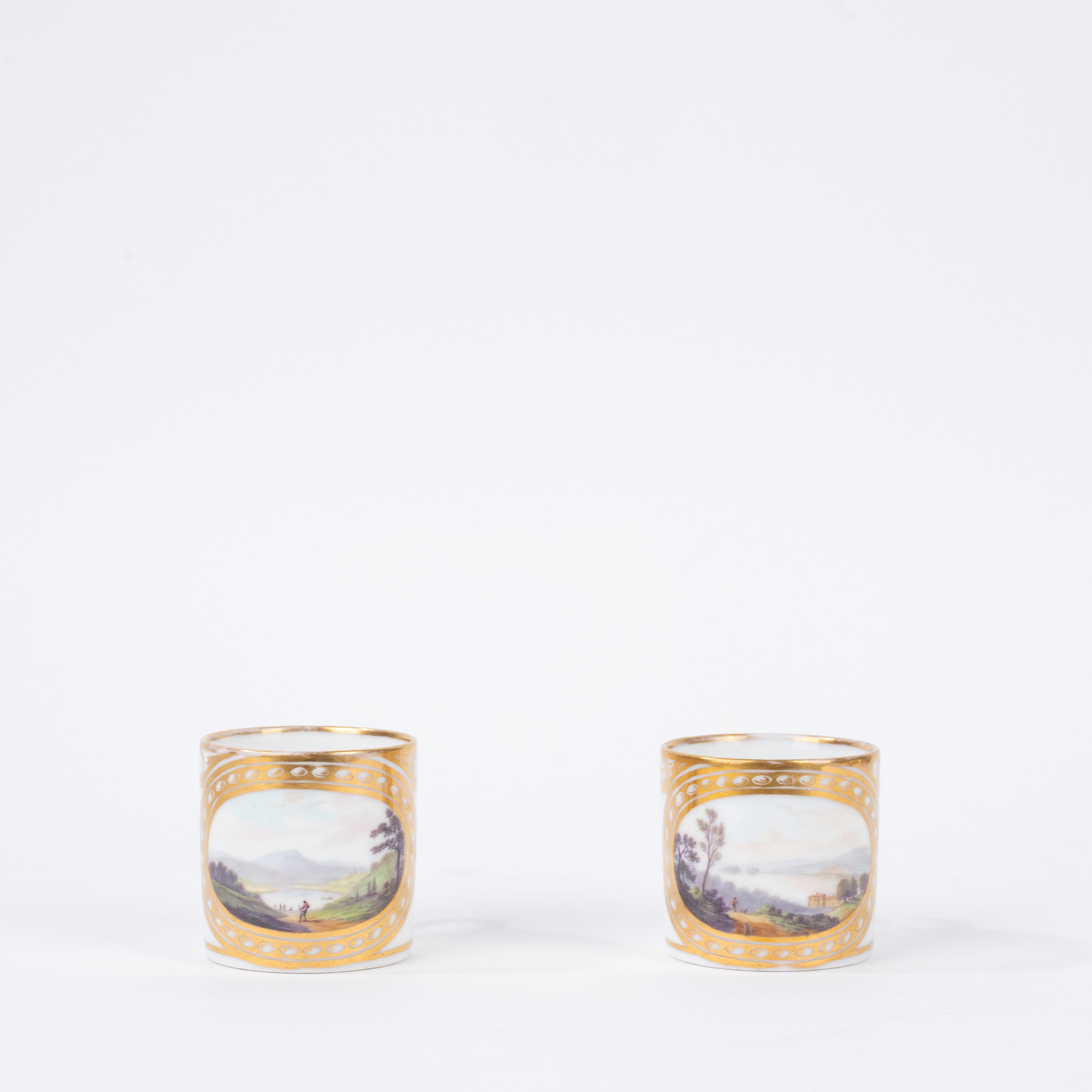 Coppia di tazzine in porcellana policroma con piattino, decorate con paesaggi, Francia secolo XIX