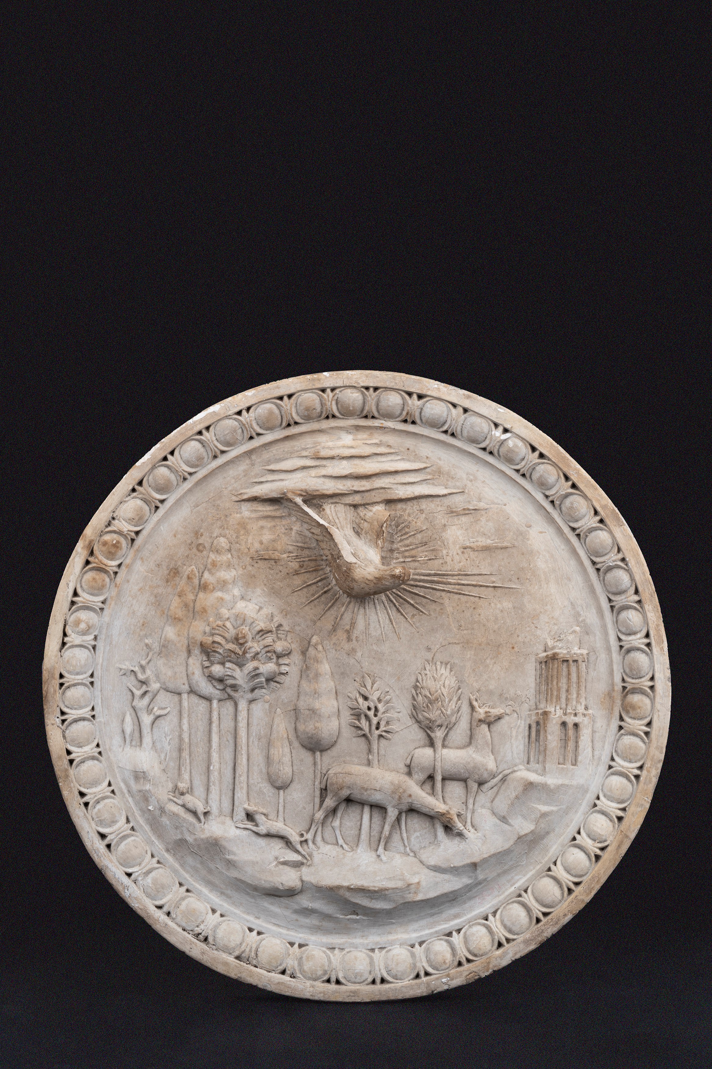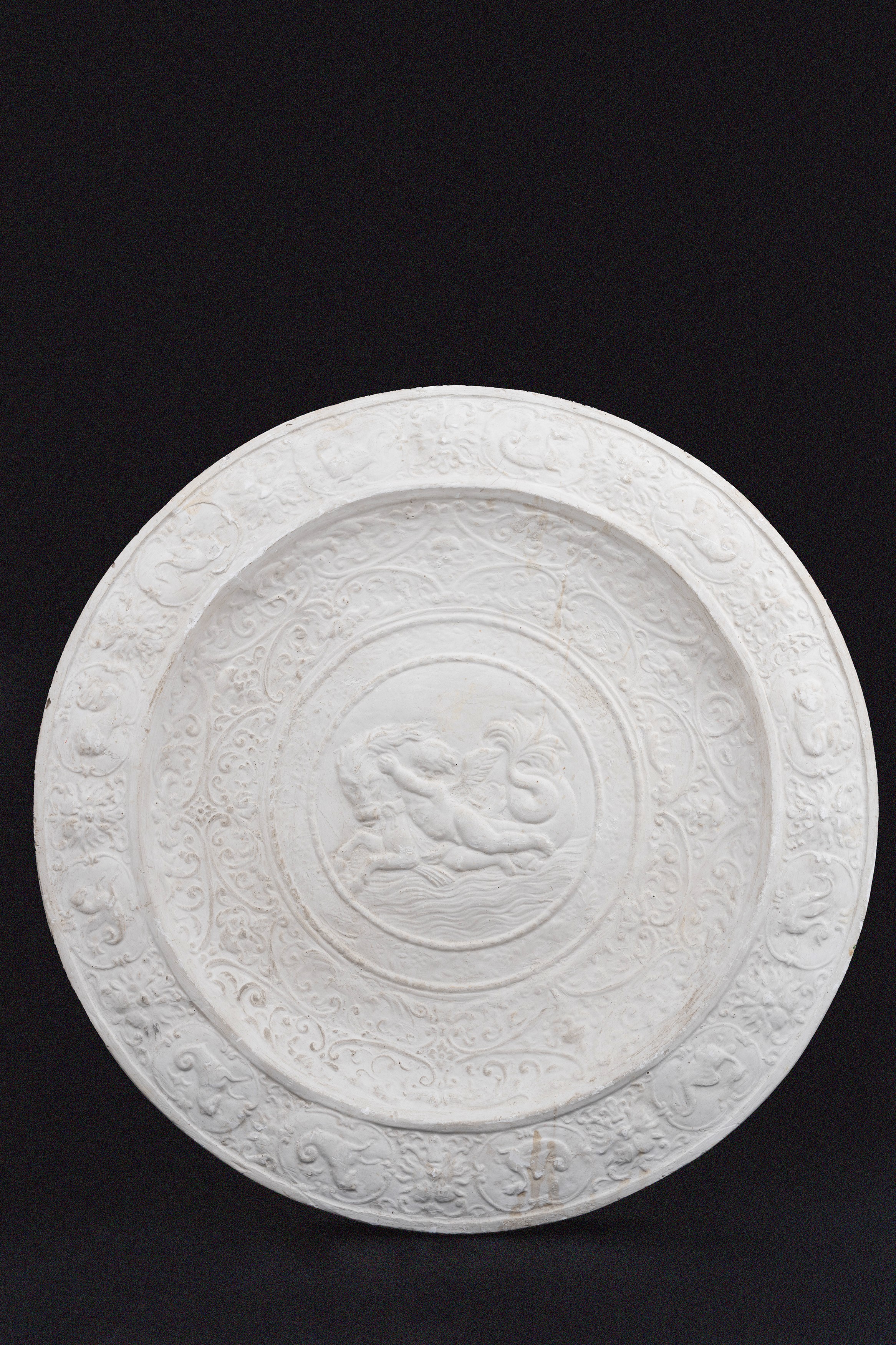 Coppia di tondi a bassorilievo in gesso, uno raffigurante il Paradiso Terrestre, dalla Basilica di S. Maria del Popolo a Roma, l'altro con putto a cavallo di un tritone