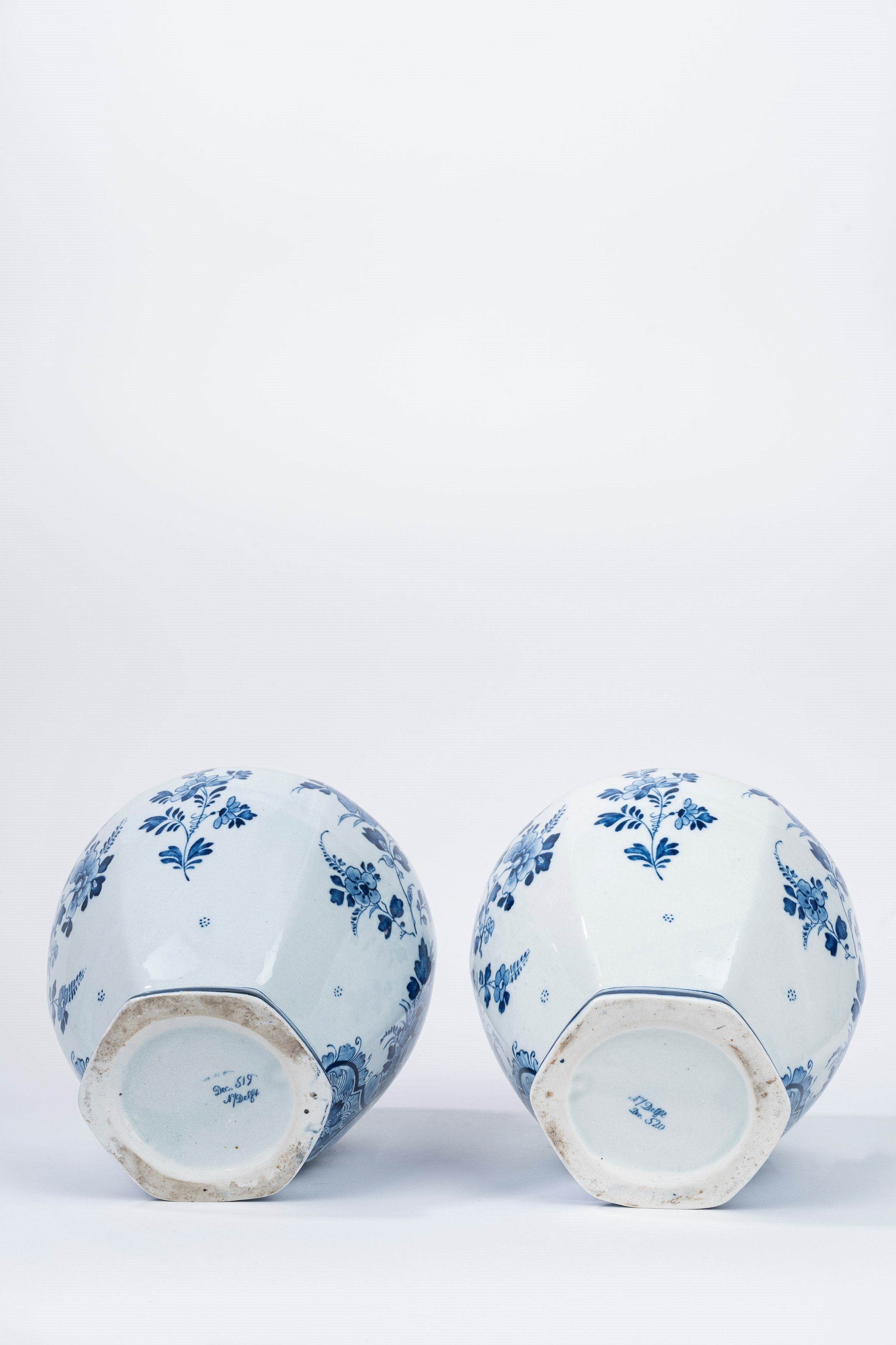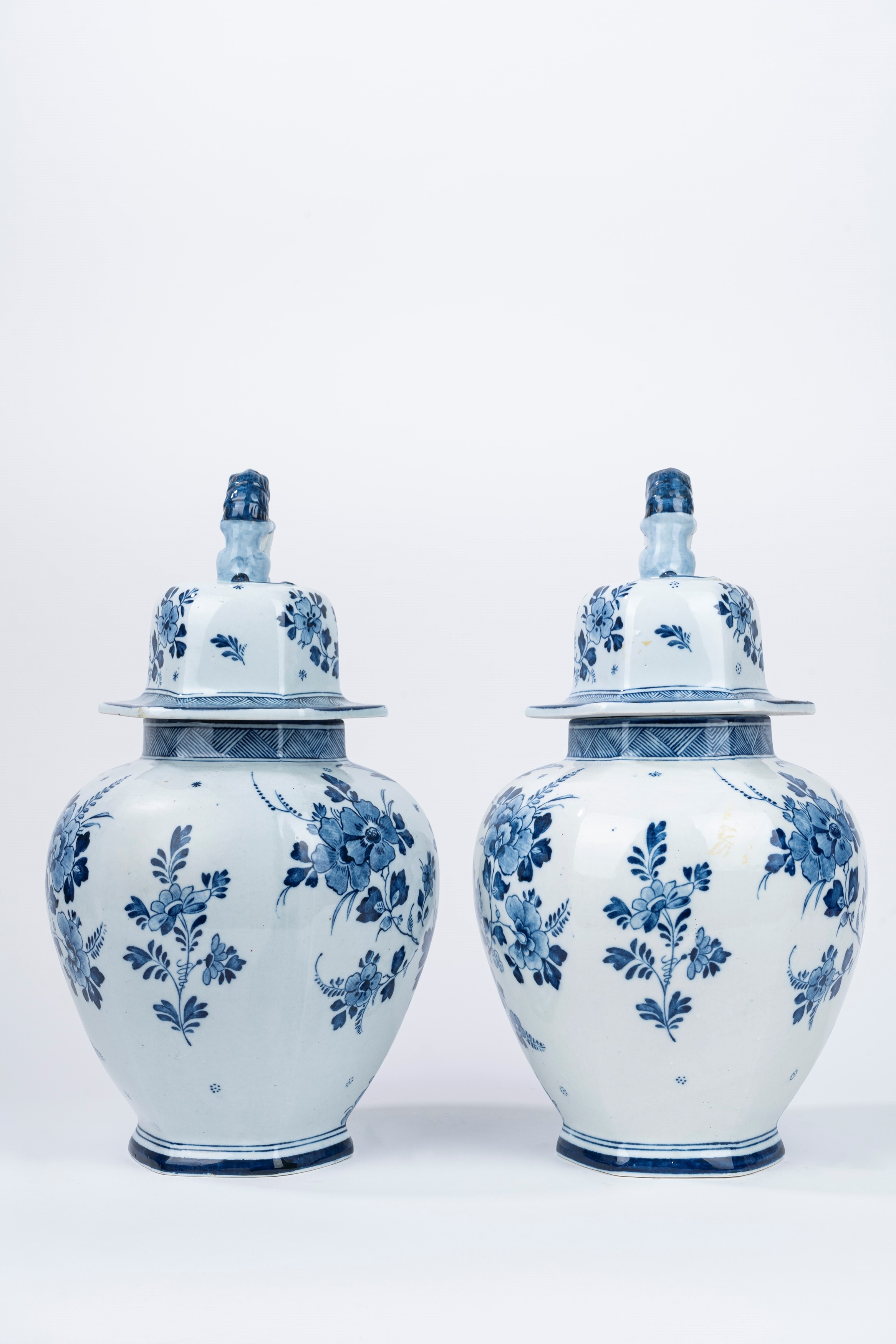 in maiolica bianca e blu, decorati con motivi floreali e paesaggi fluviali entro riserve, con coperchi e presa a forma di leone