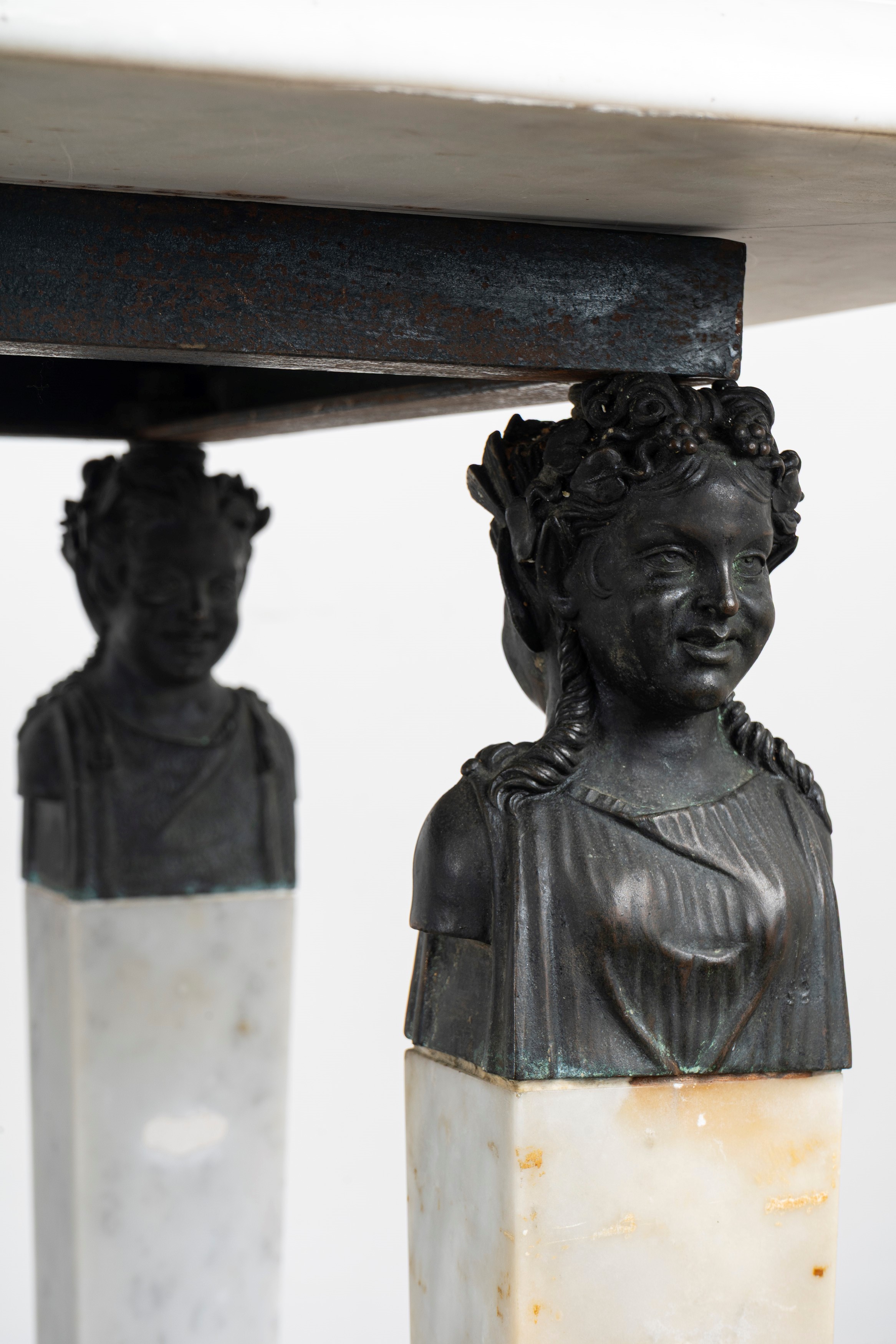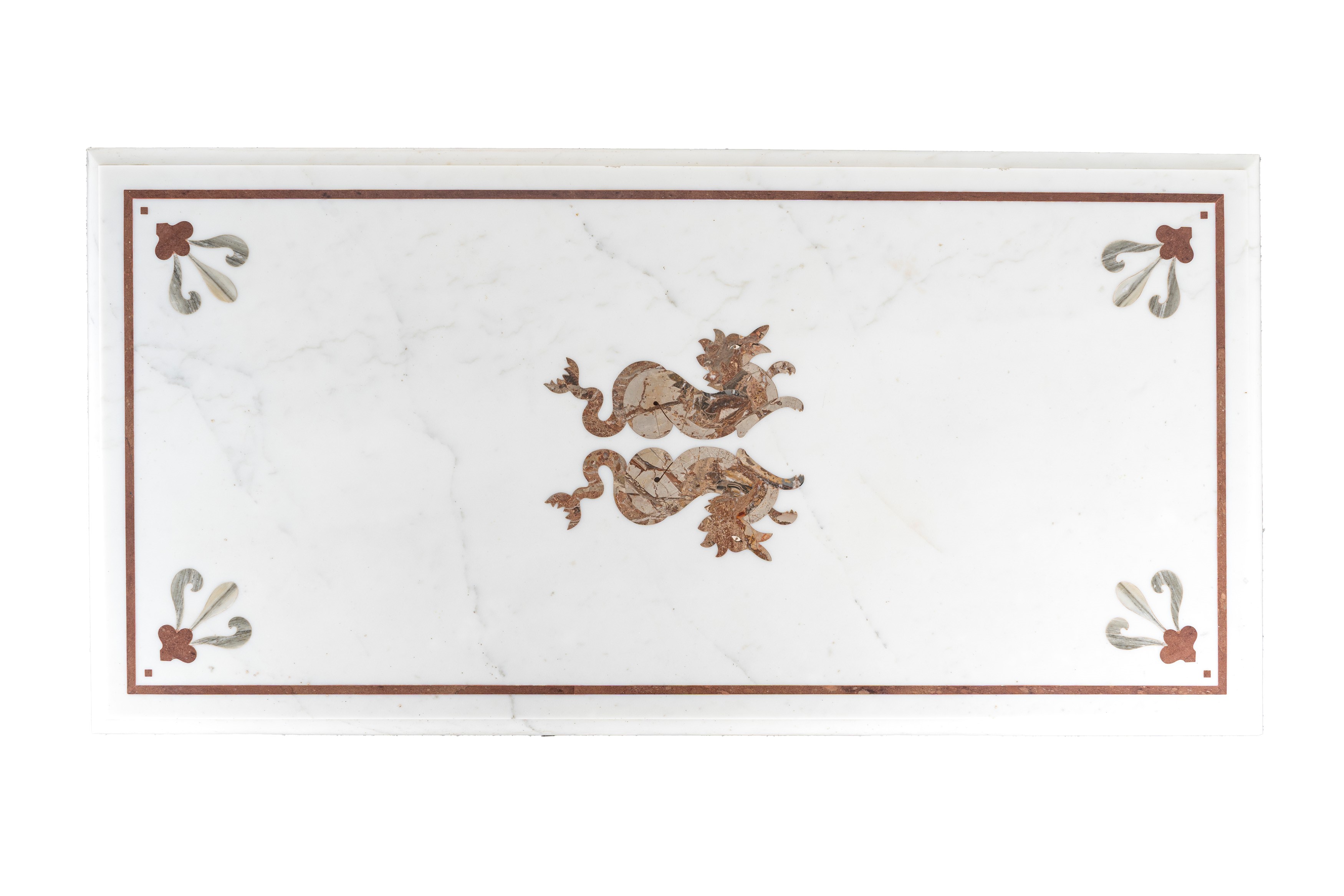 piano in marmo bianco intarsiato al centro con marmi colorati a raffigurare due tritoni e quattro gigli agli angoli, gambe in marmo bianco e terminali a guisa di erme bicipiti in bronzo e piedini in bronzo