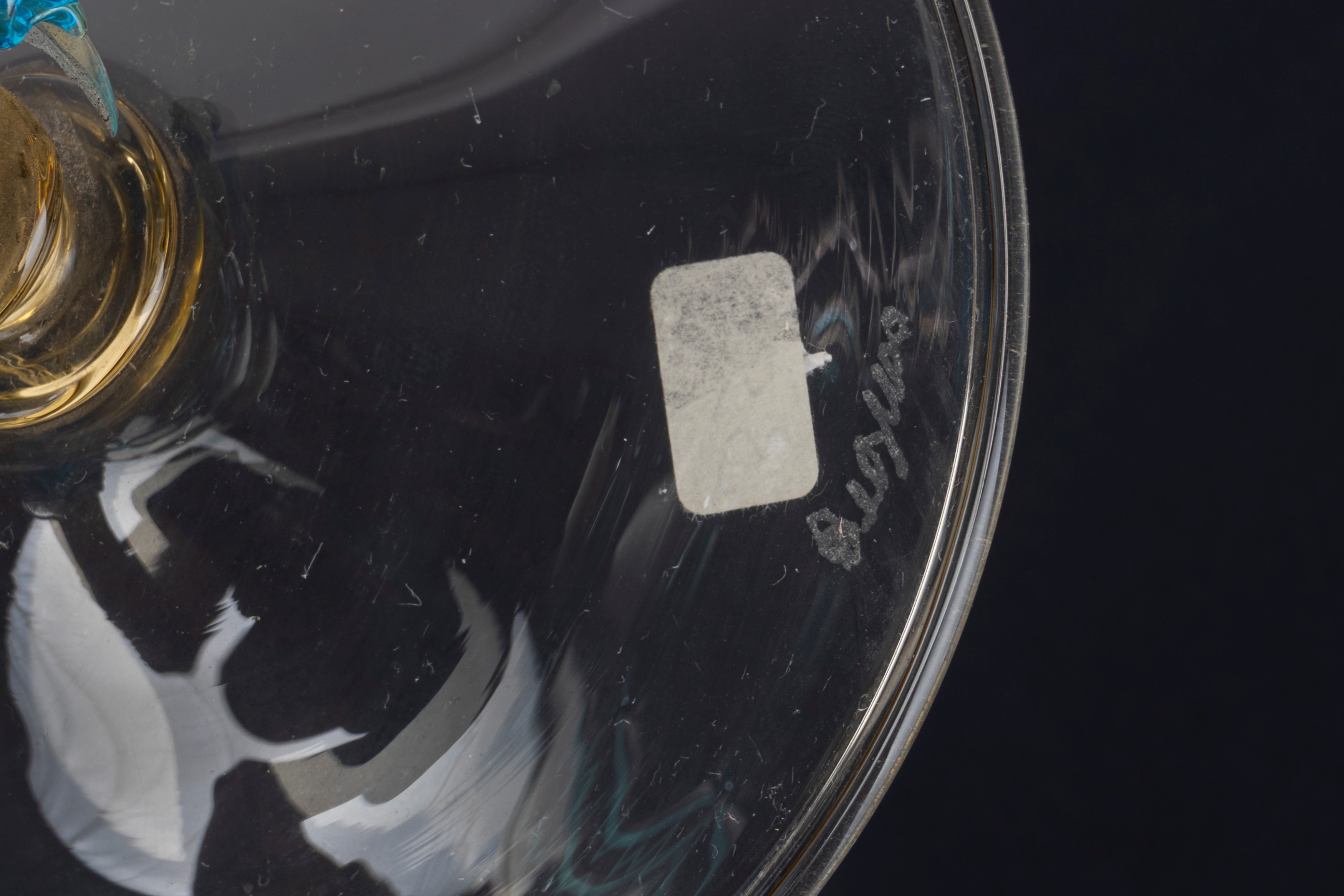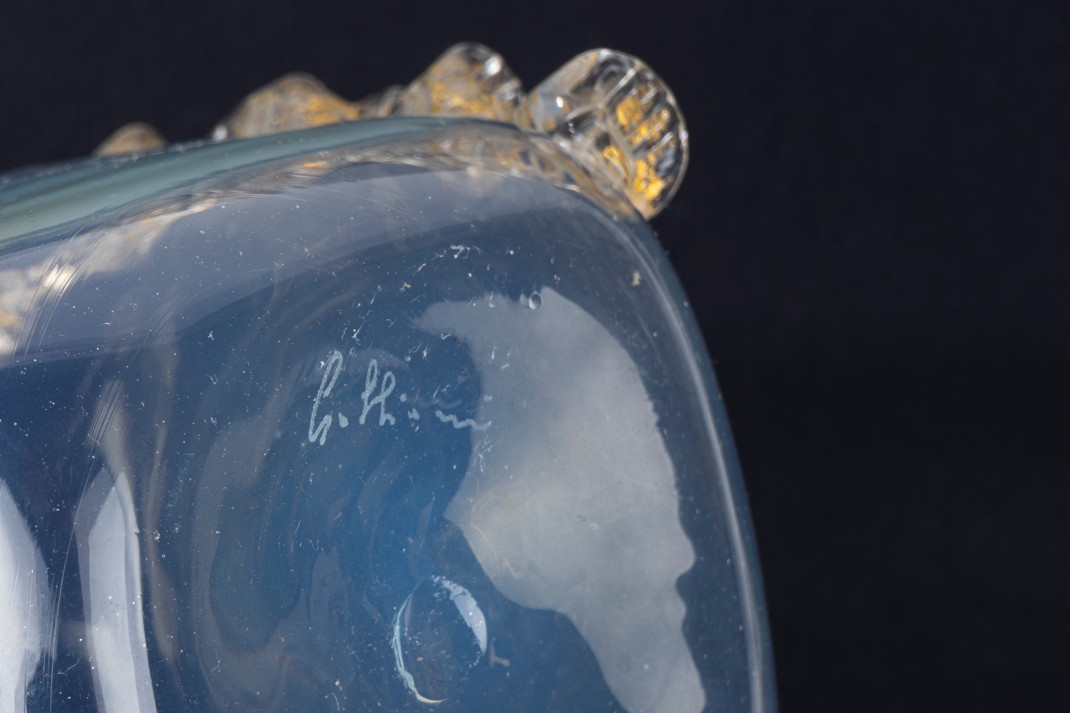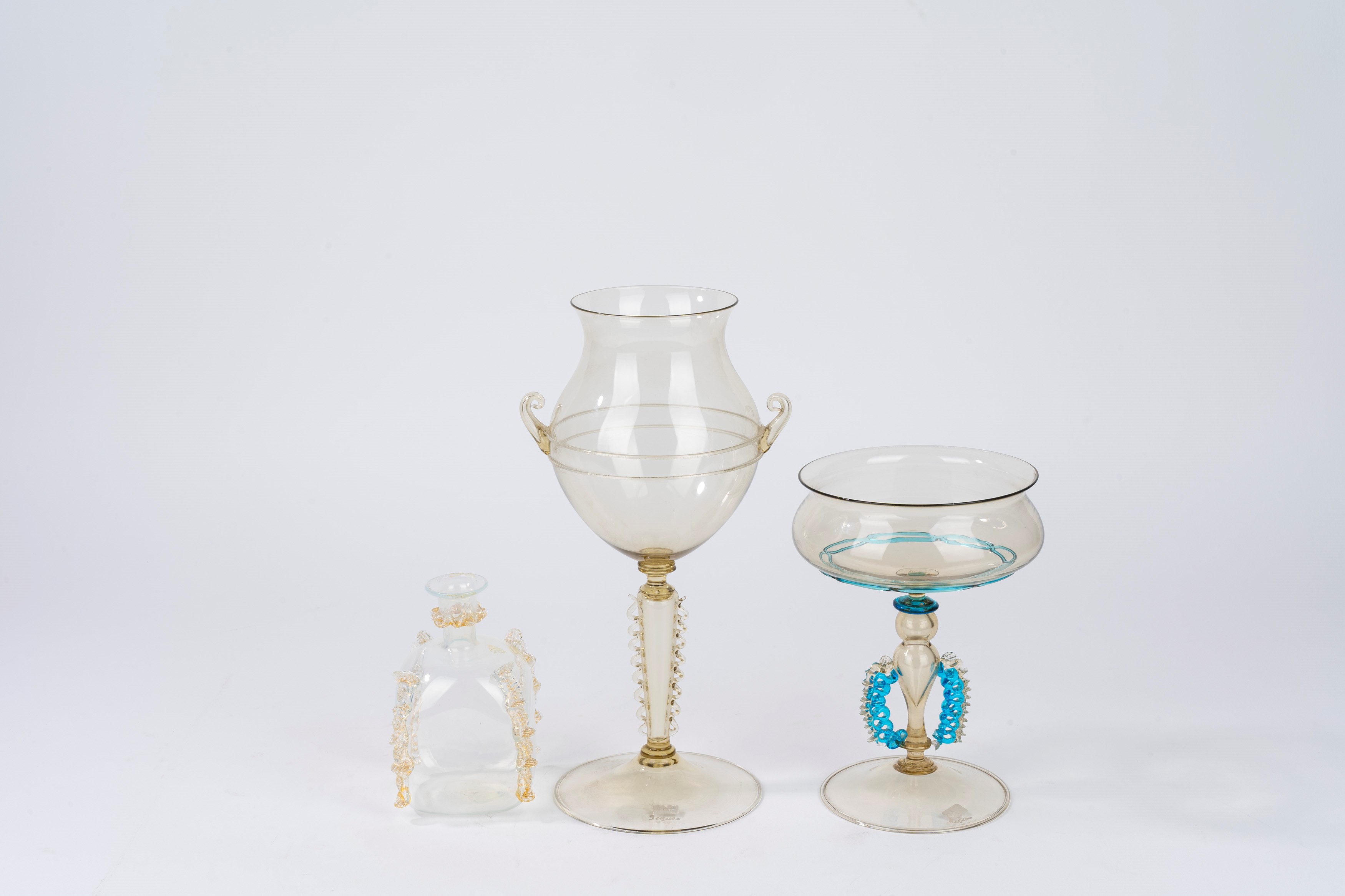 Lotto composto da due bicchieri in vetro di Murano, firmati Seguso, e un flaconcino