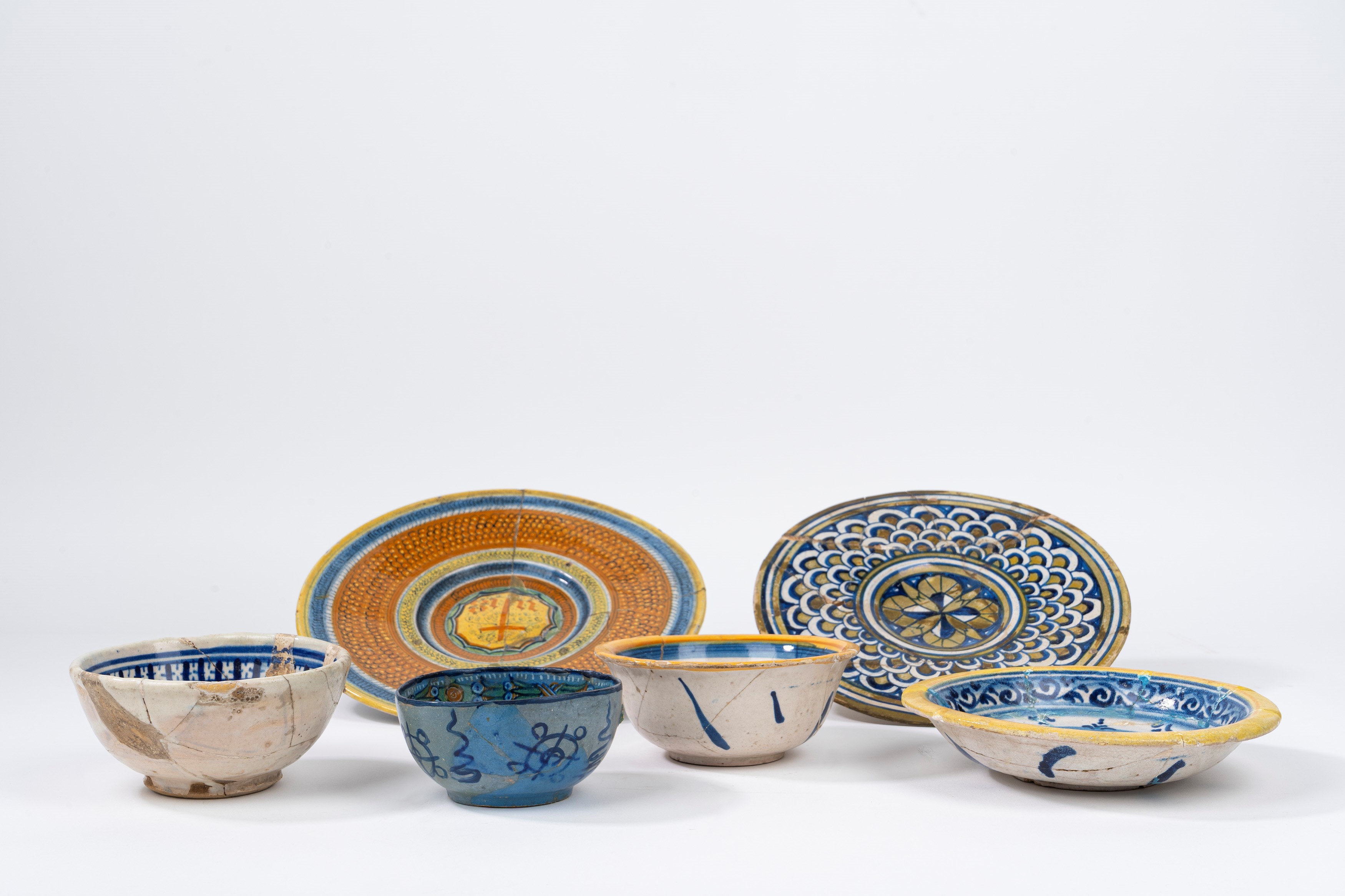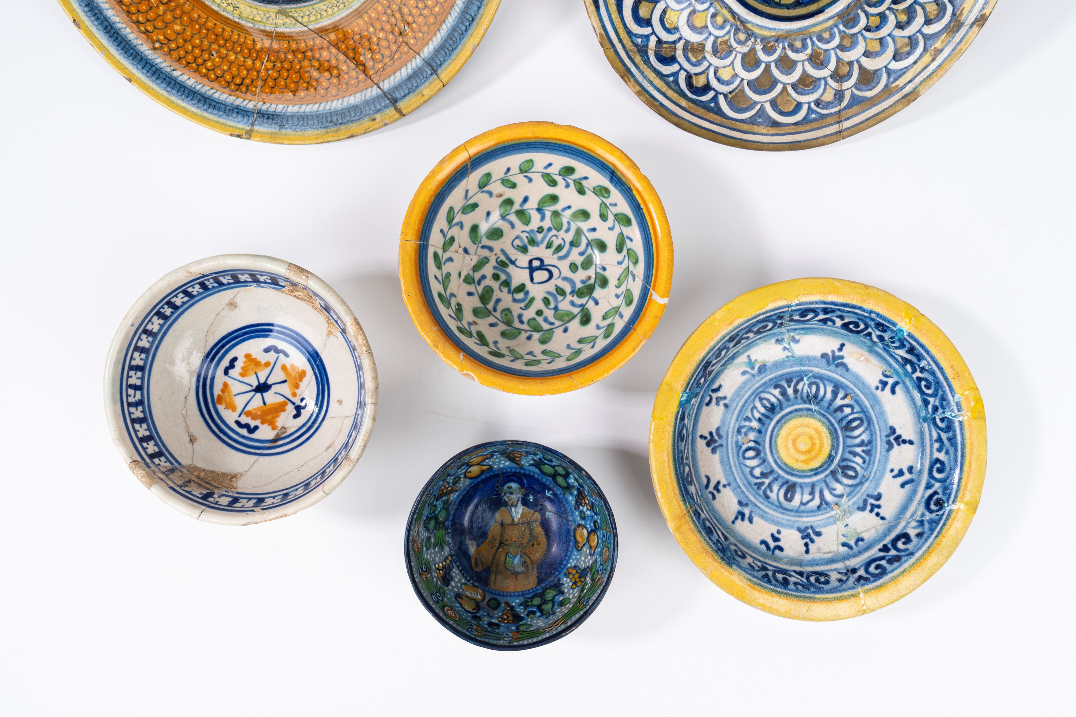 Lotto composto da due tondini, un vassoietto e tre ciotole, Manifatture differenti dell'Italia centrale (Faenza e Deruta)