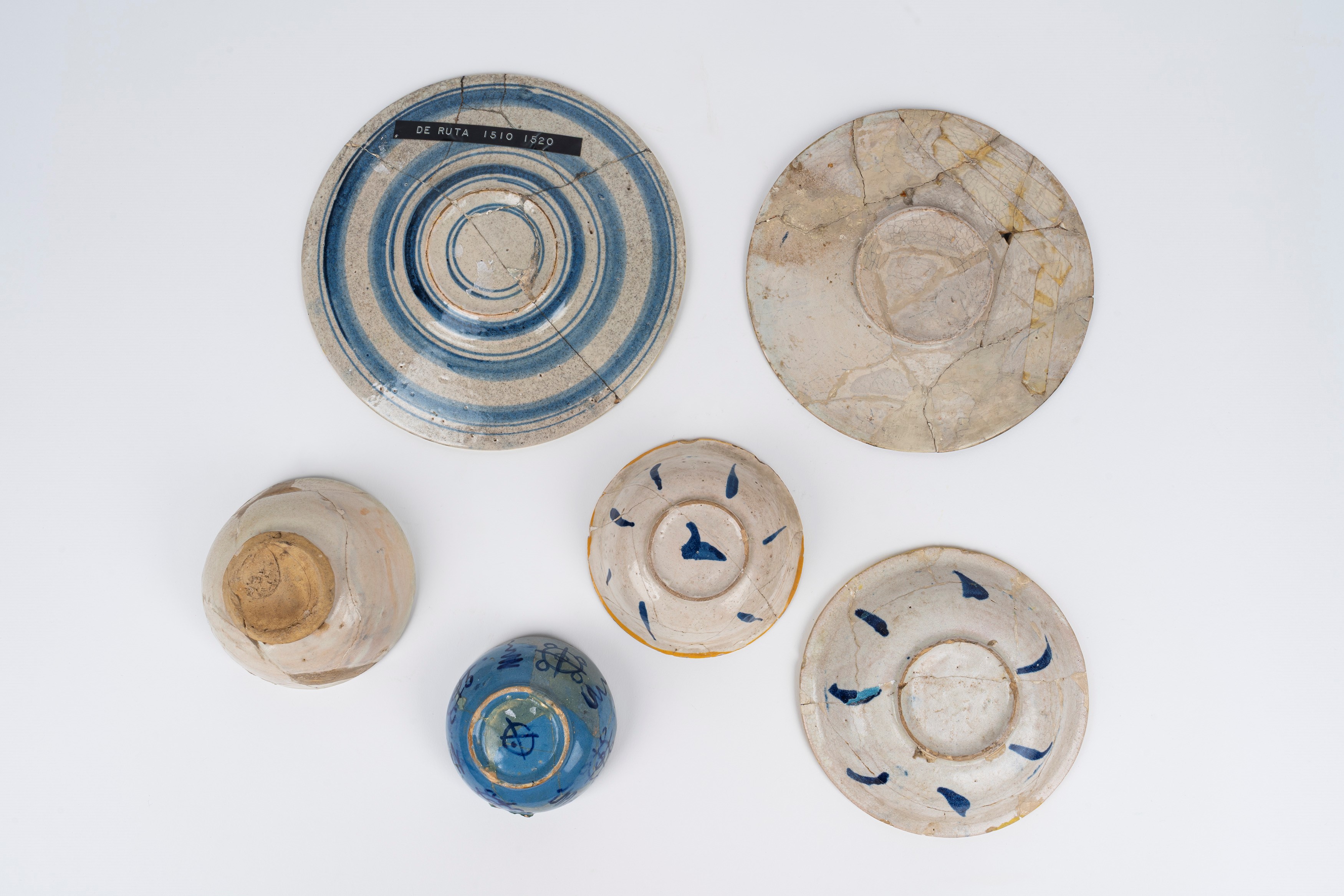 in maiolica policroma a gran fuoco. Una ciotola a fondo berrettino, un tondino con decoro a lustro, l'altro centrato da trigramma bernardiano.