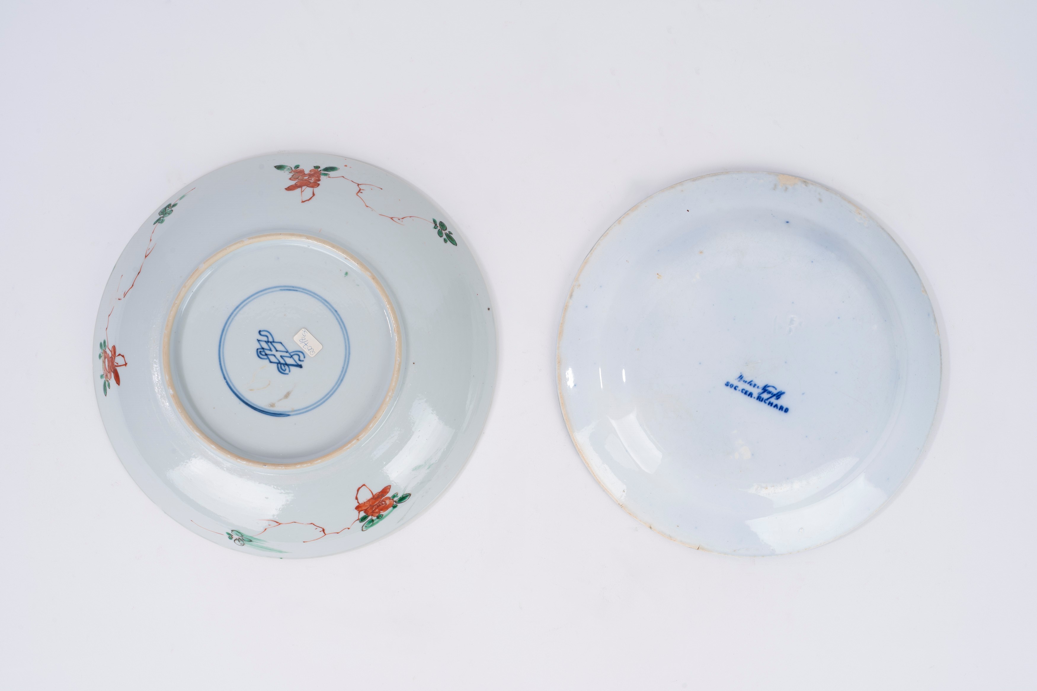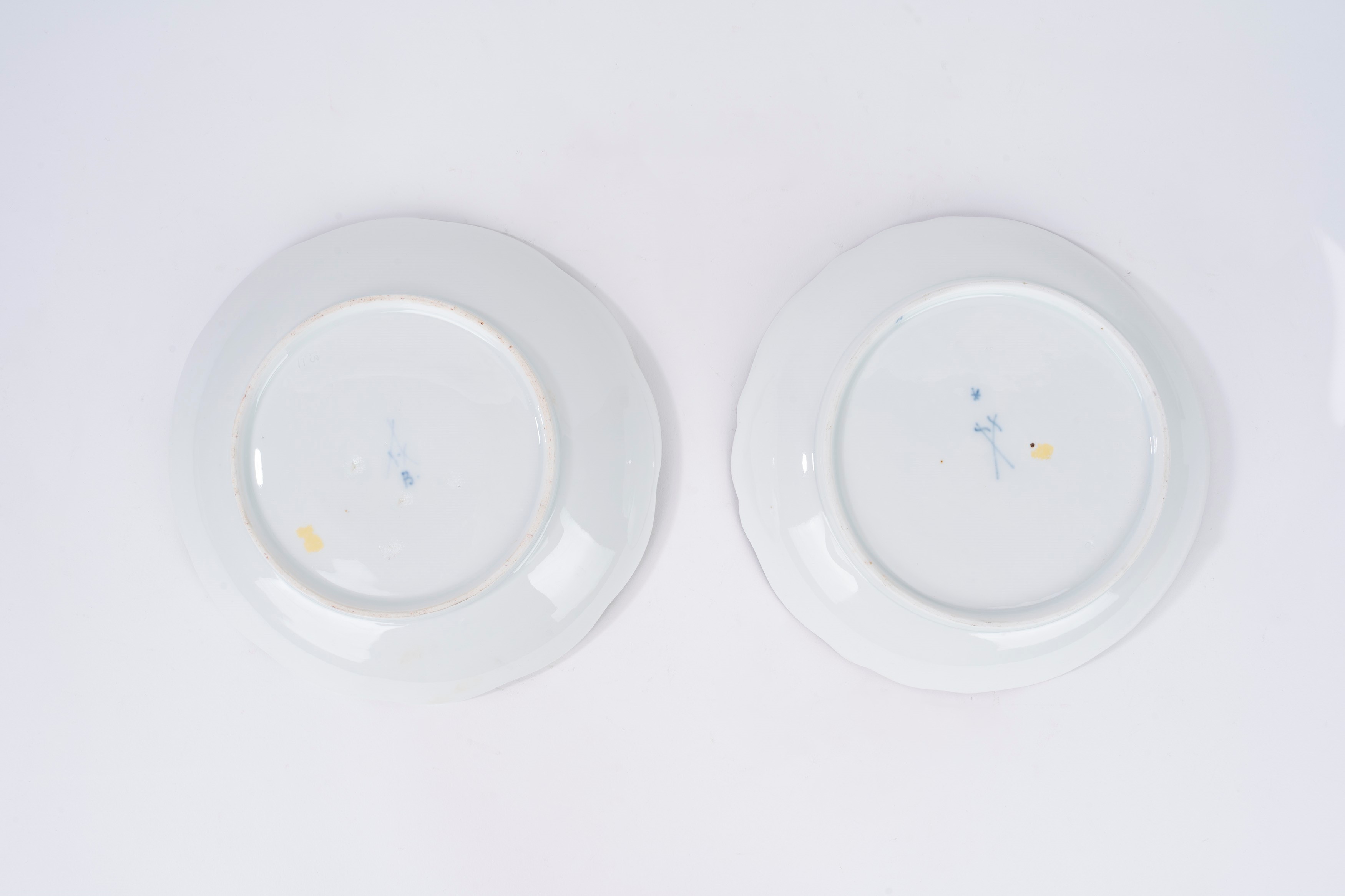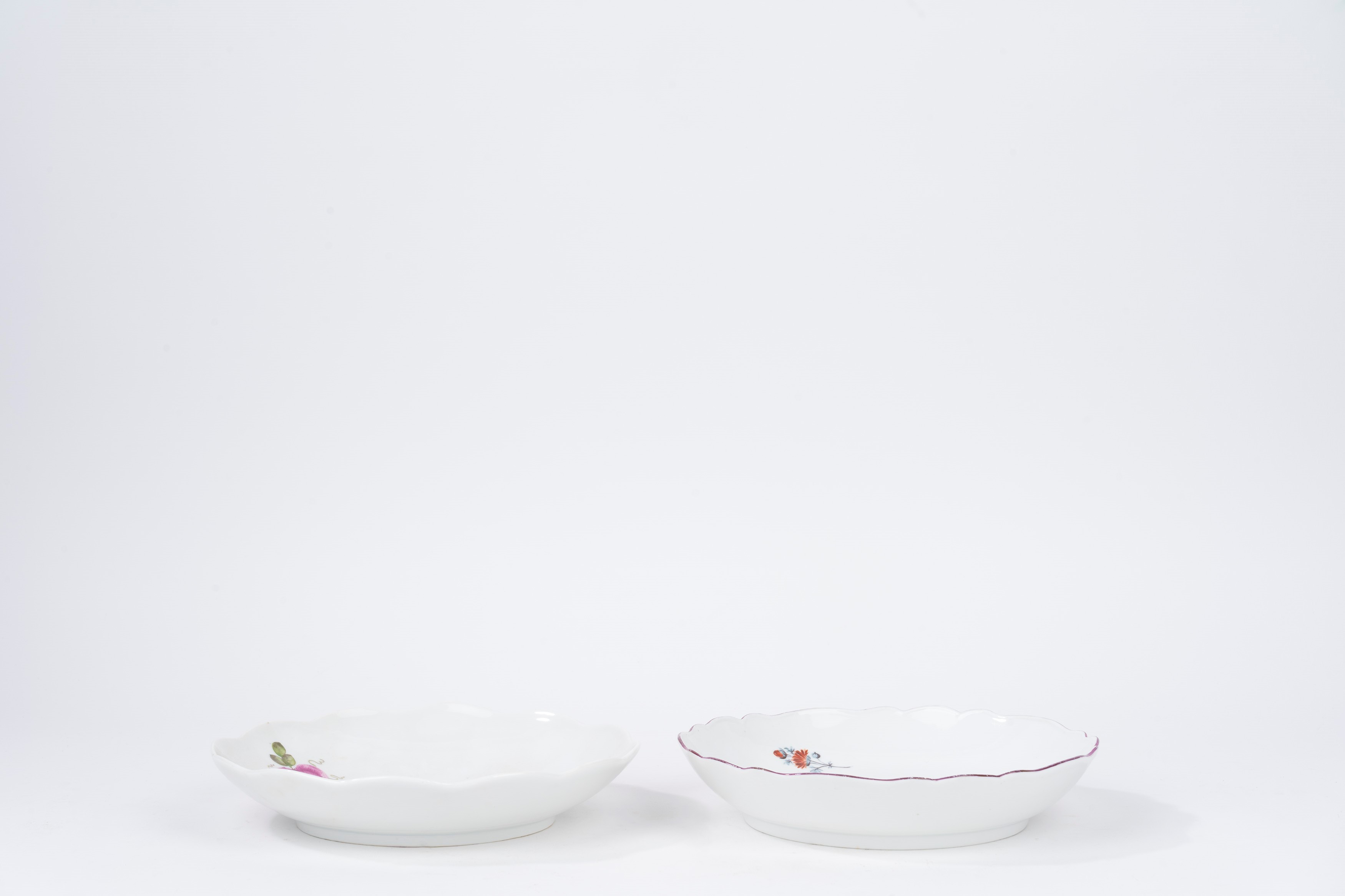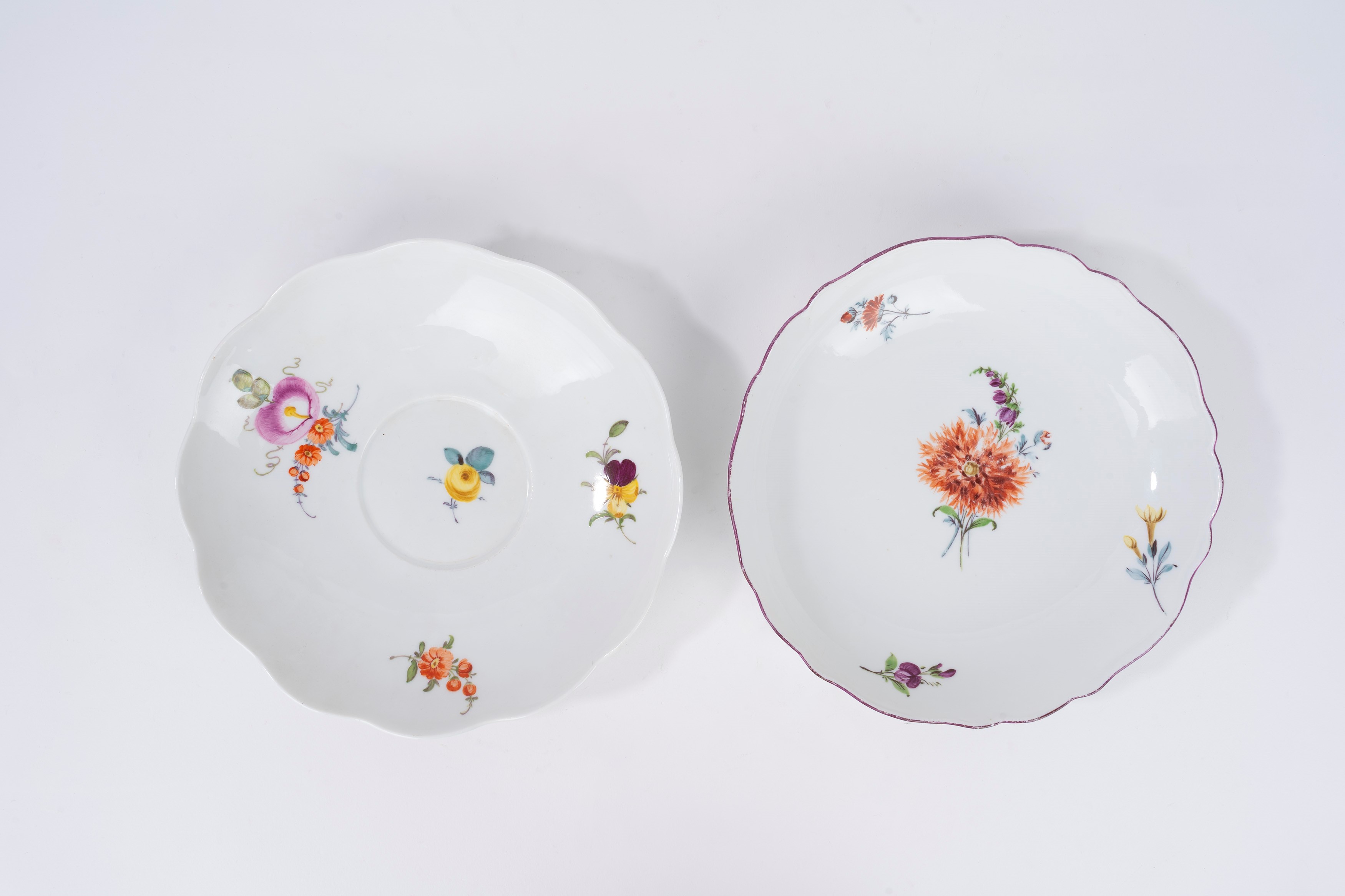 due piatti fondi con bordo polilobato, decorati a motivi floreali, manifattura di Meissen; uno cinese; uno bianco e blu a motivi floreali, manifattura Richard; due decorati con motivi floreali color porpora; due a motivi floreali su fondo bianco