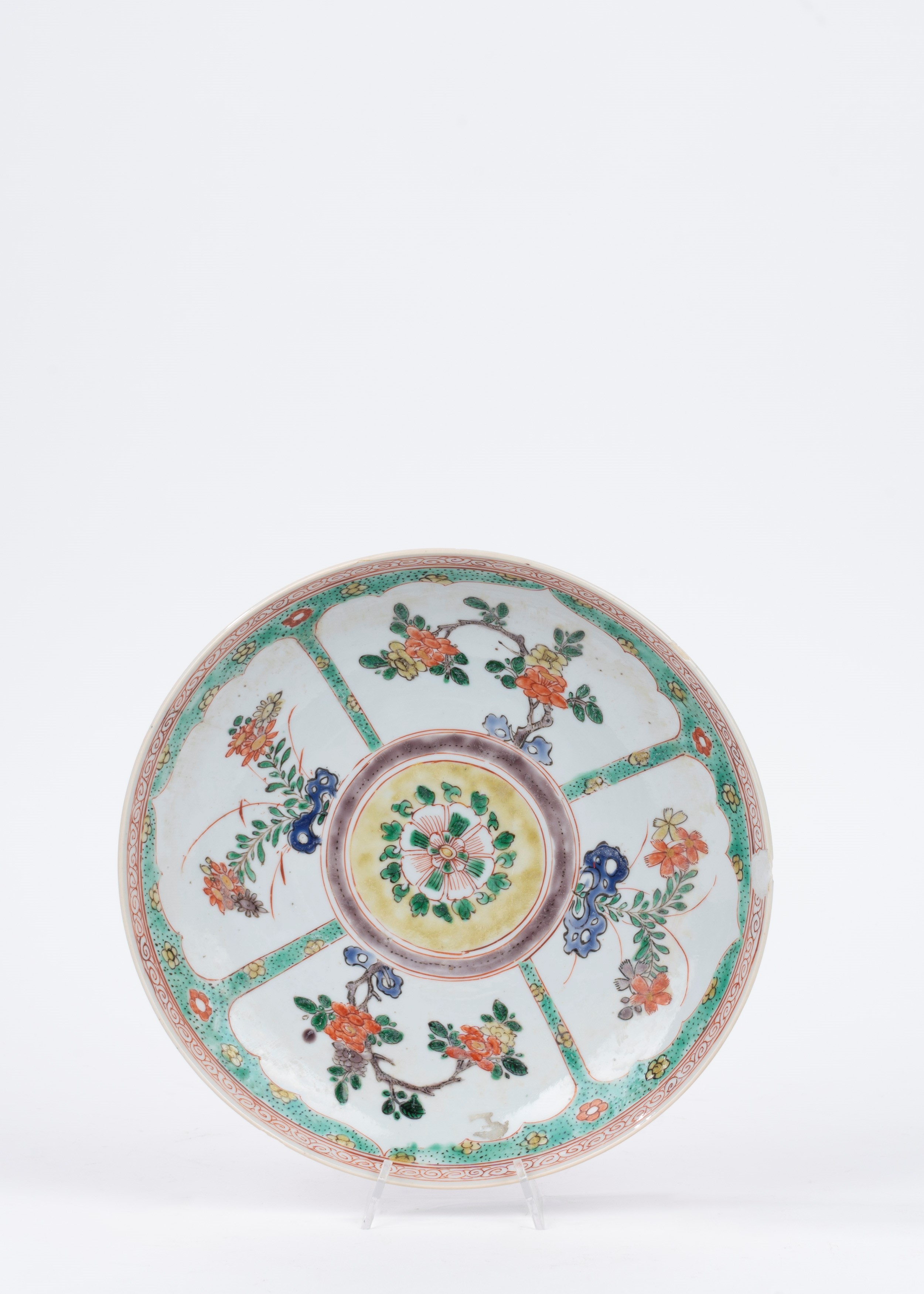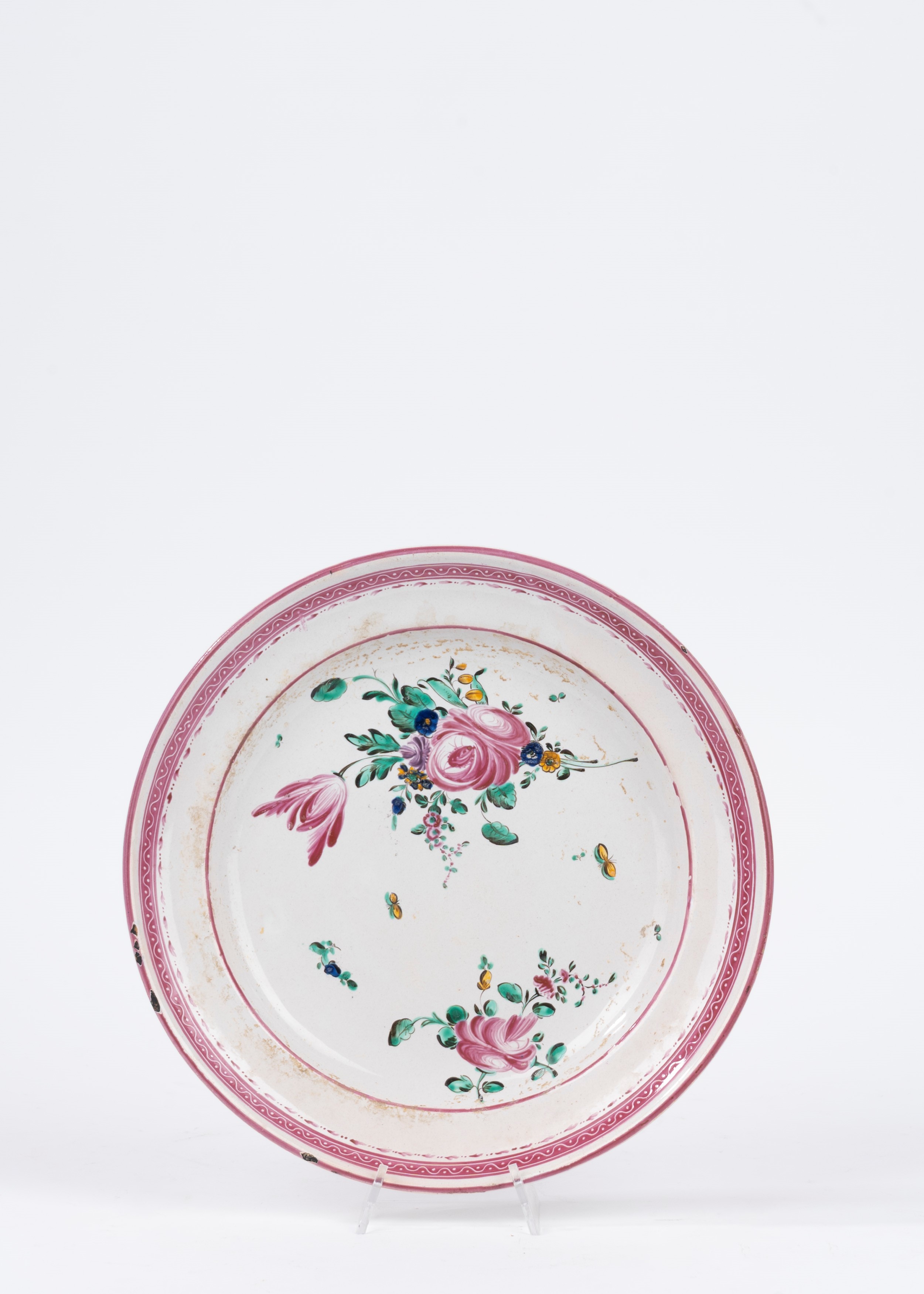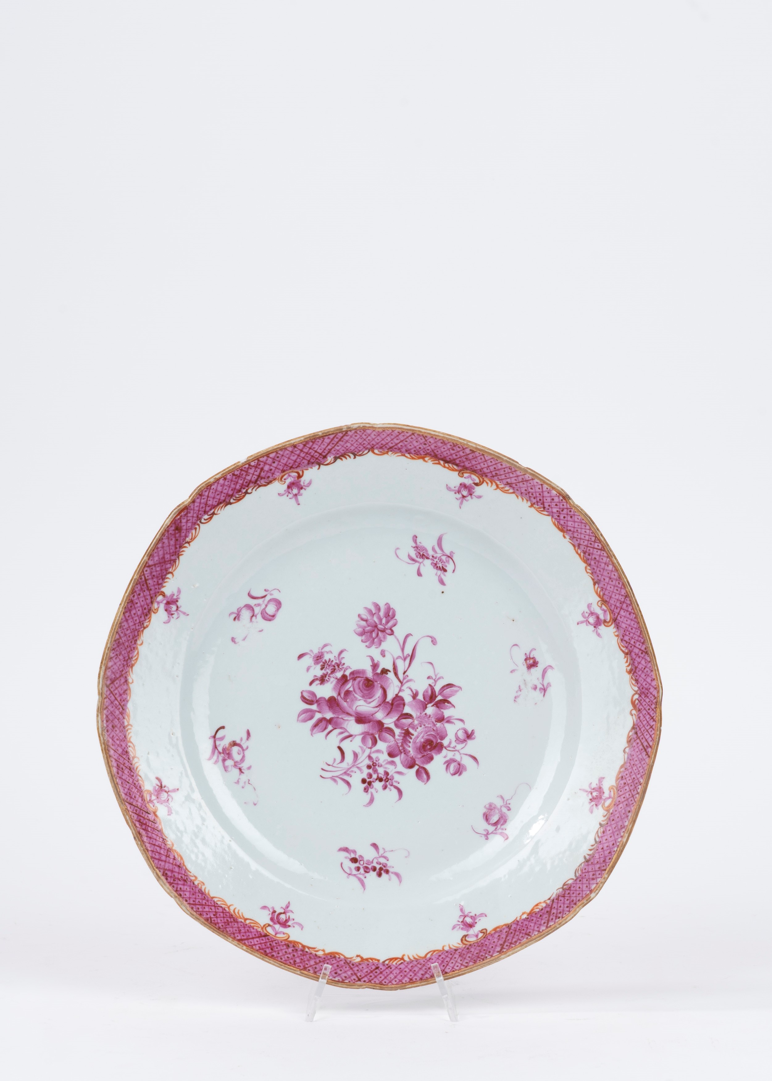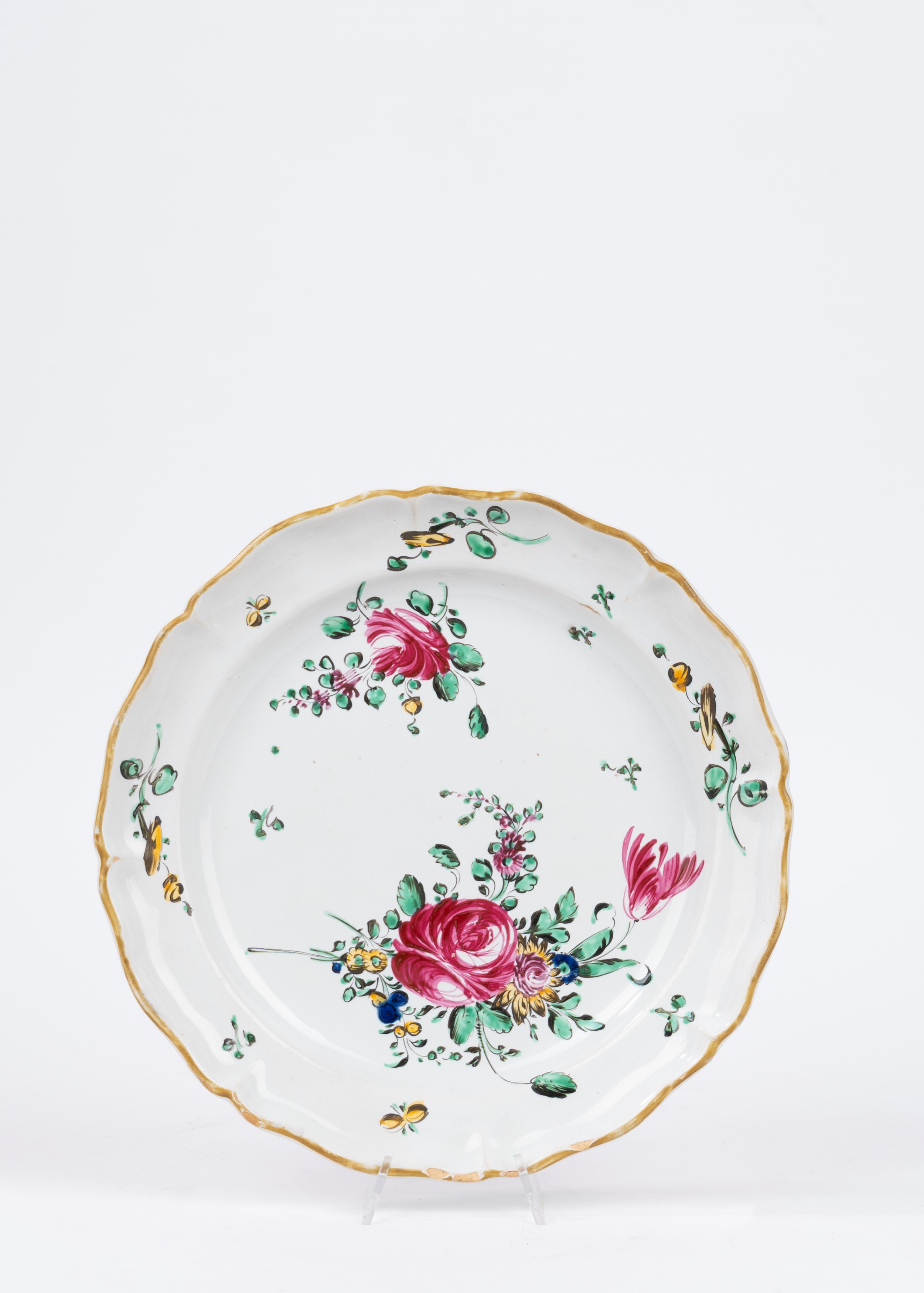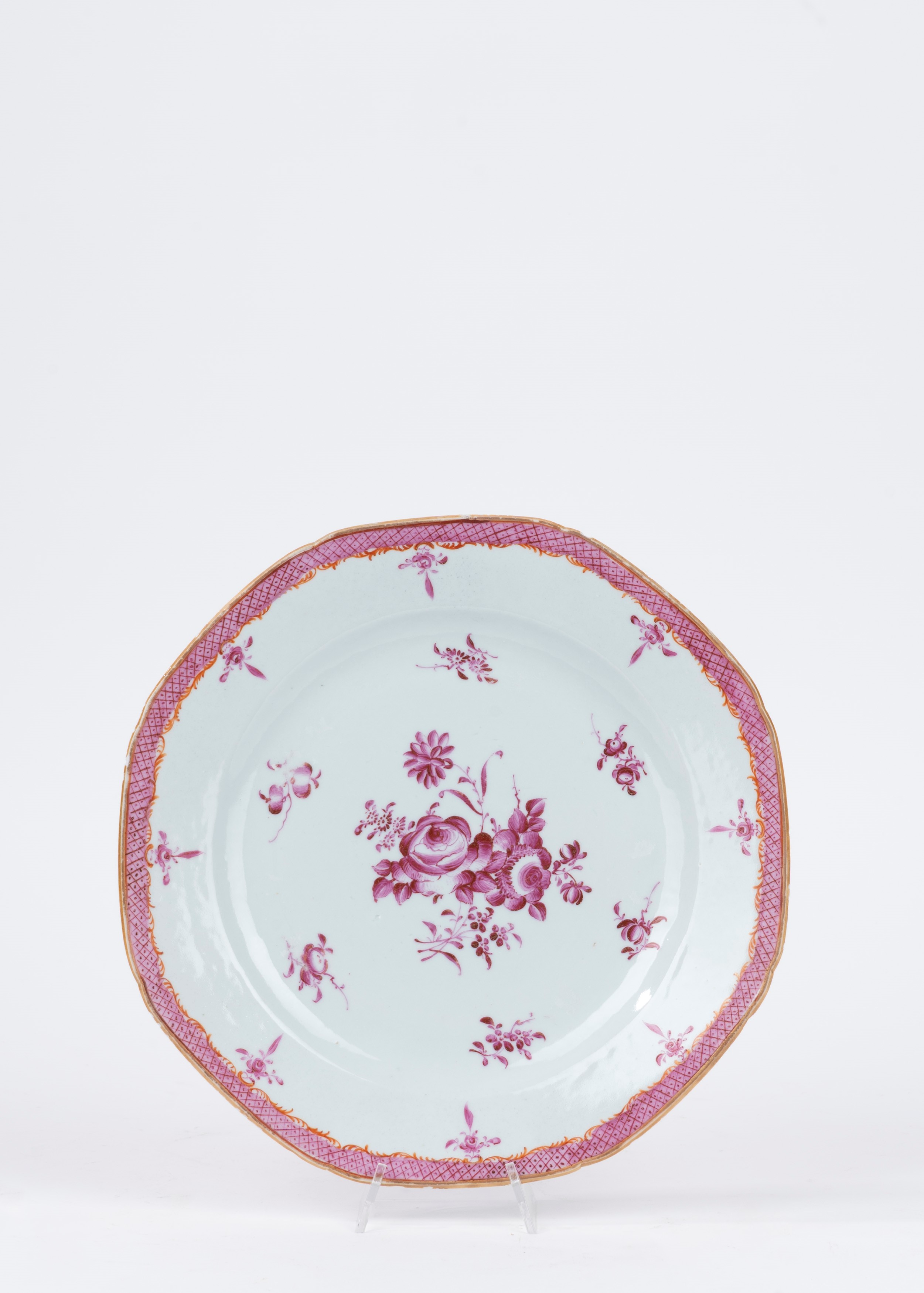 due piatti fondi con bordo polilobato, decorati a motivi floreali, manifattura di Meissen; uno cinese; uno bianco e blu a motivi floreali, manifattura Richard; due decorati con motivi floreali color porpora; due a motivi floreali su fondo bianco