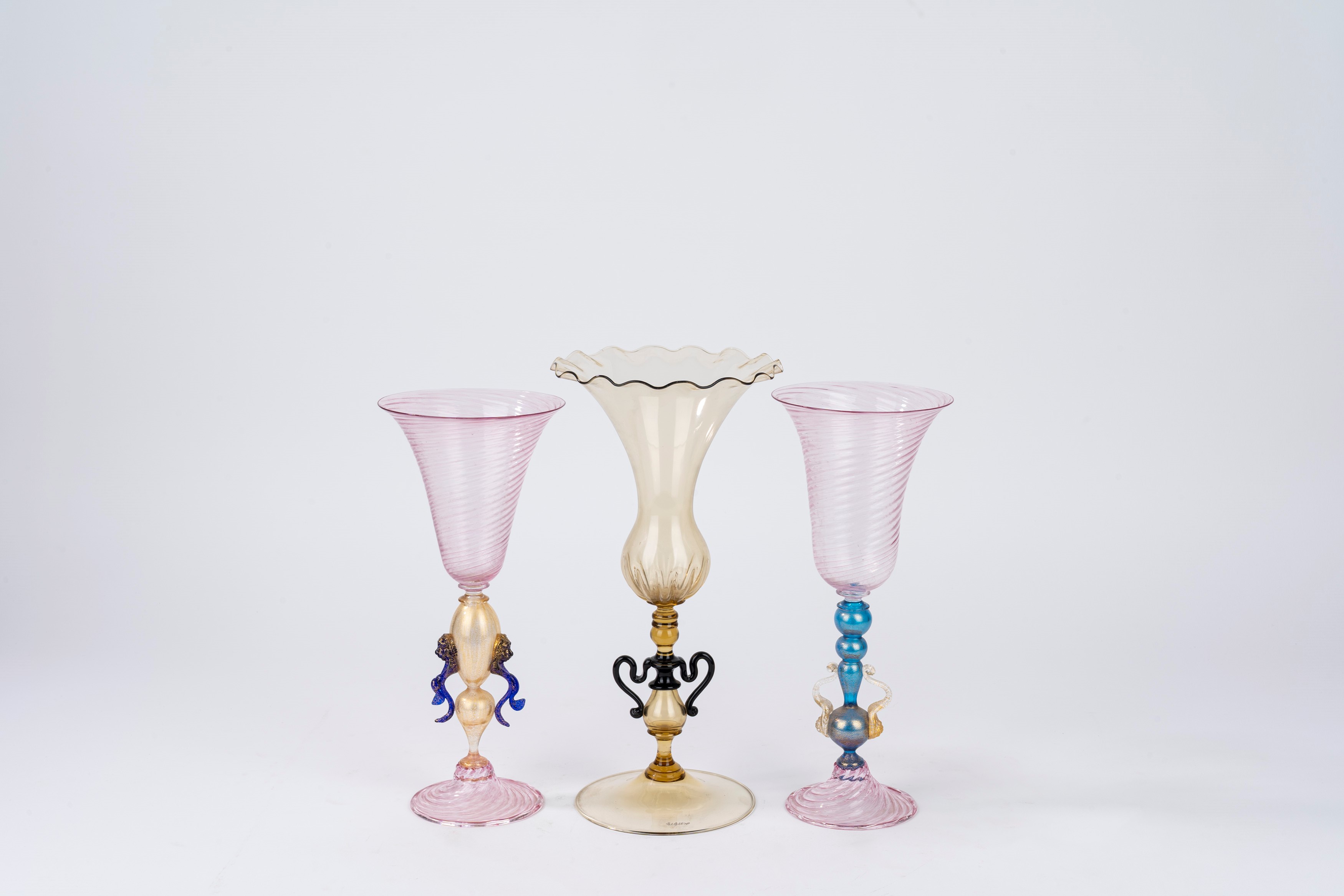 quello firmato Seguso color ambra, gli altri due color rosa con motivo a spirale