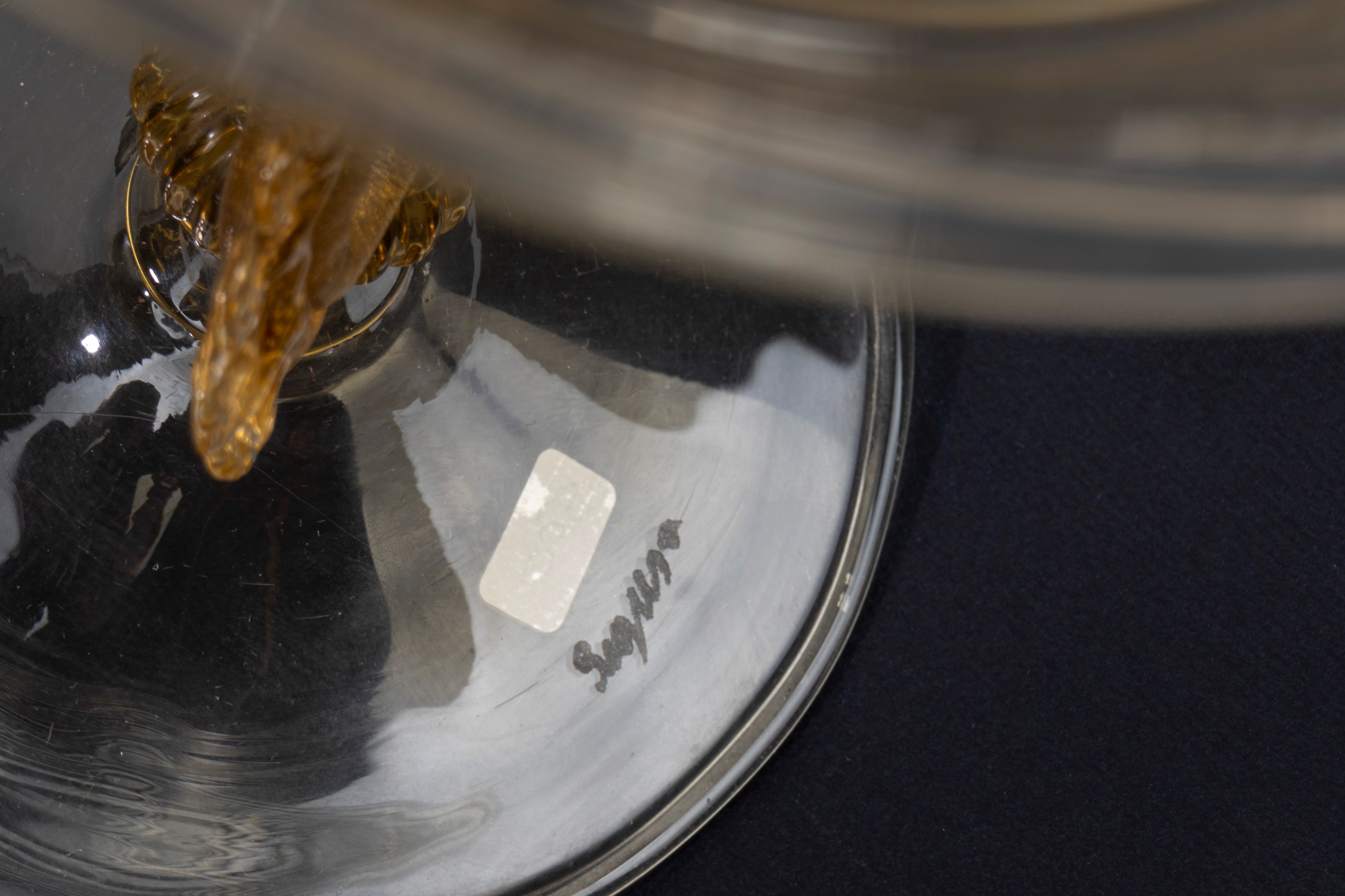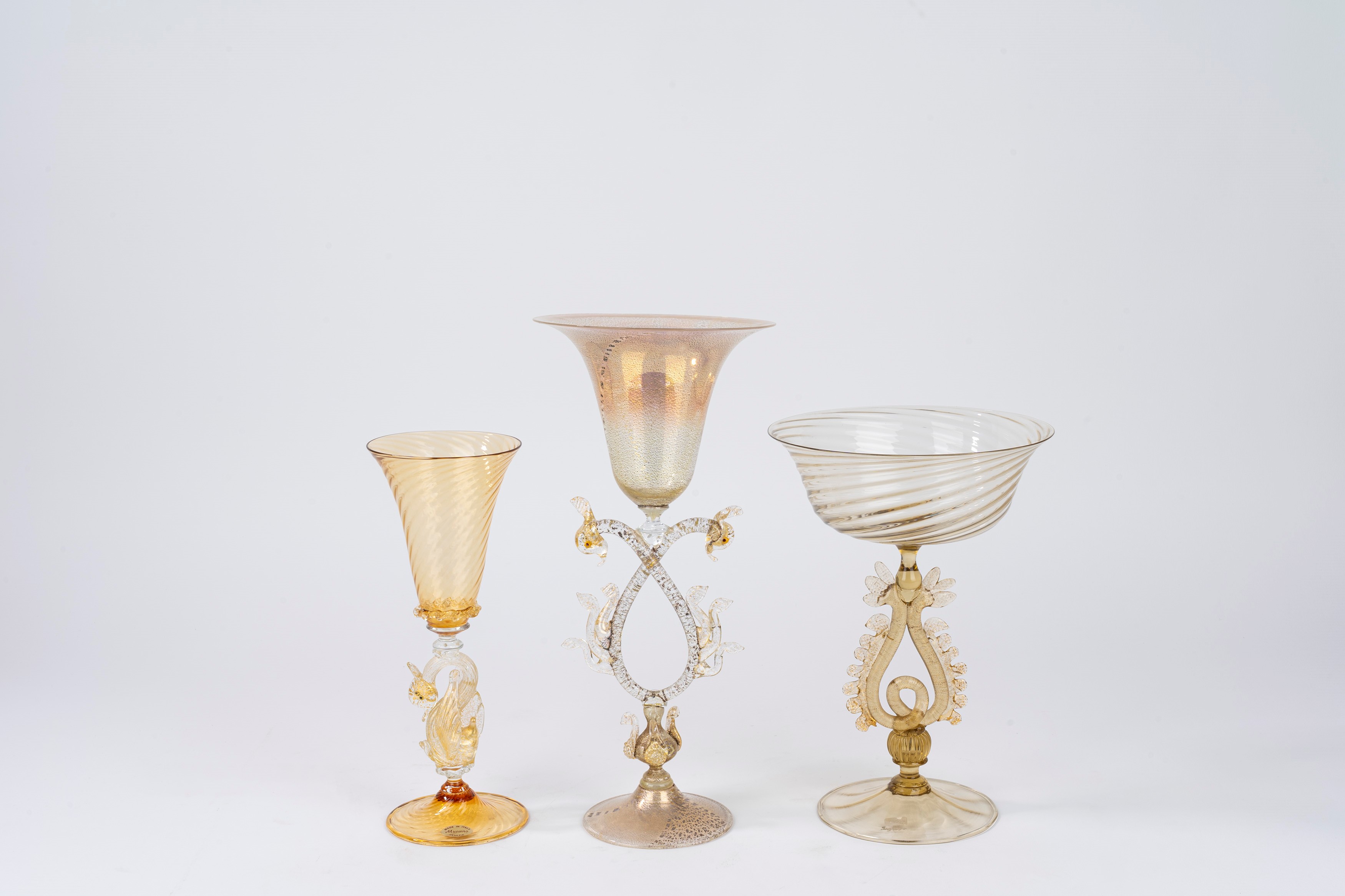 uno con decoro ad avventurina, con restauro, uno color ambra con fusto a guisa di cigno e coppa con motivo a spirale, firmata Seguso