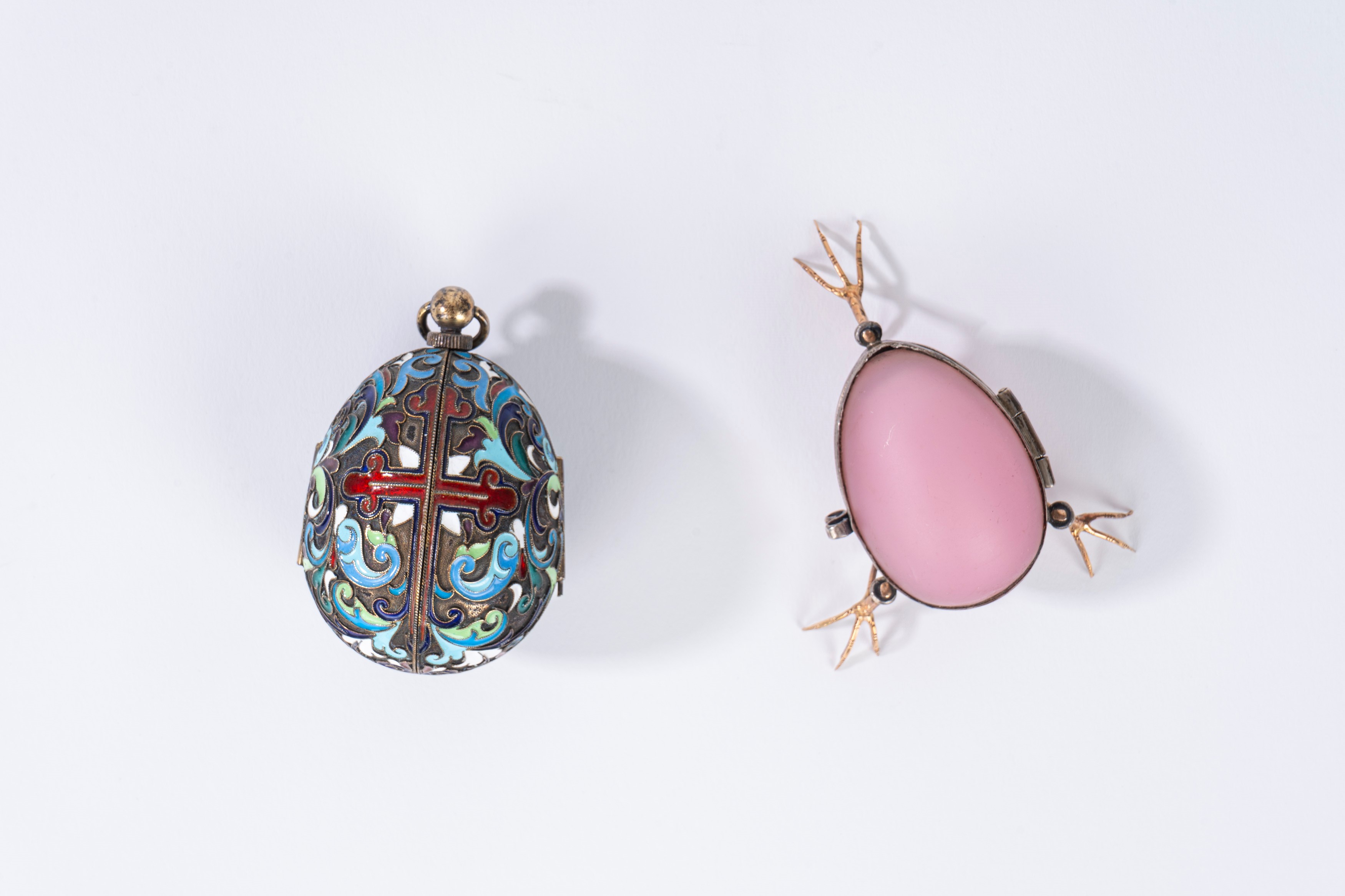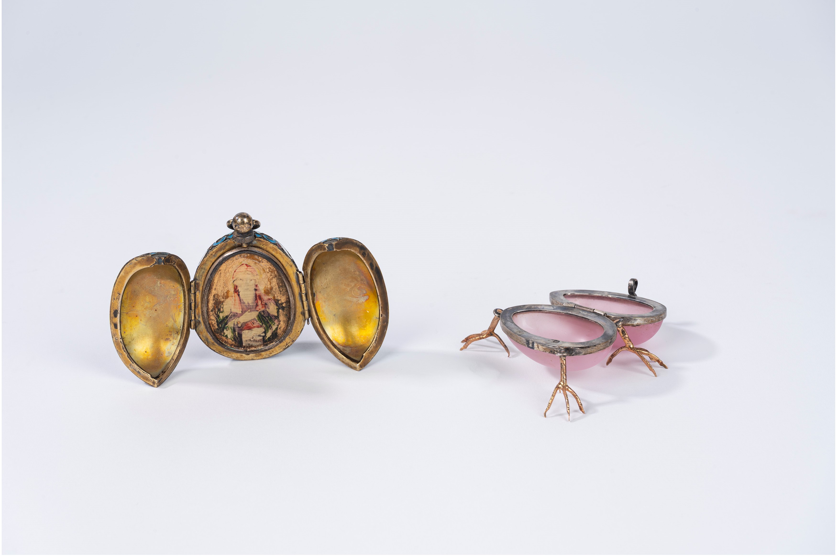 l'uovo con smalti policromi a motivi vegetali, interno in vermeil con miniatura raffigurante santo, punzone kokoshnik 1899-1908, argentiere non identificato; la scatola con coperchio apribile su tre zampe con punzone OP (Otto Reinhold Pettilius, S. Pietroburgo 1838-1874) e purity mark "88"