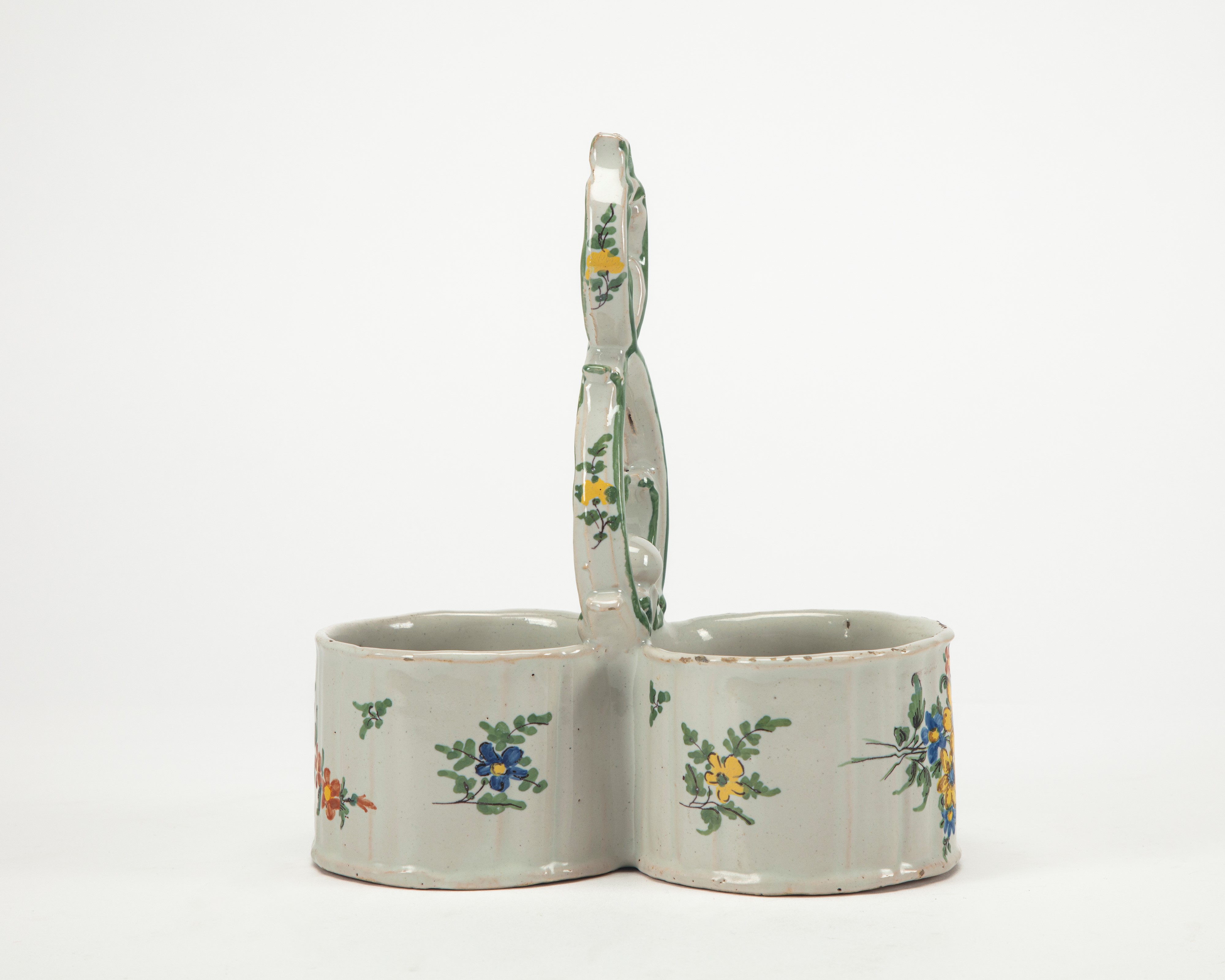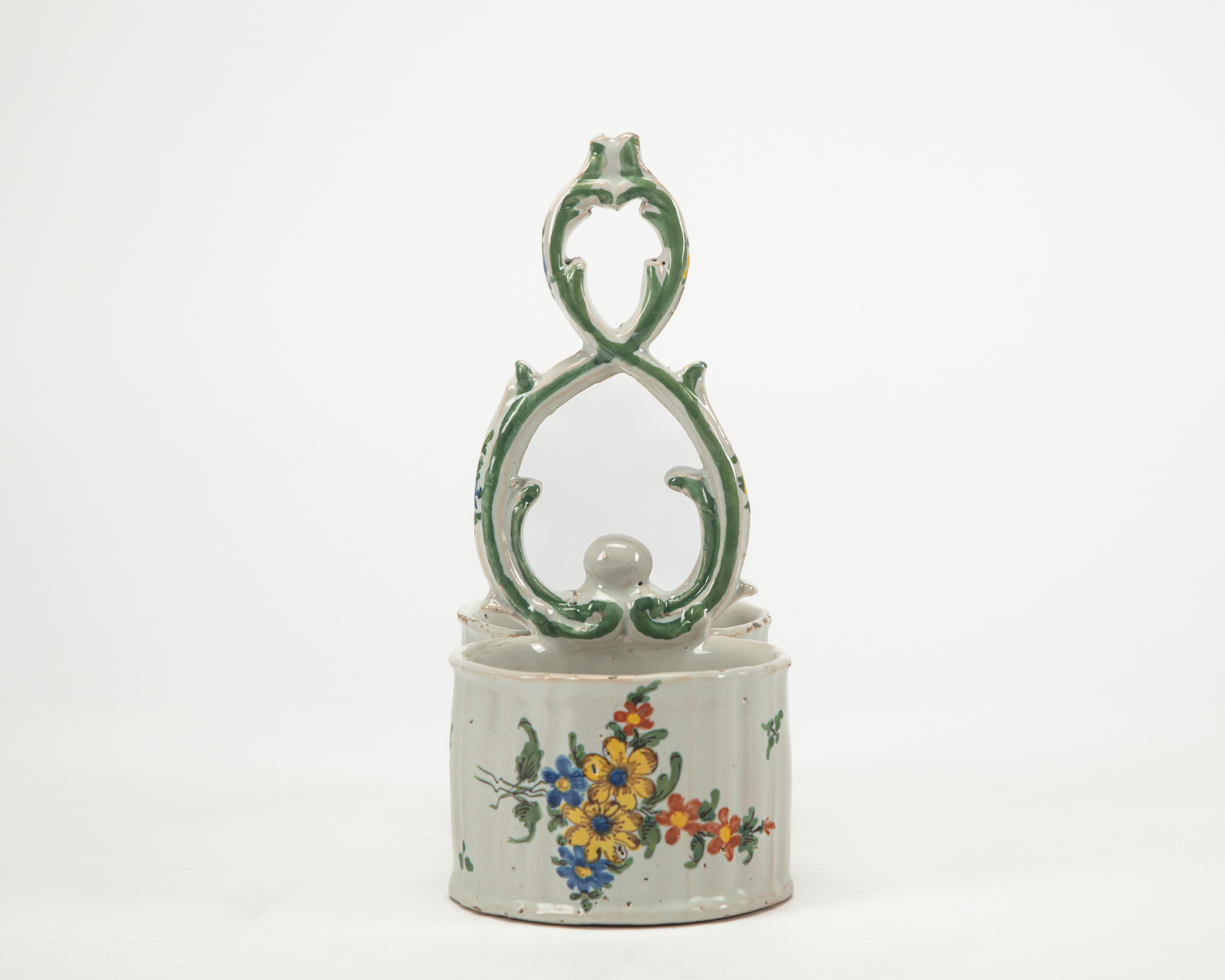 Oliera in maiolica decorata in policromia a motivi floreali, Manifattura di Faenza, seconda metà secolo XVIII
