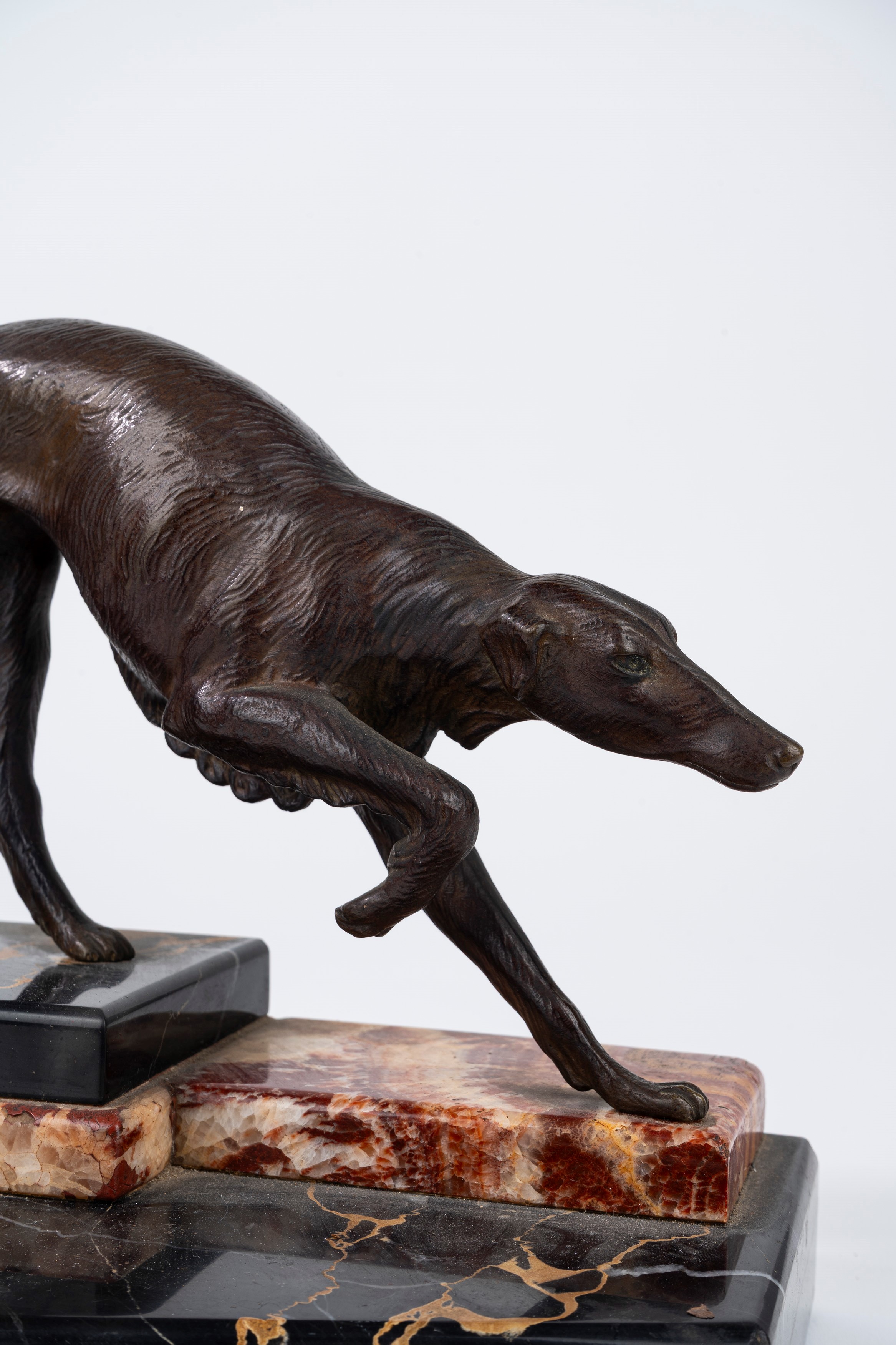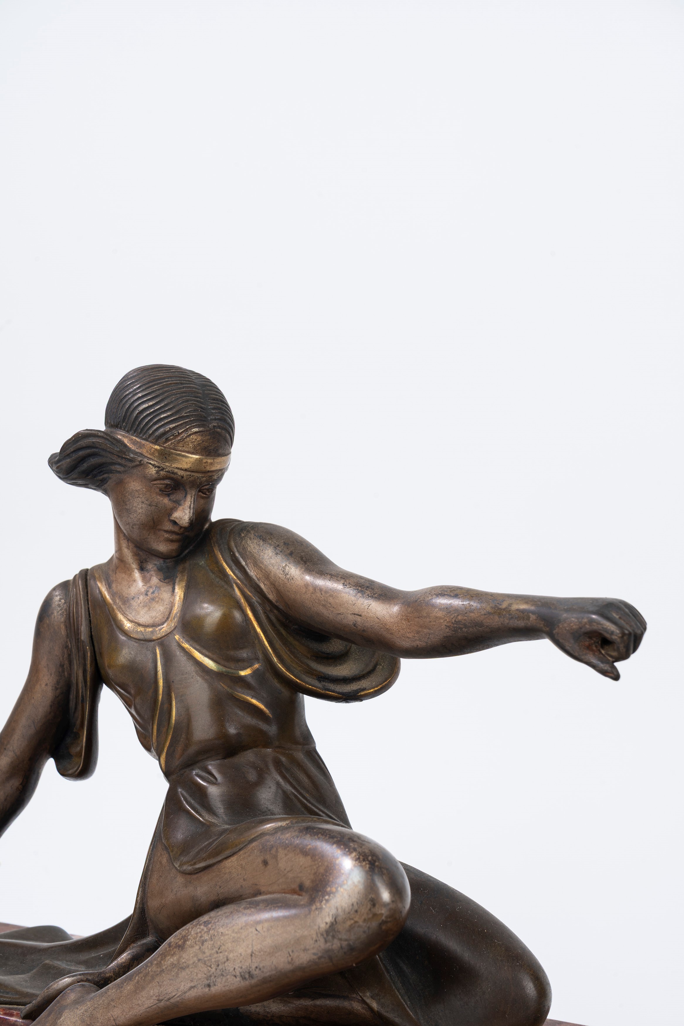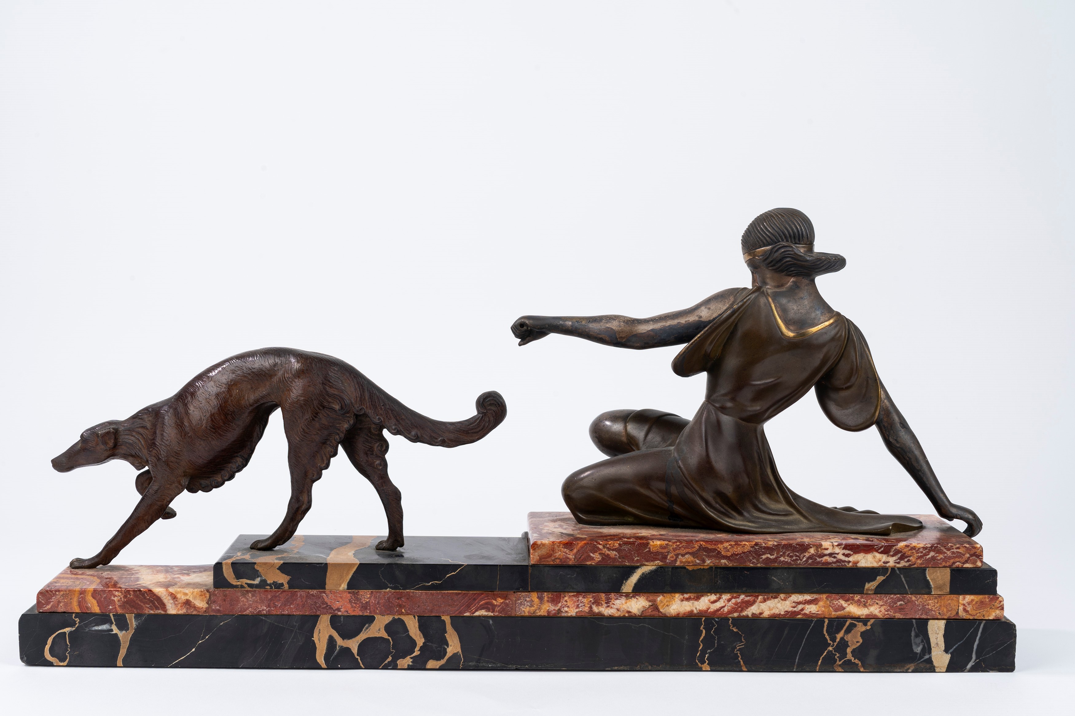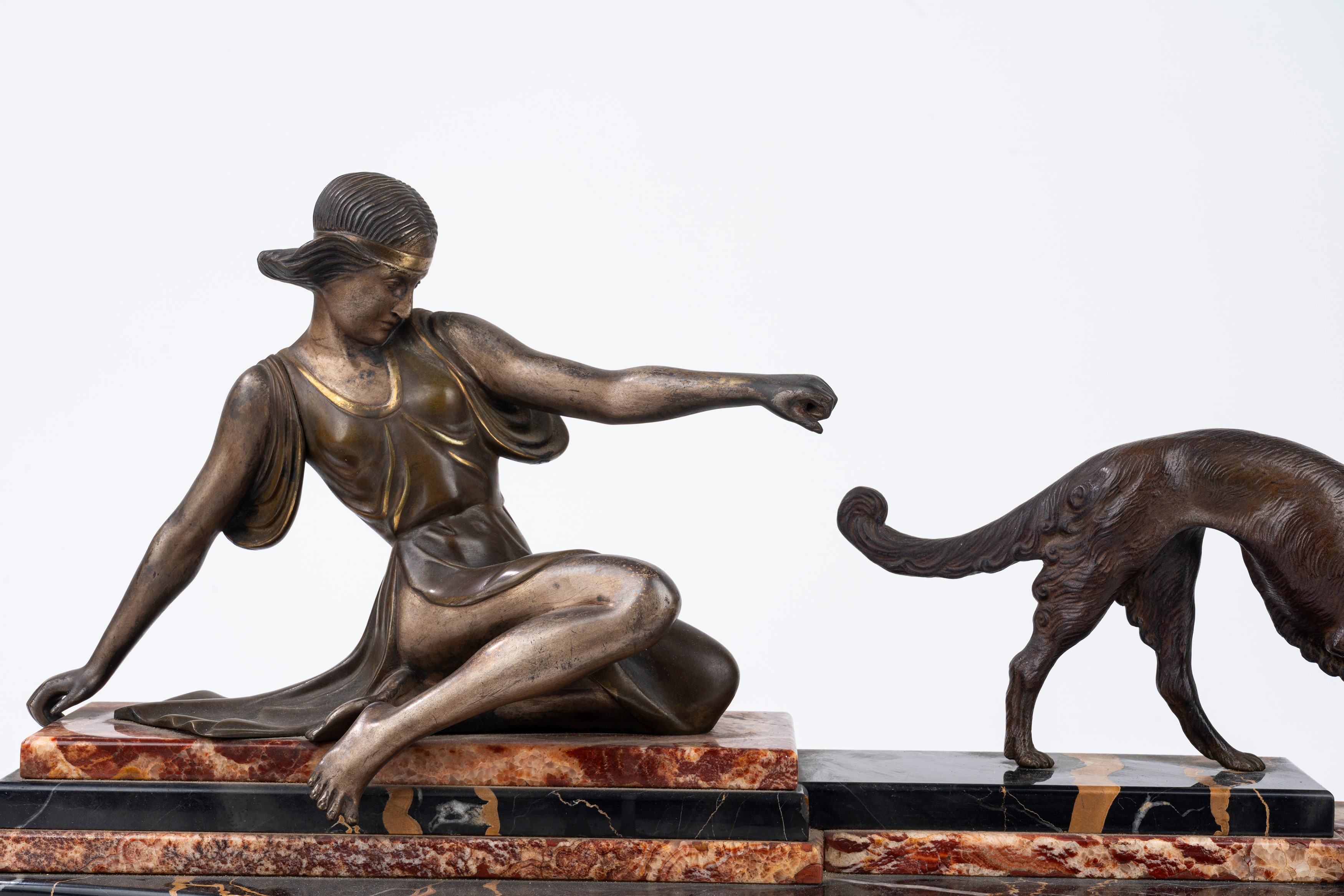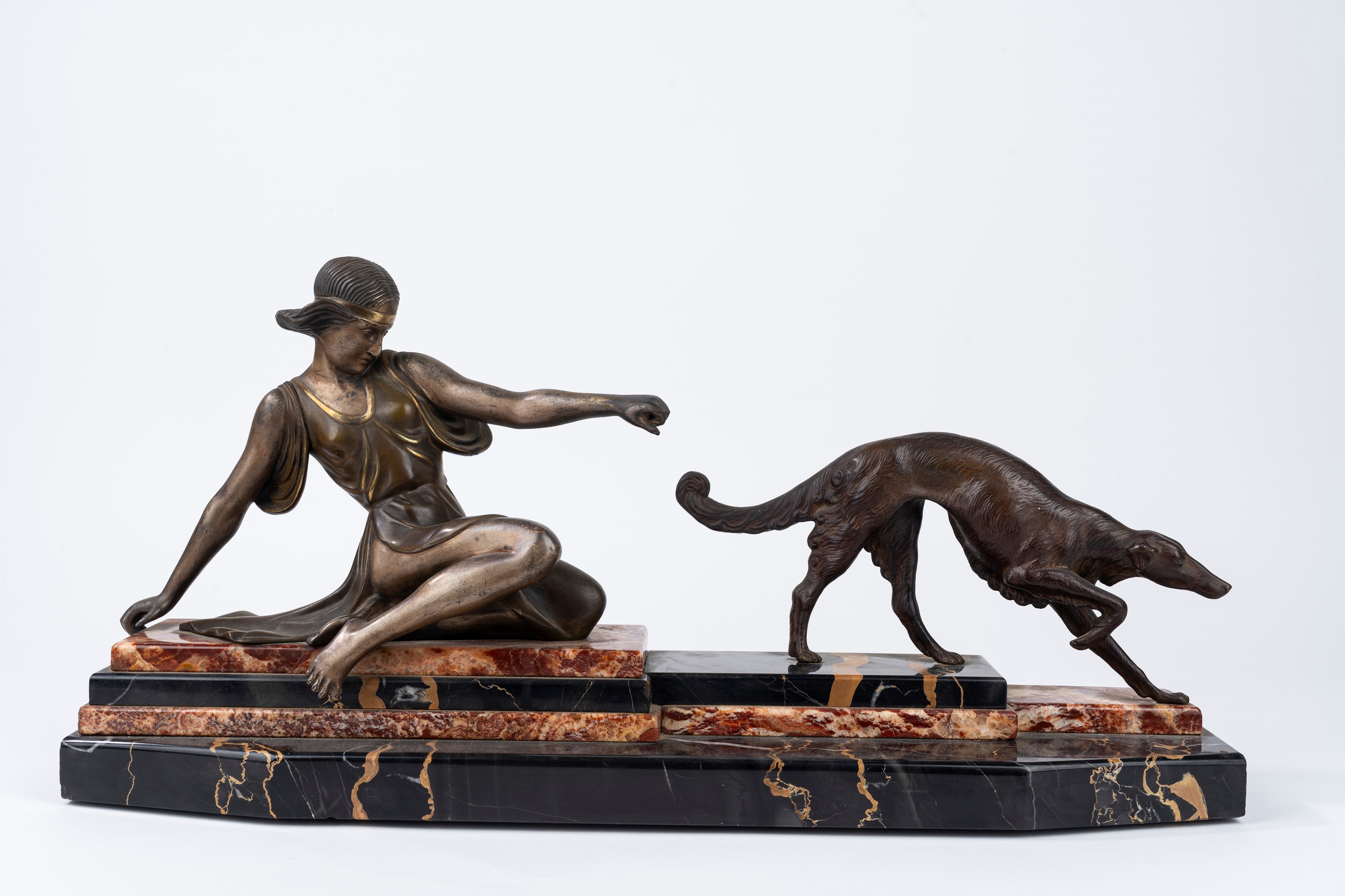 Scultura in bronzo su base in marmo policromo raffigurante Diana e levriero, anni '20-'30 del XX secolo