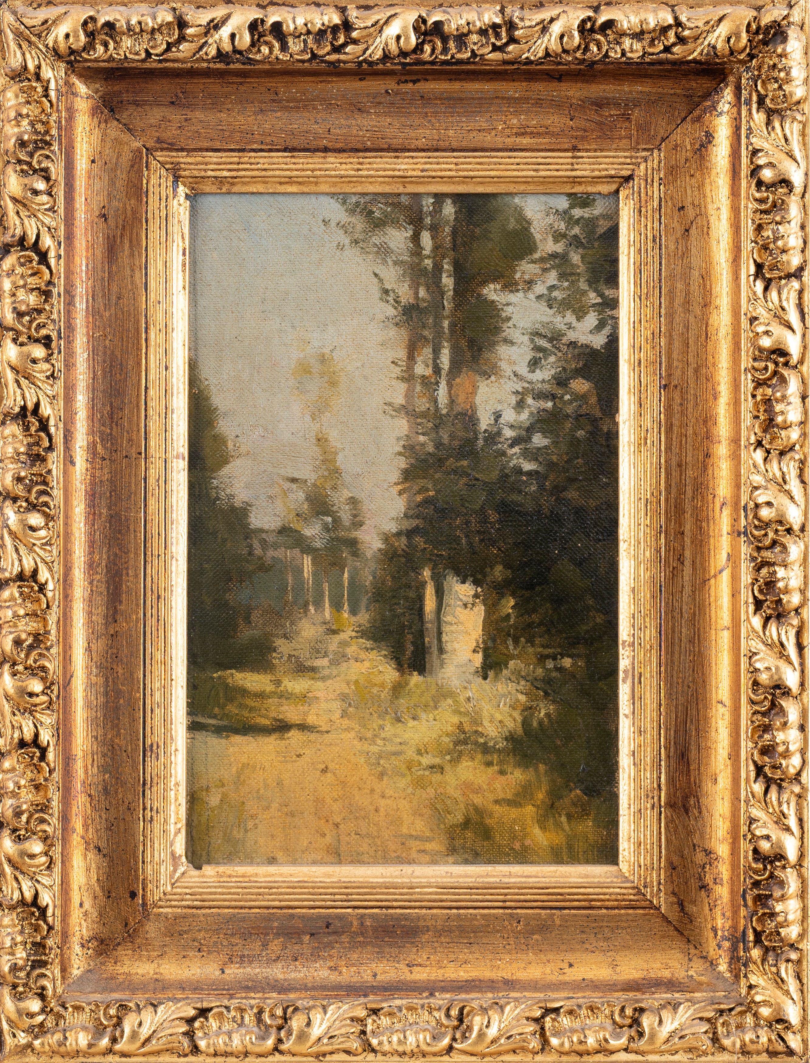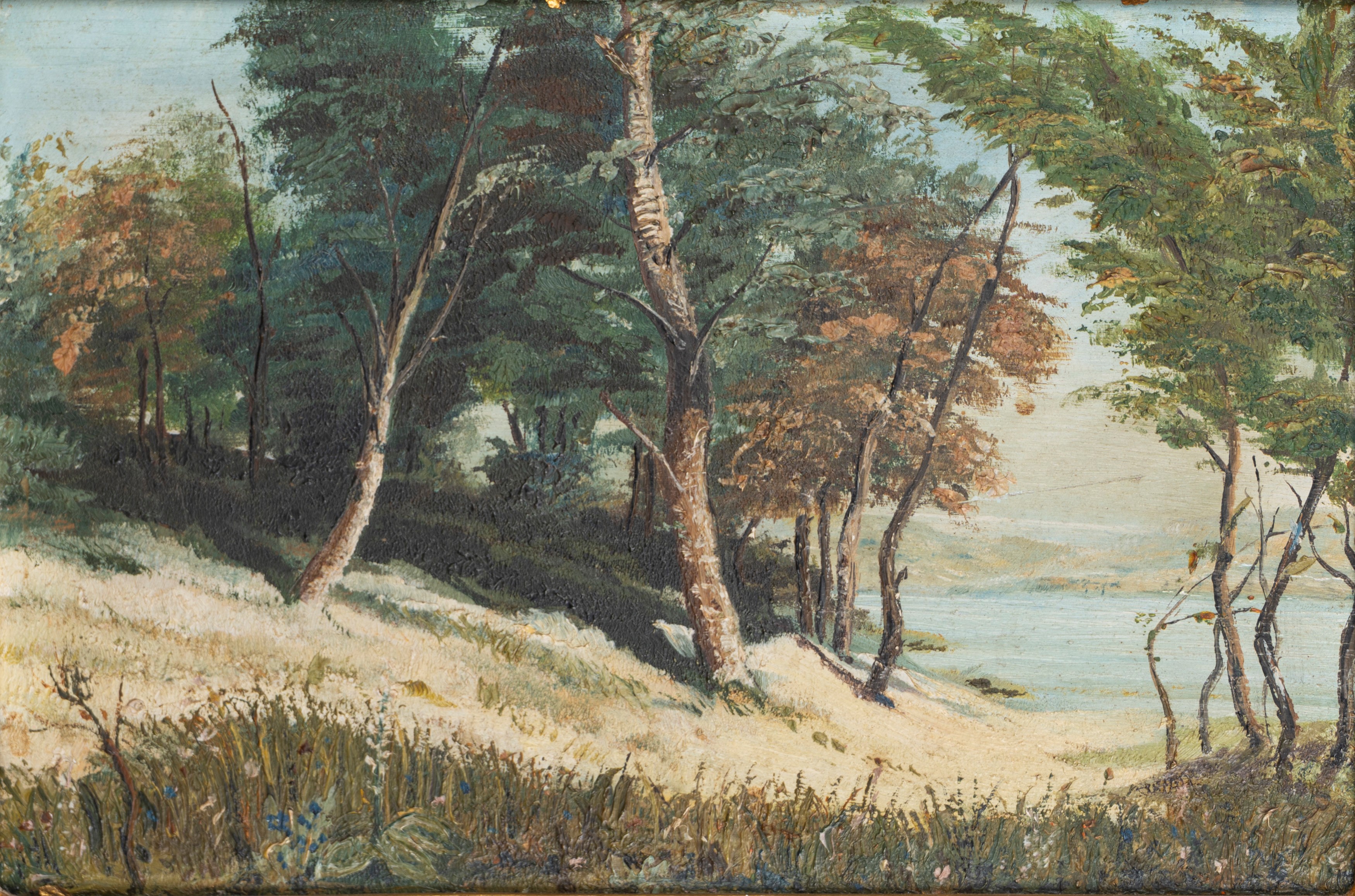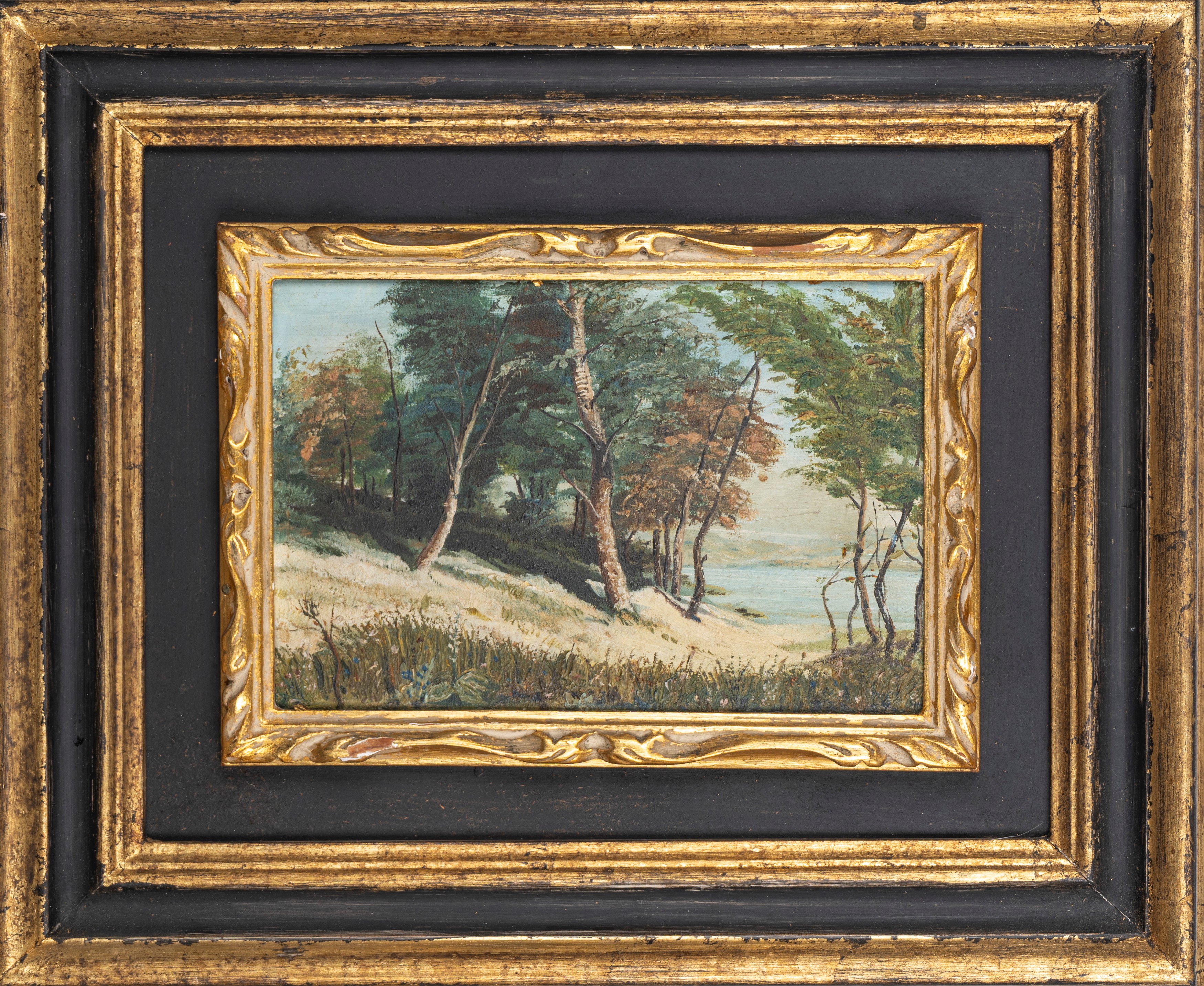 uno olio su tela riportata su cartone, raffigurante paesaggio boschivo; uno olio su legno, raffigurante paesaggio boschivo; uno acquerello su carta, raffigurante coppia a passeggio, firmato indistintamente in basso a destra