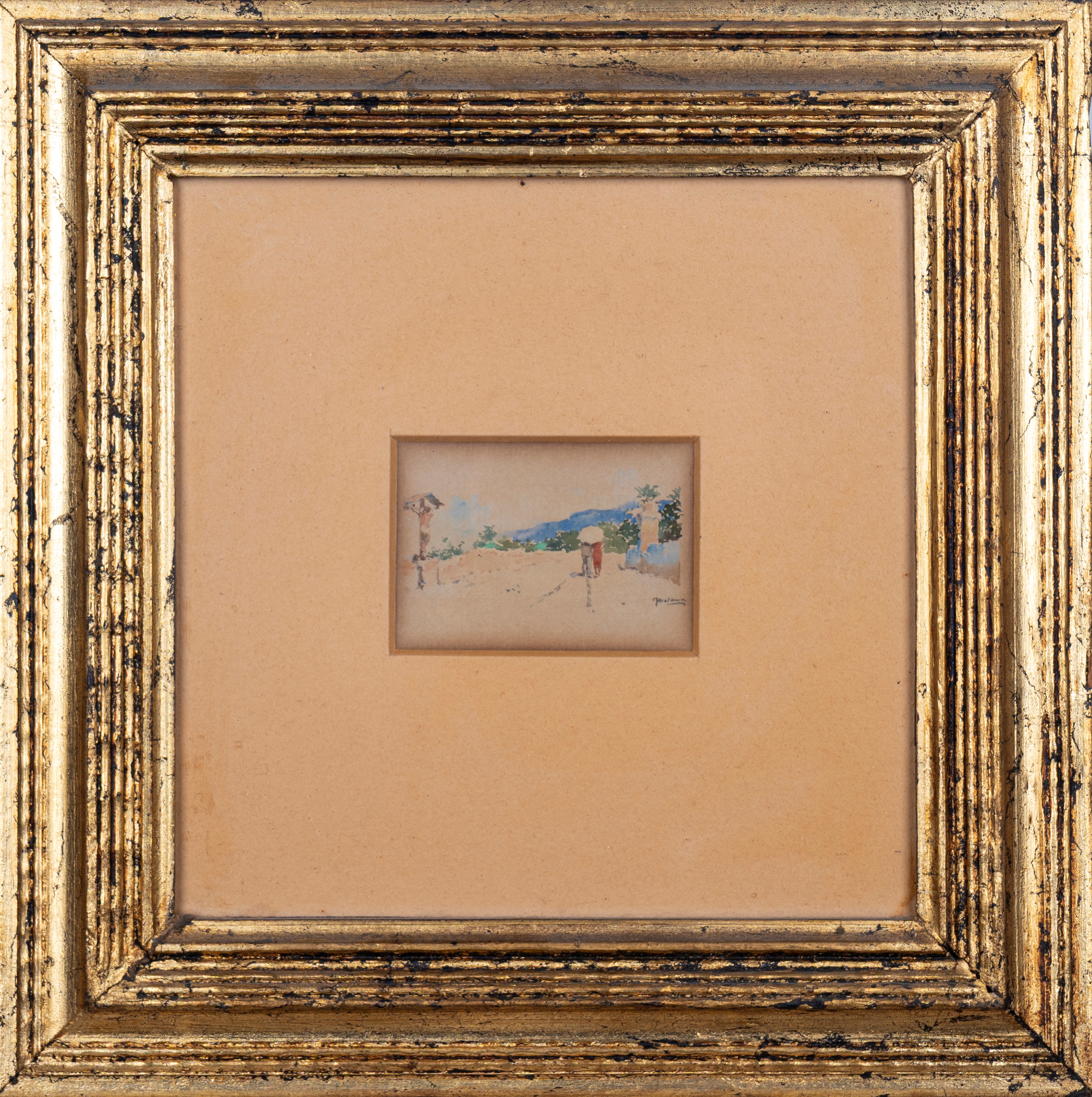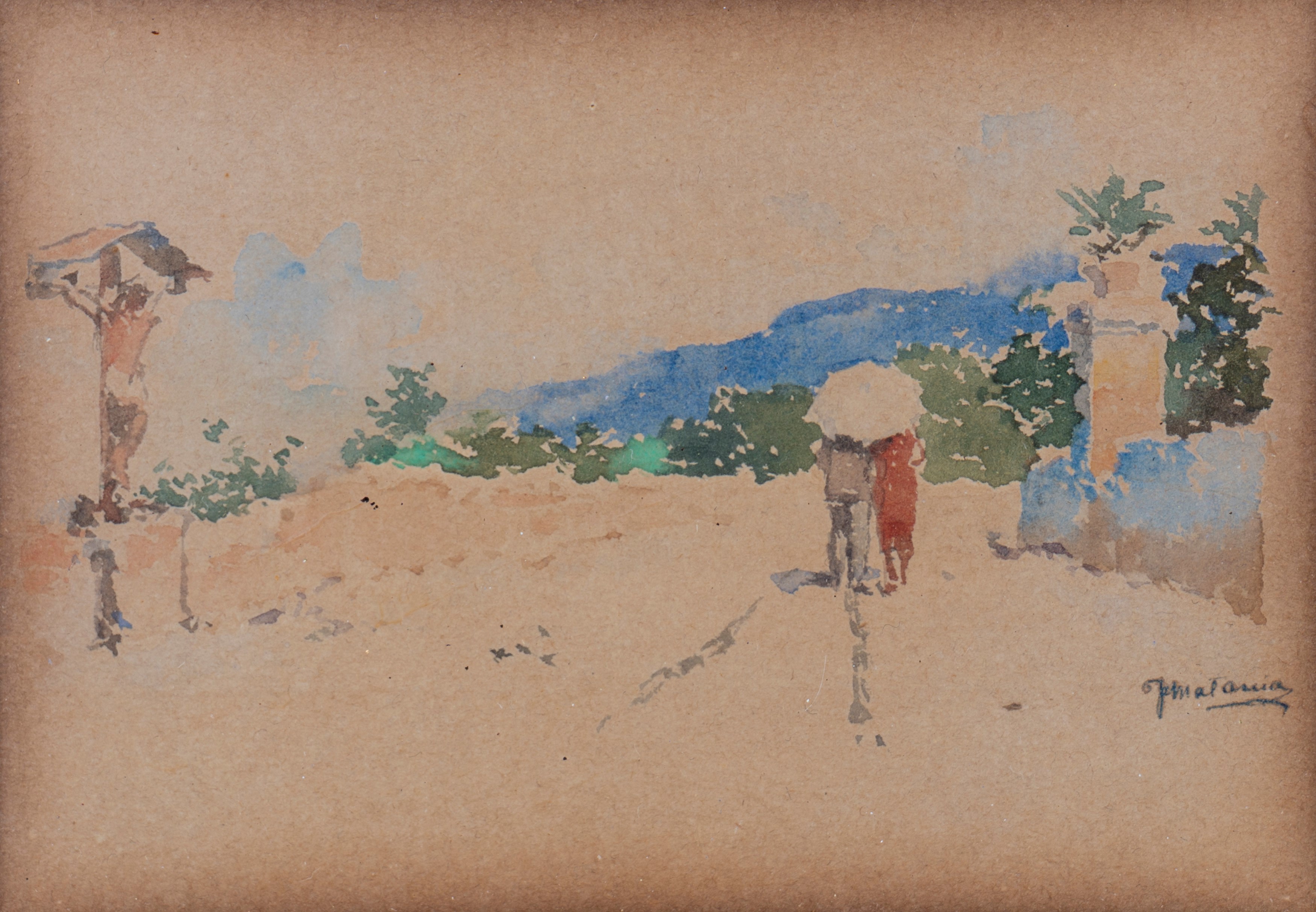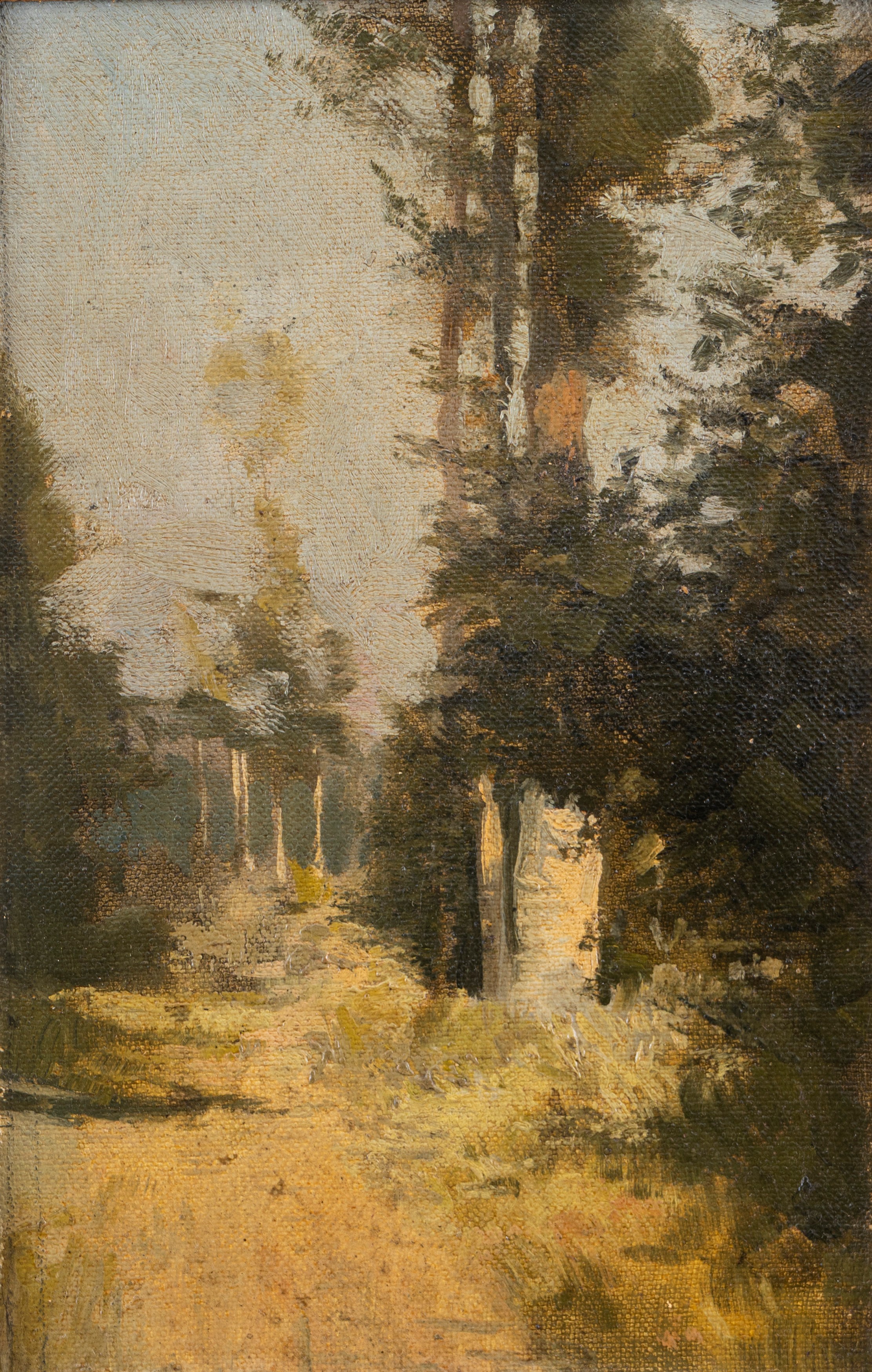 uno olio su tela riportata su cartone, raffigurante paesaggio boschivo; uno olio su legno, raffigurante paesaggio boschivo; uno acquerello su carta, raffigurante coppia a passeggio, firmato indistintamente in basso a destra