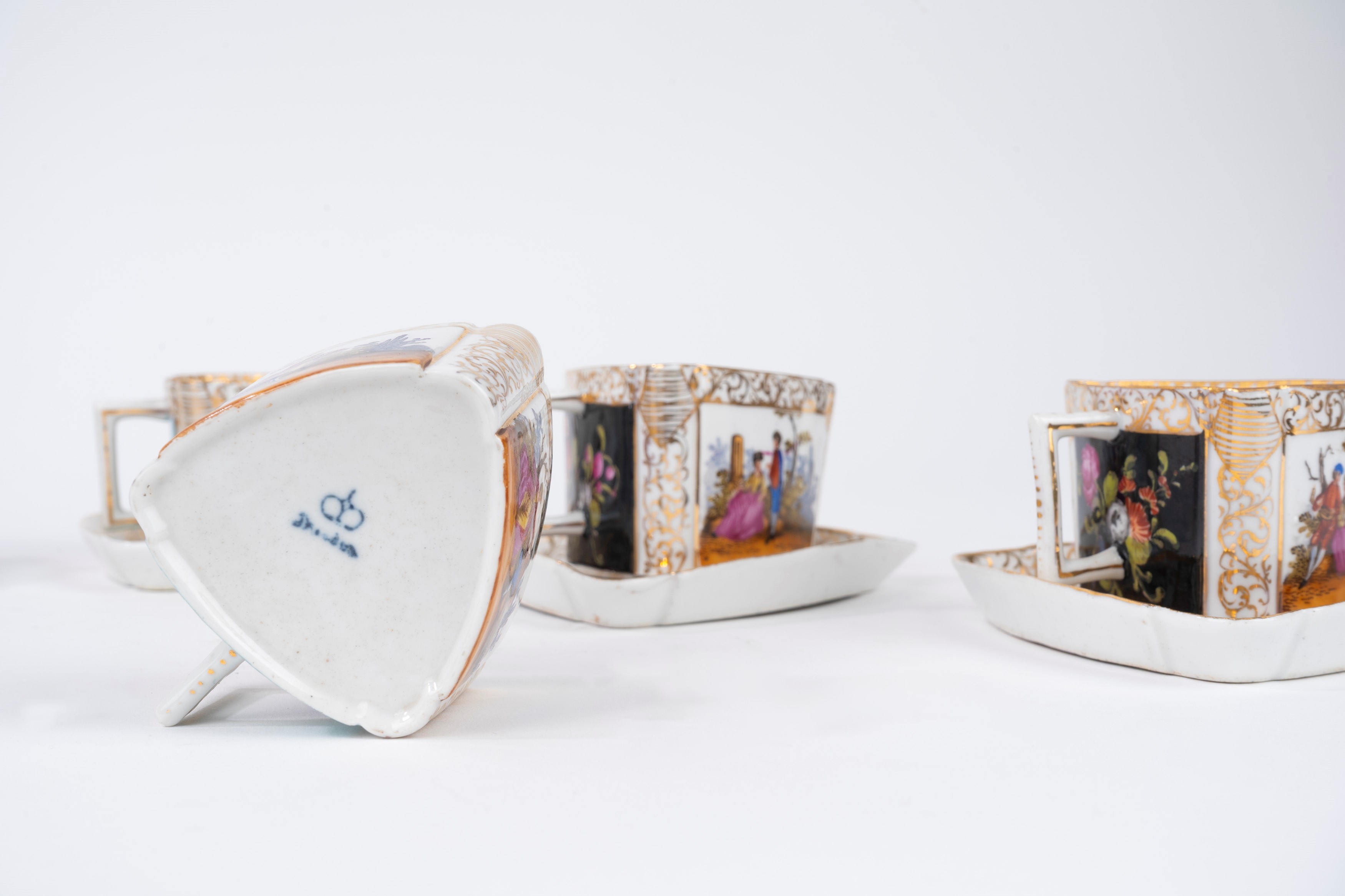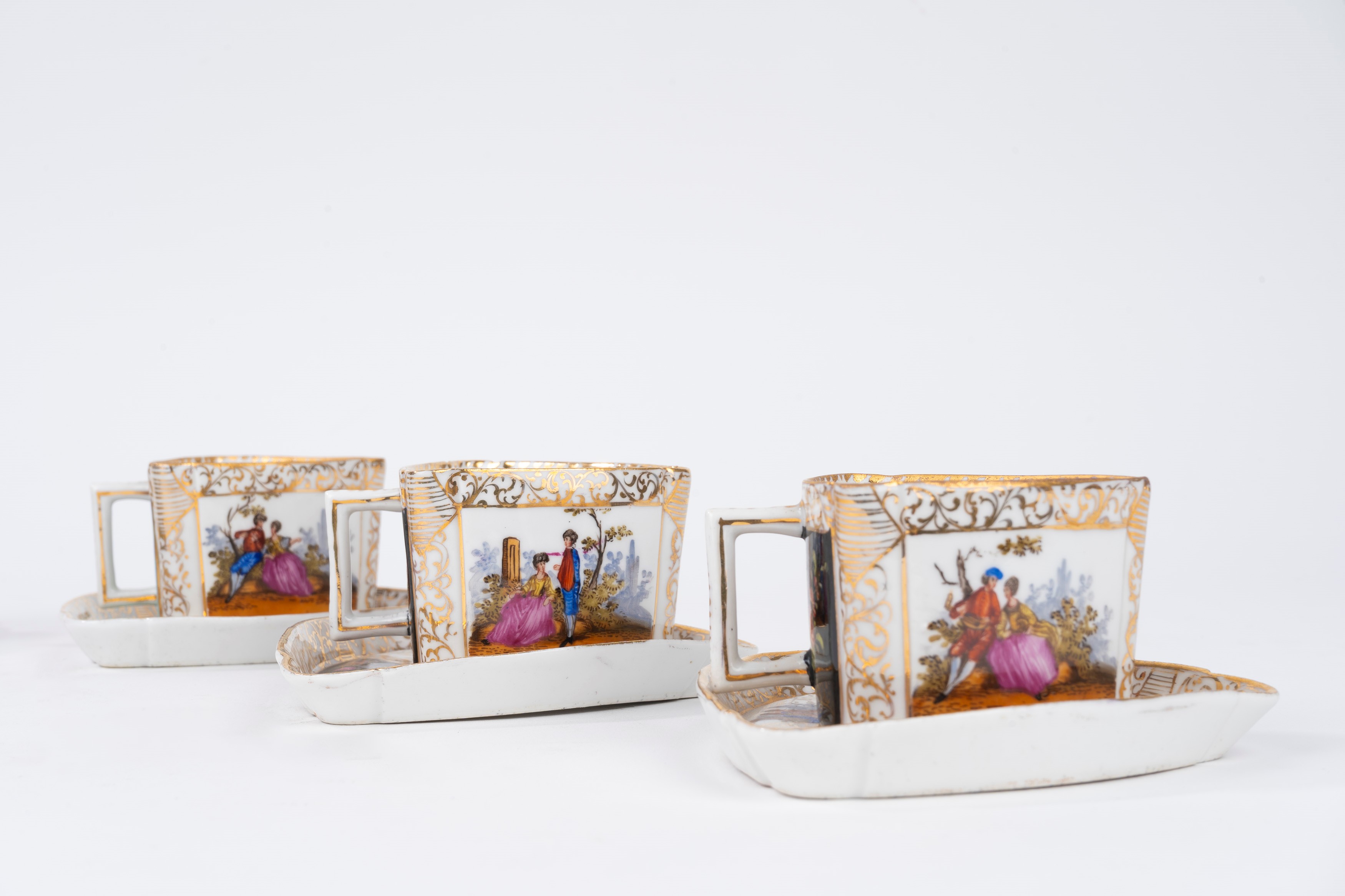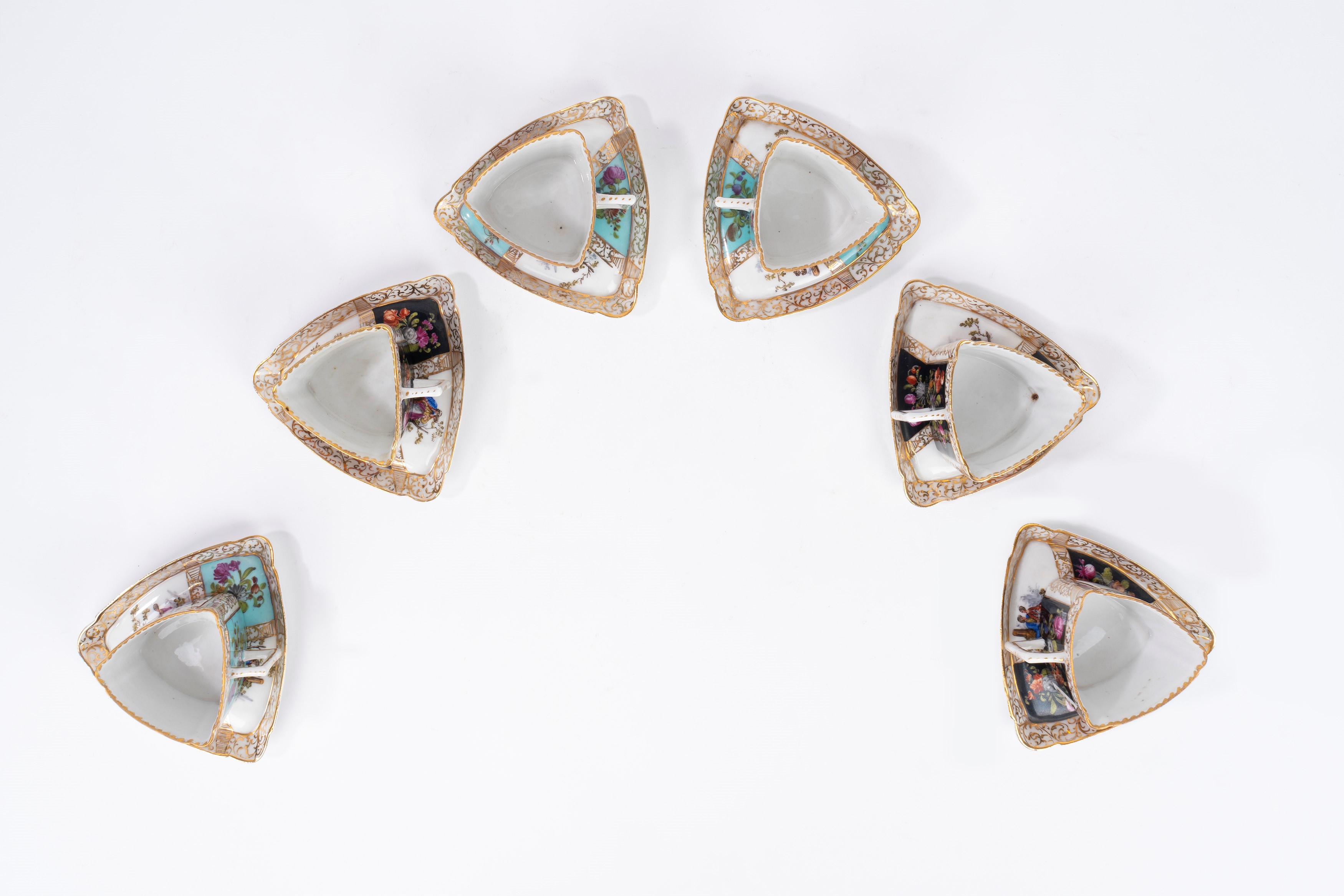 composto da 6 tazzine con piattino, tutte di forma triangolare, decorate con scene galanti, motivi floreali e arabeschi in oro