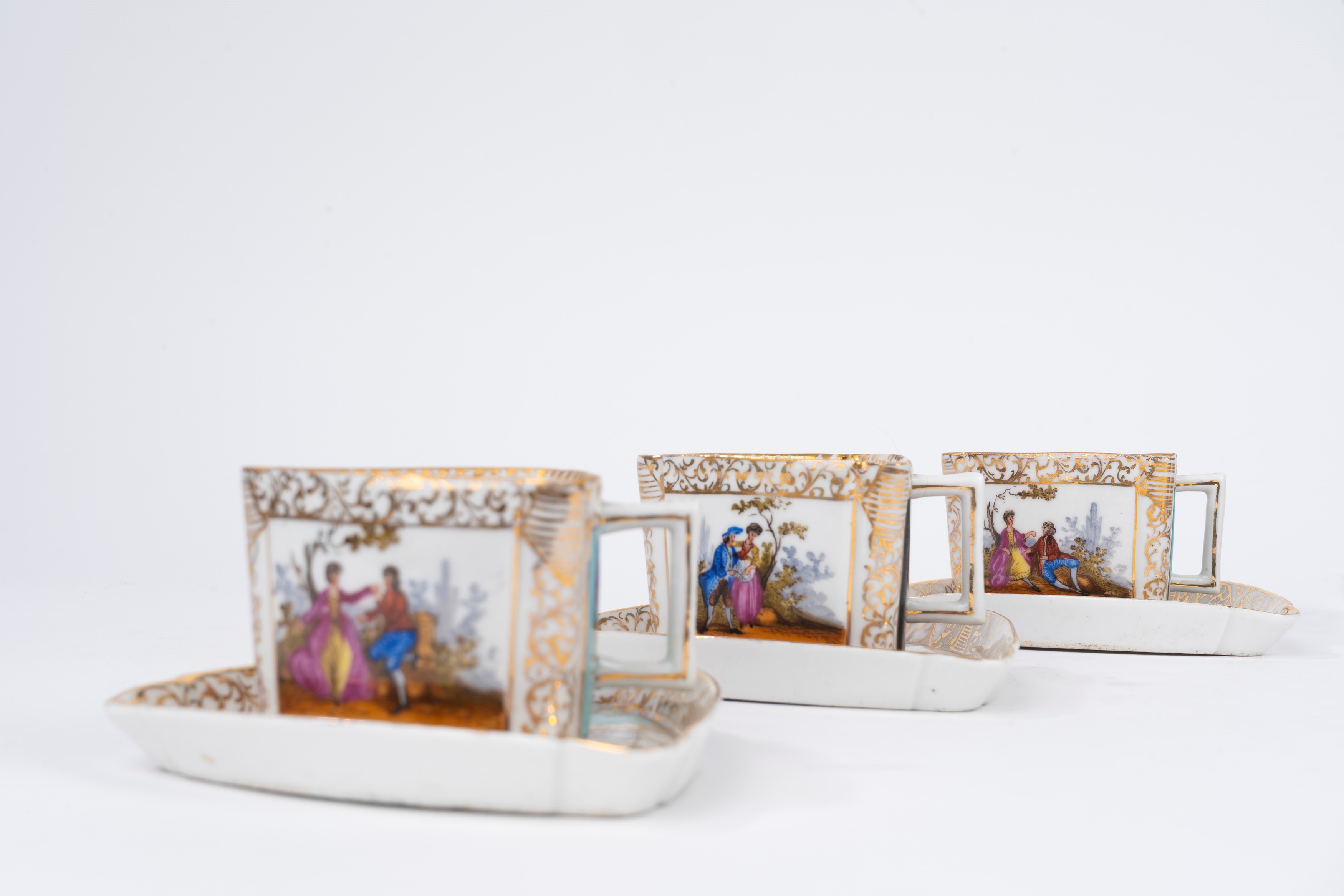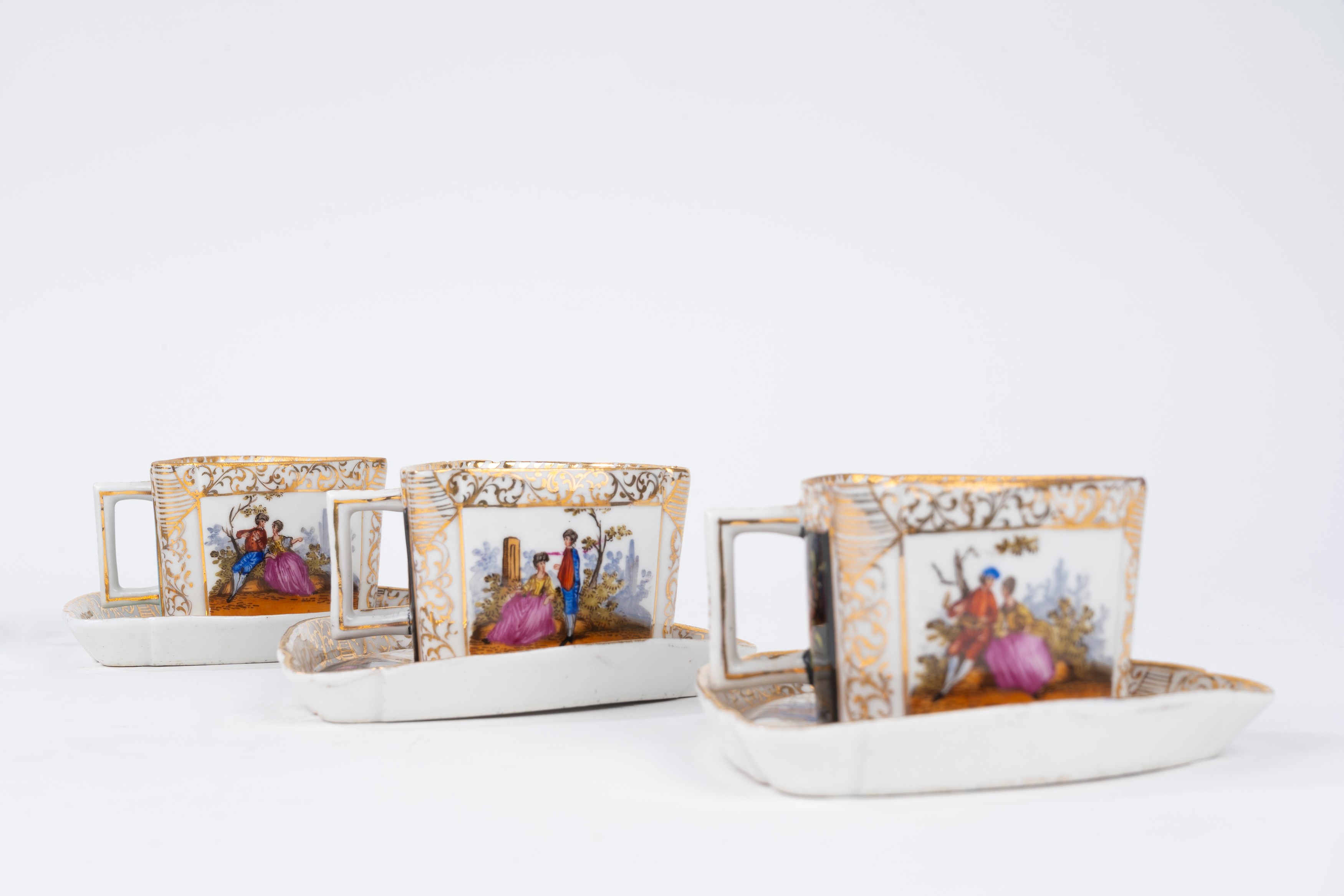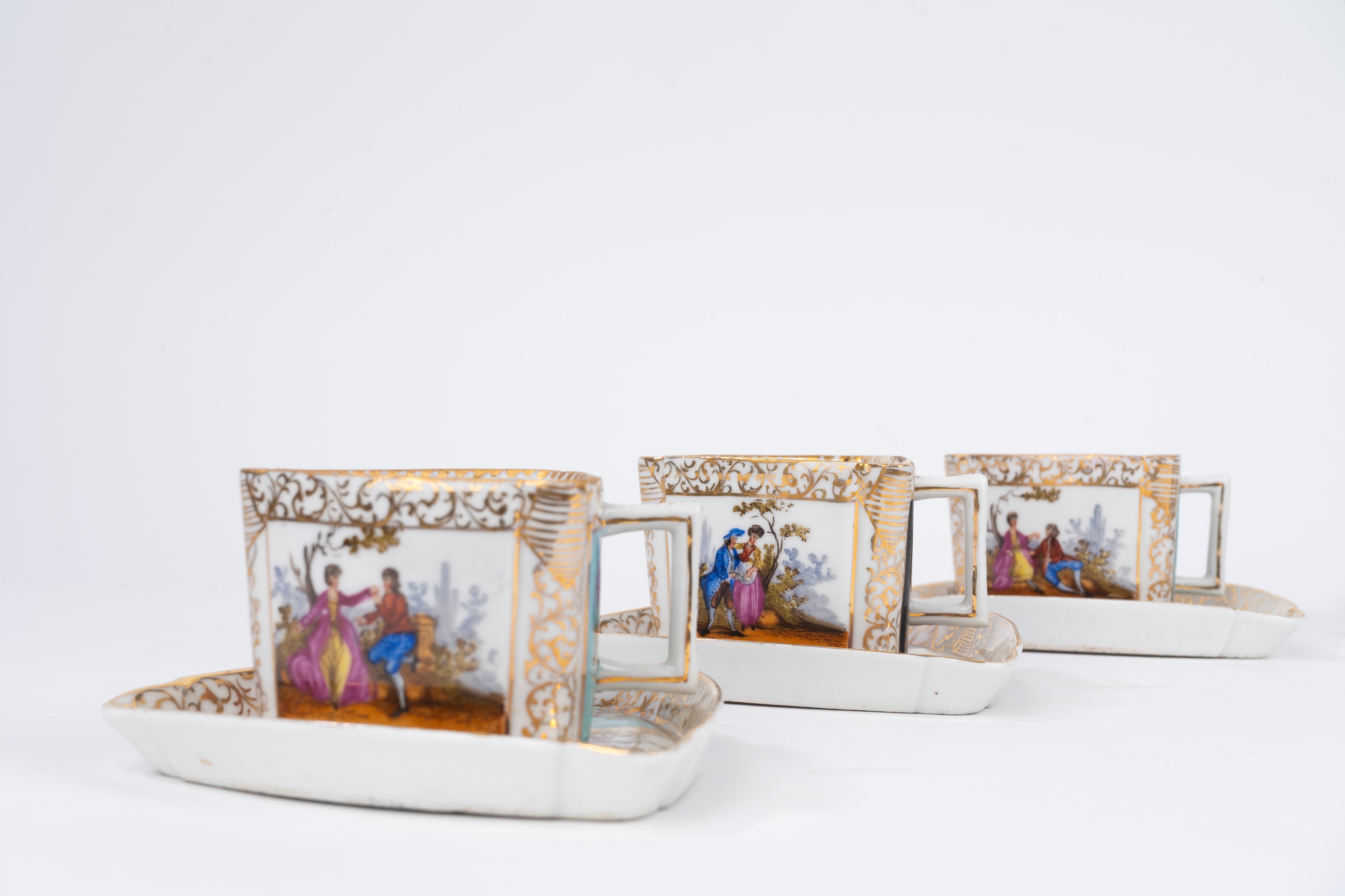 composto da 6 tazzine con piattino, tutte di forma triangolare, decorate con scene galanti, motivi floreali e arabeschi in oro