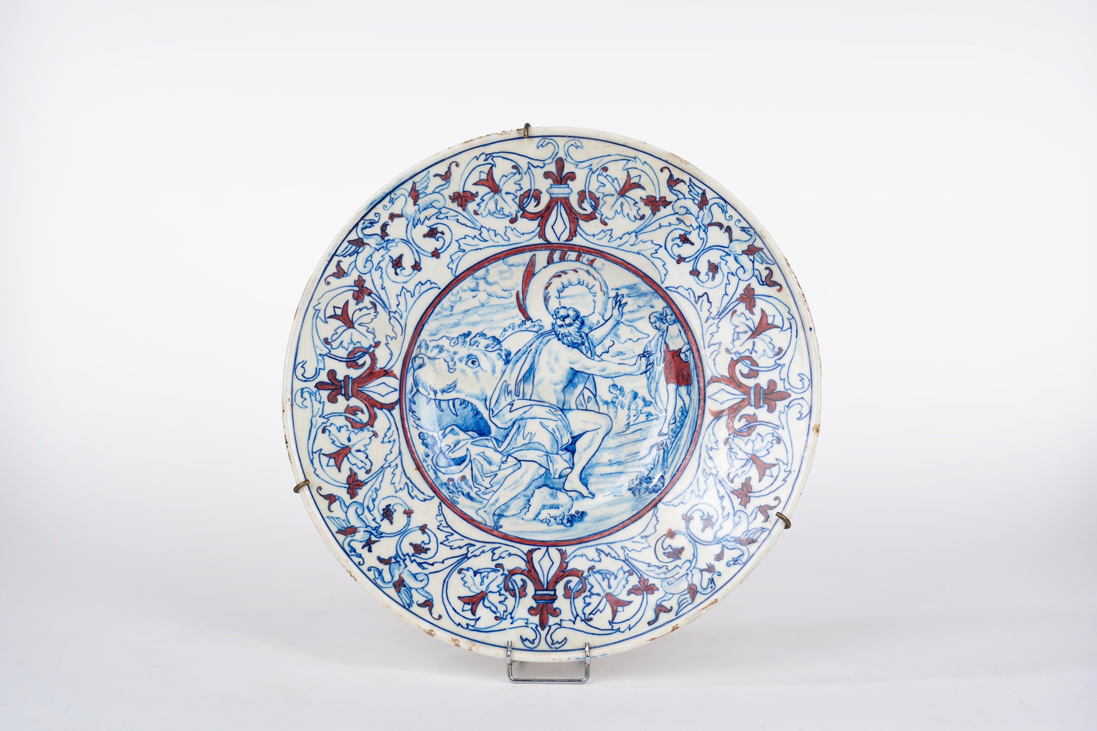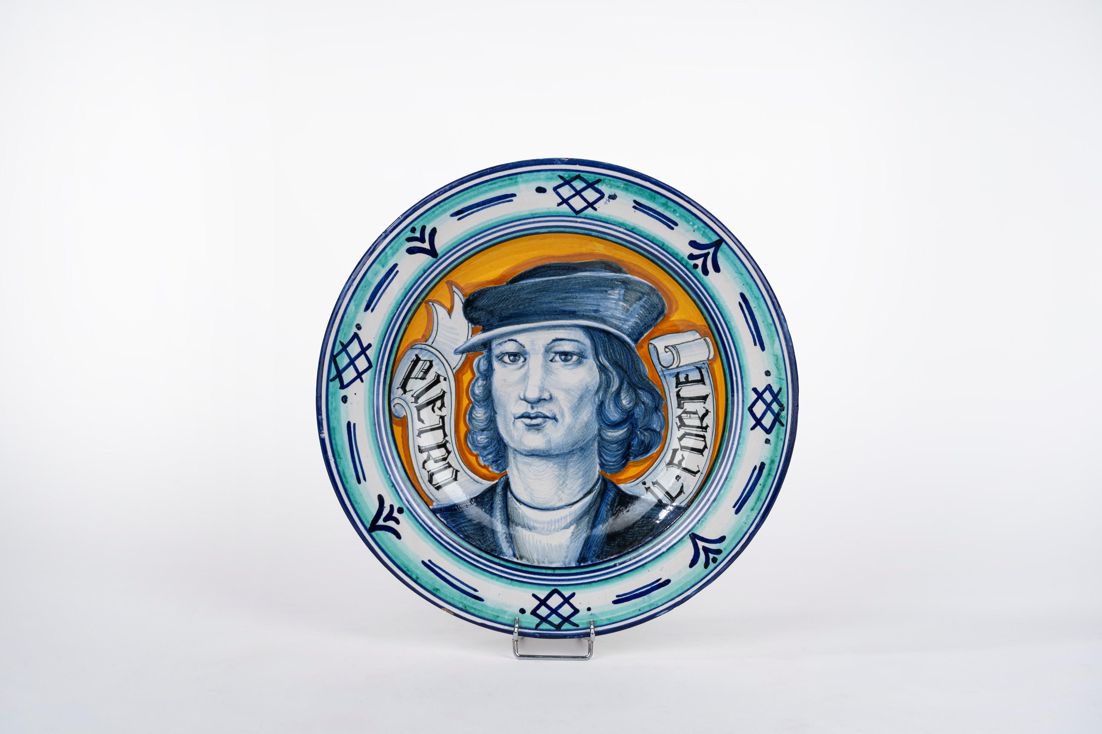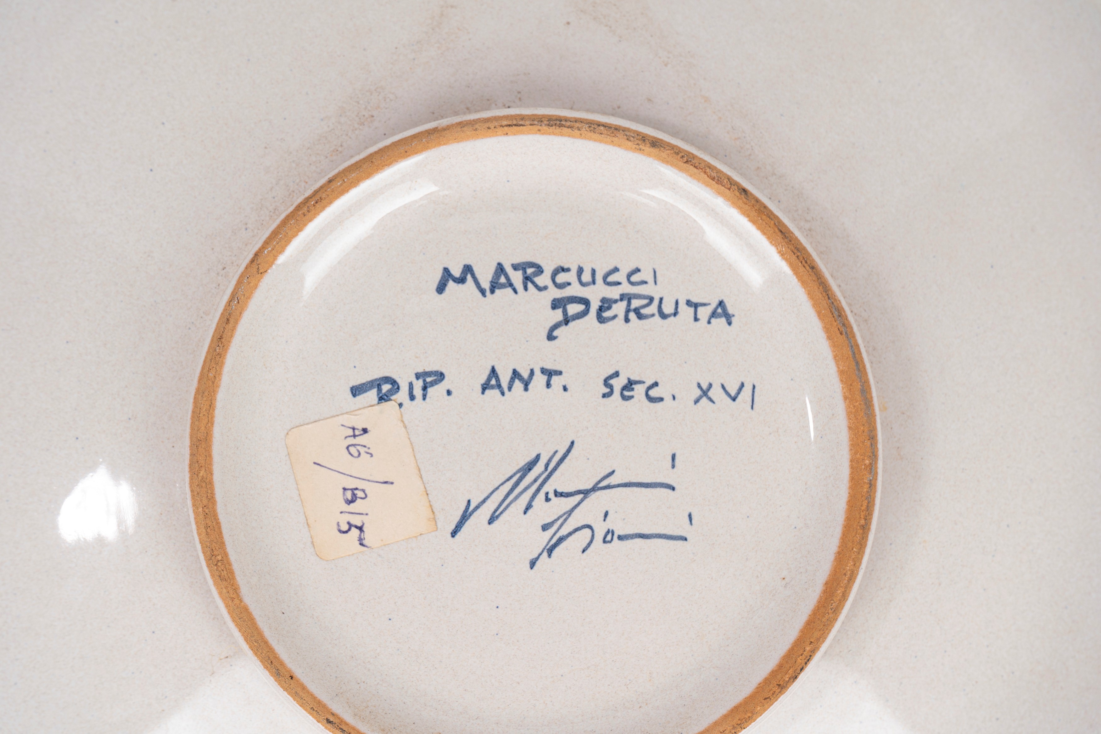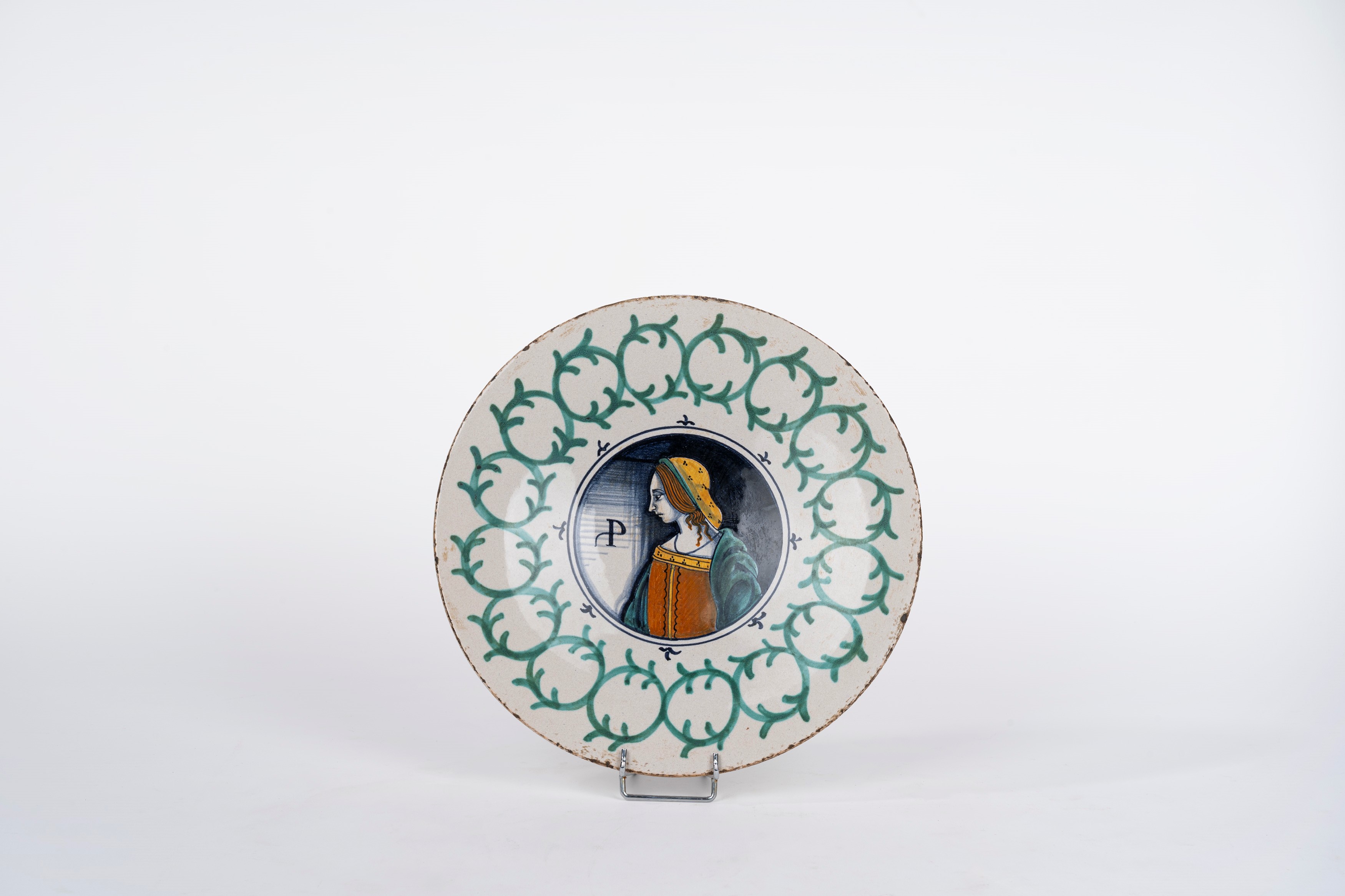 uno con ritratto di donna nel cavetto e motivo a racemi nella tesa, firmato sotto la base: Marcucci Deruta RIP. ANT. SEC XVI, uno con ritratto di Pietro il Forte nel cavetto e marchio con spiga sotto la base, uno con Laocoonte nel cavetto e grottesche nella tesa (con rottura)