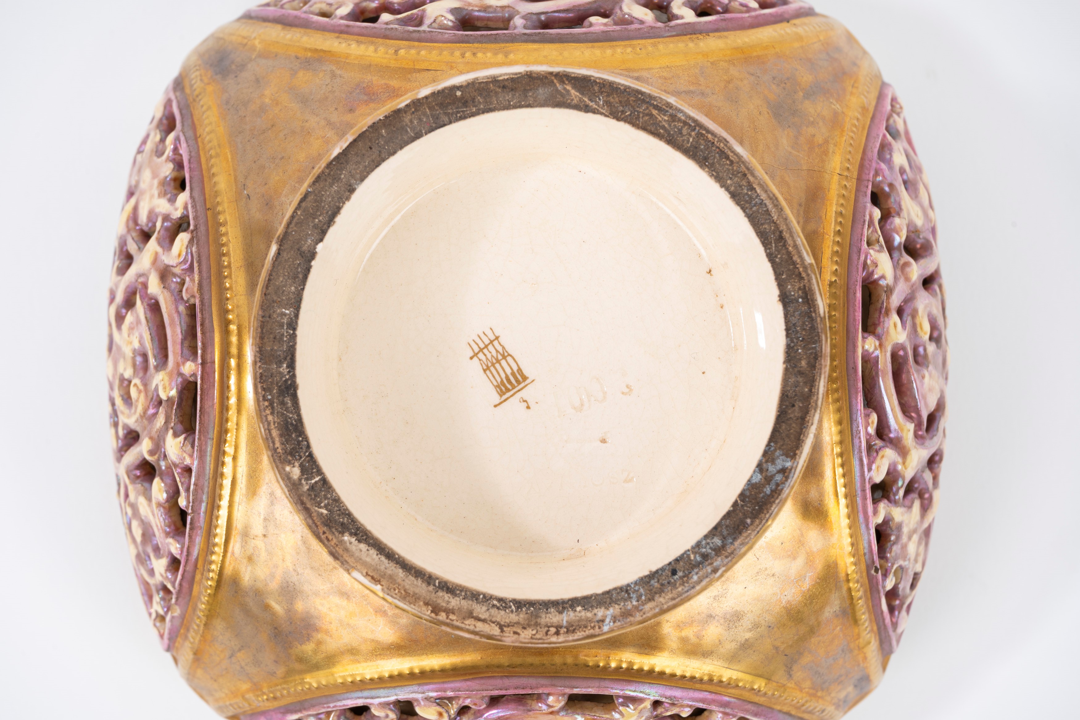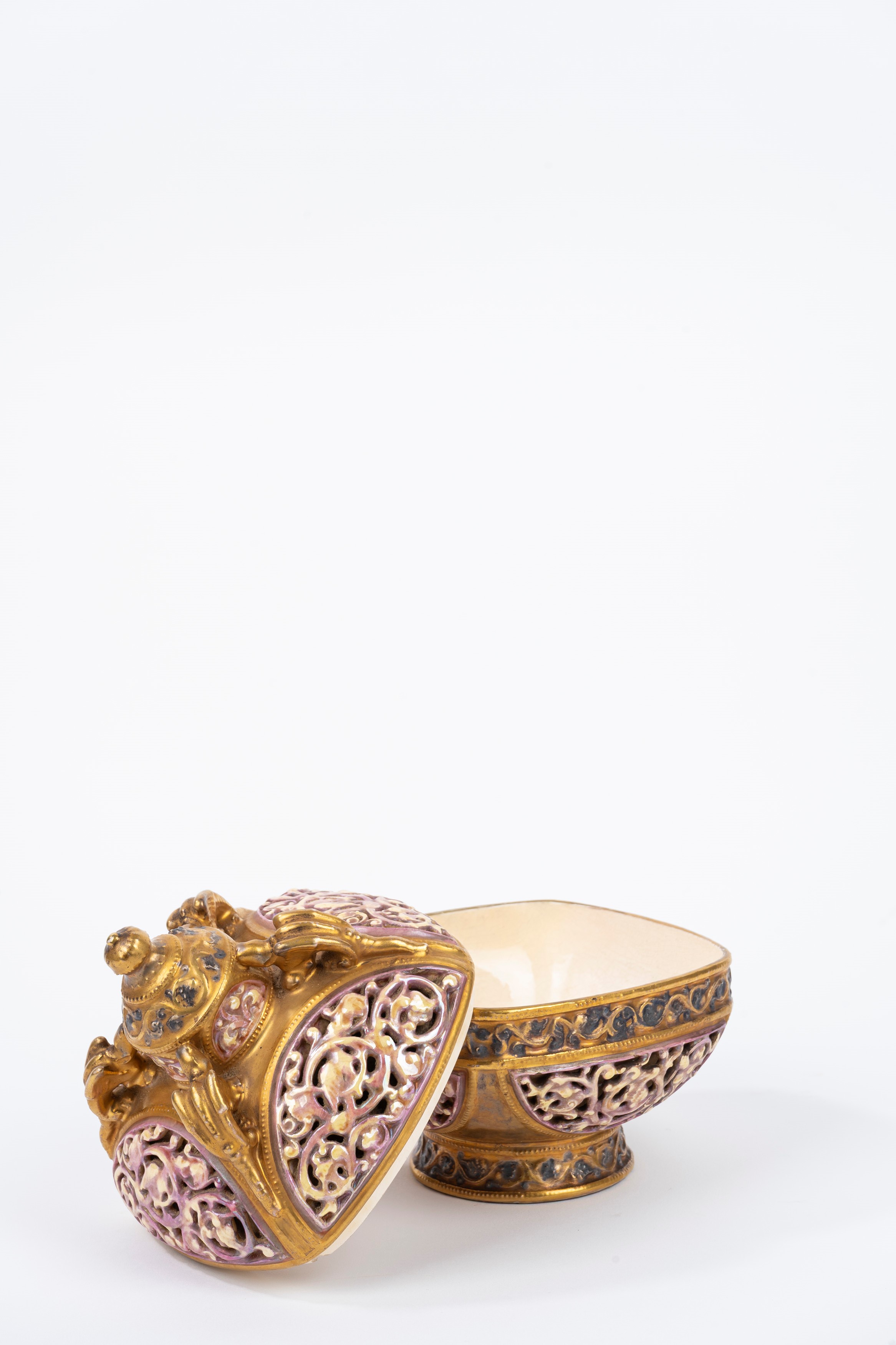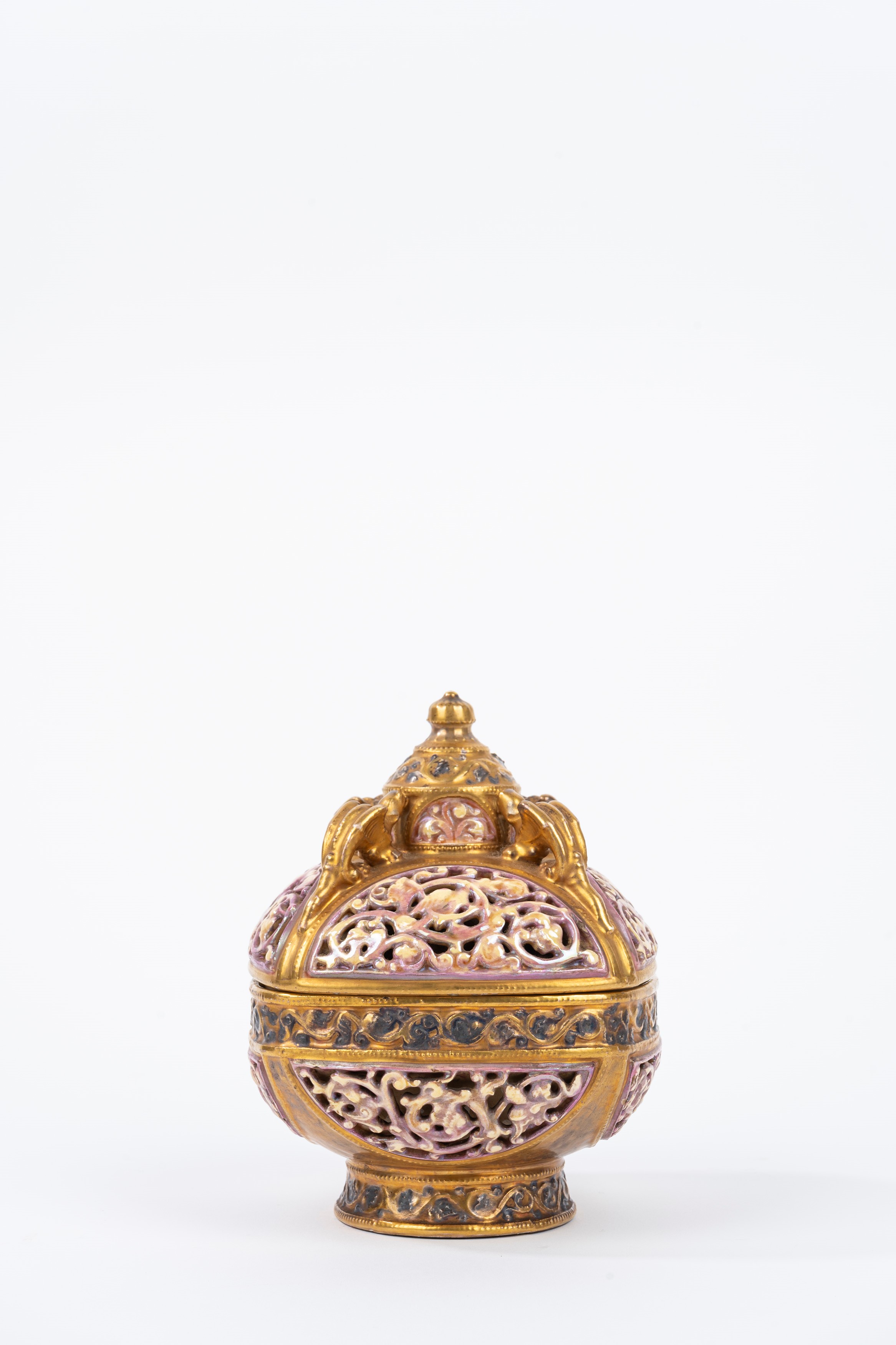 Vaso in porcellana policroma e dorata con coperchio, manifattura Zsolnay, prima metà del secolo XX