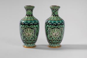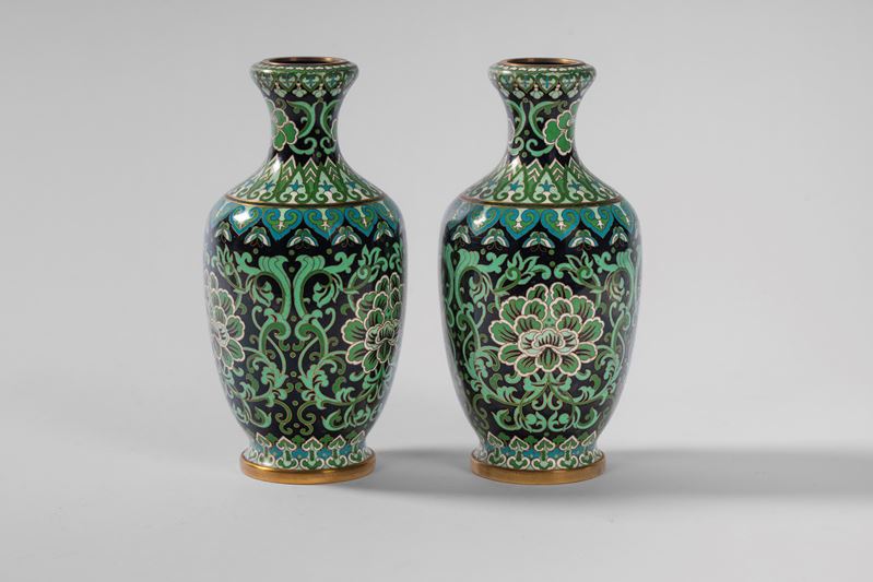 Bella coppia di vasi cloisonnè nei toni del verde su fondo nero a decoro floreale, XX secolo