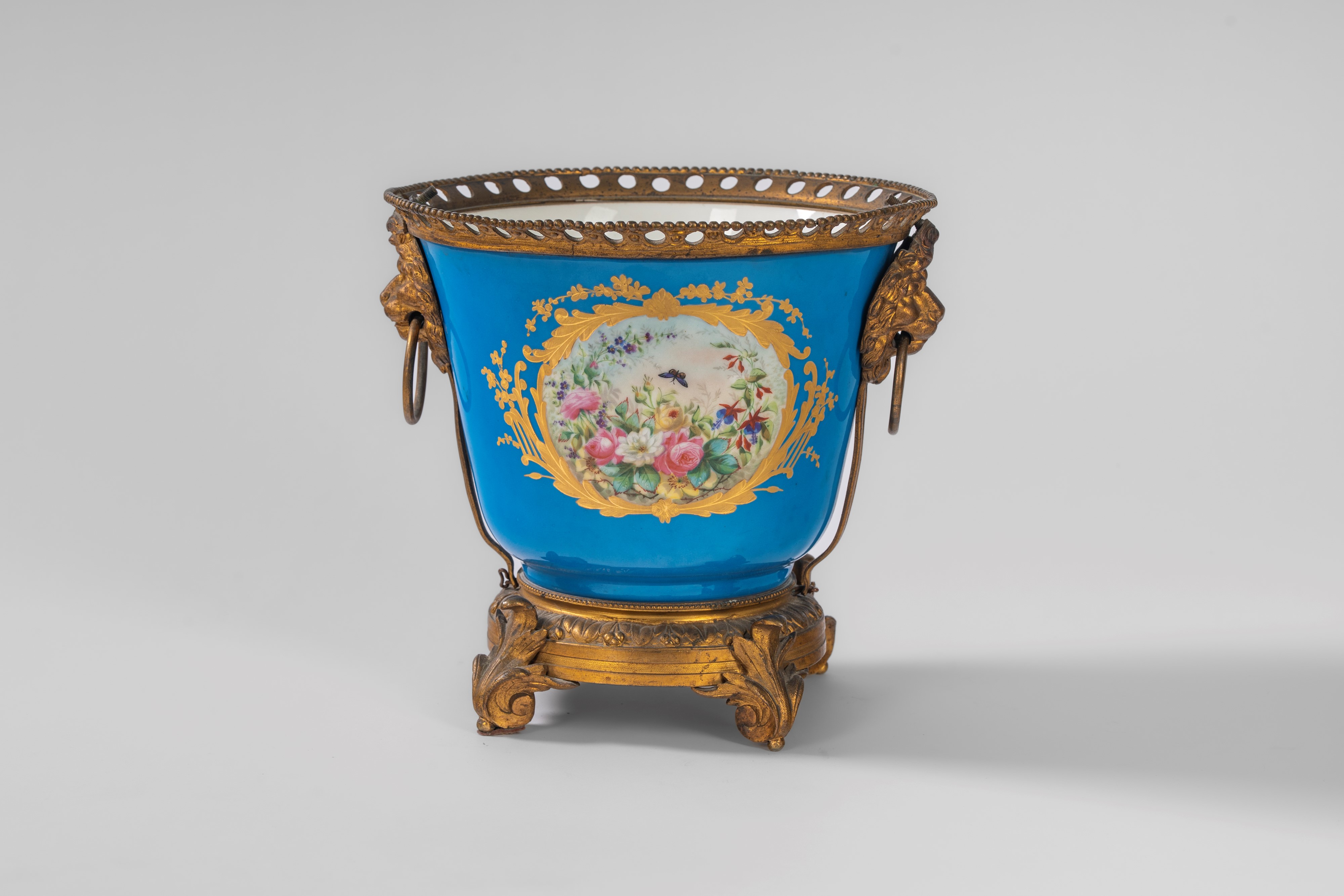 del tipo Sèvres. Decorato in policromia da cartelle dorate con fanciulli in un paesaggio e bouquet di fiori con farfalla. Anse a teste leonine con presa ad anello, base circolare poggiante su quattro piedi a voluta.
