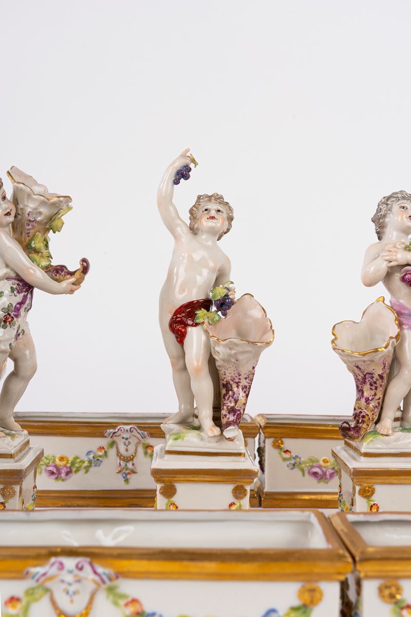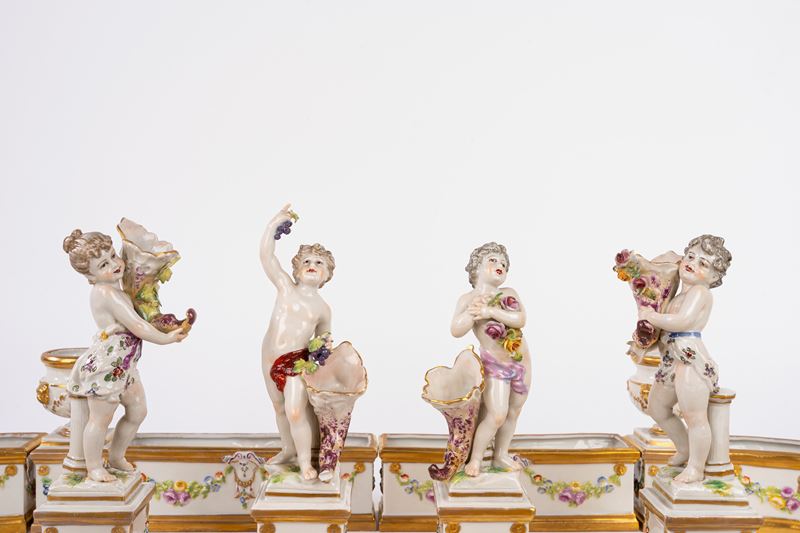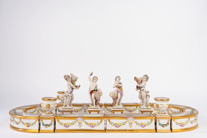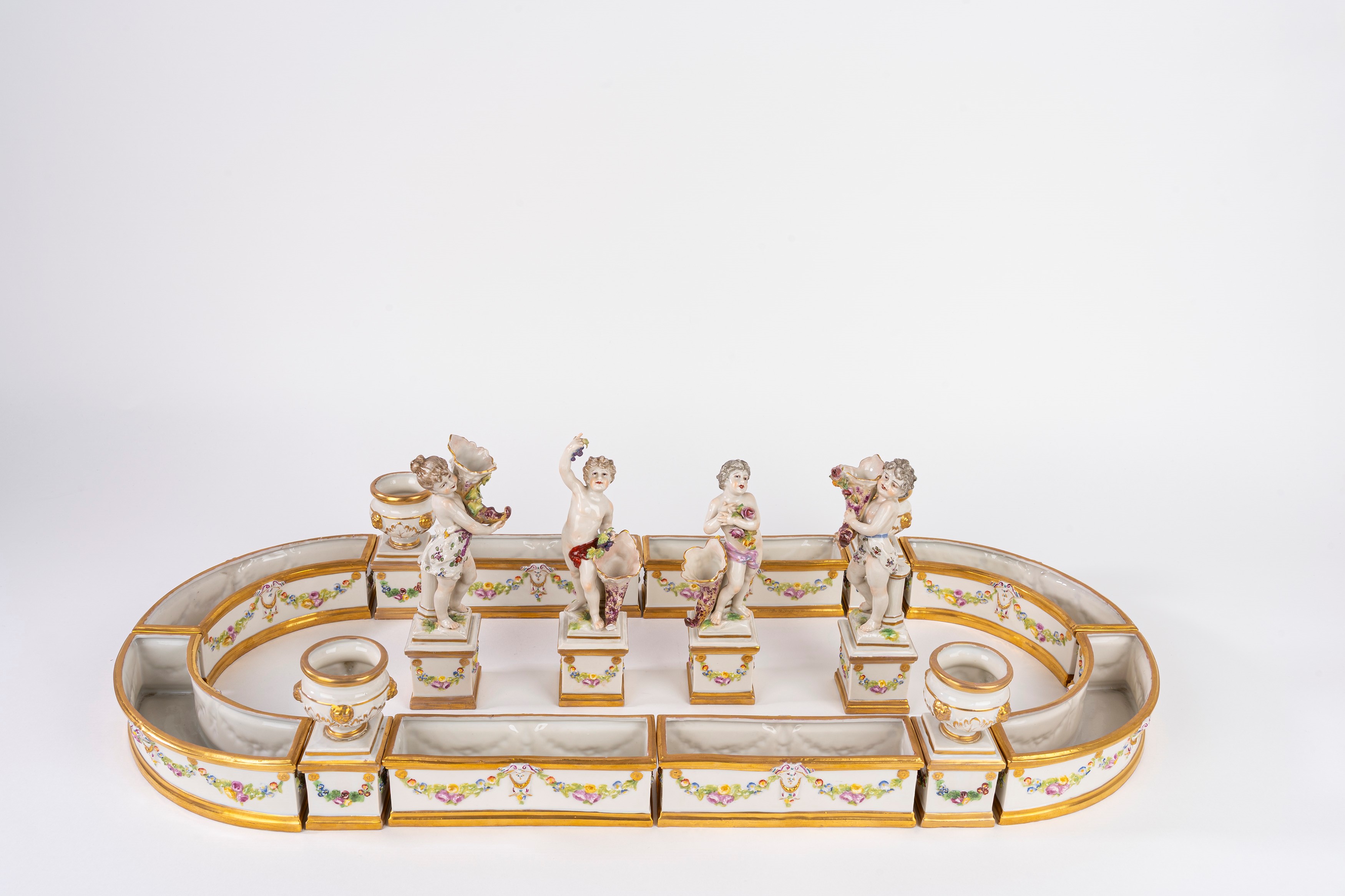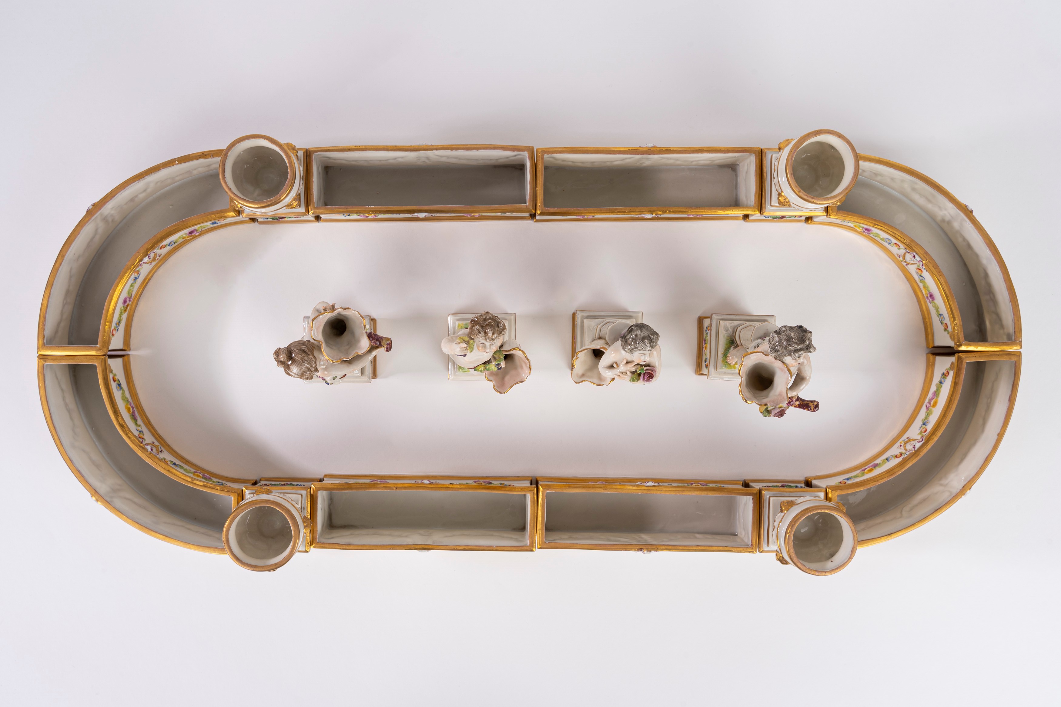 composto da quattro vasetti, quattro elementi curvilinei, quattro elementi orizzontali e quattro statuine raffiguranti puttini con cornucopie, insieme formano un centrotavola ovale