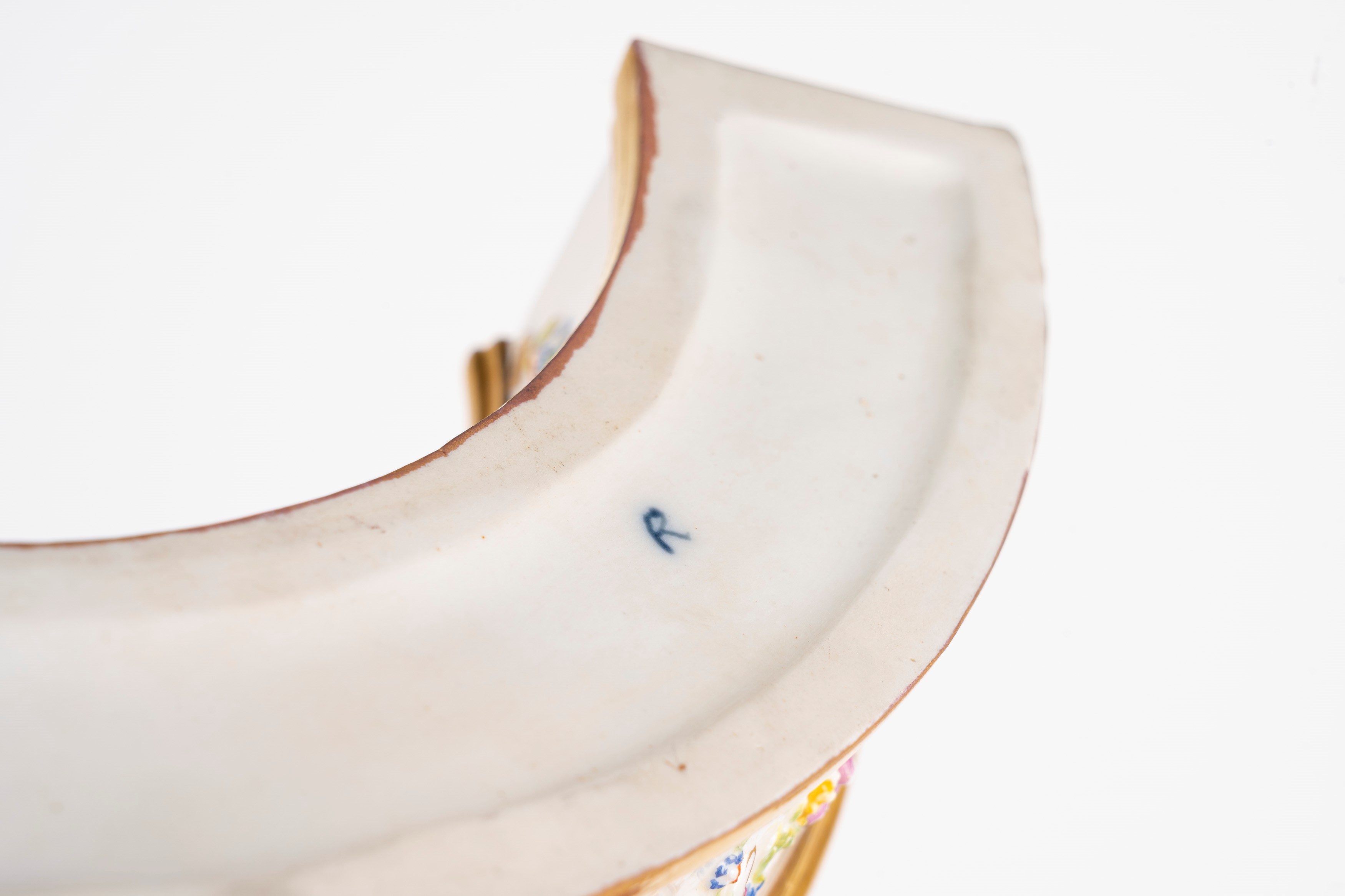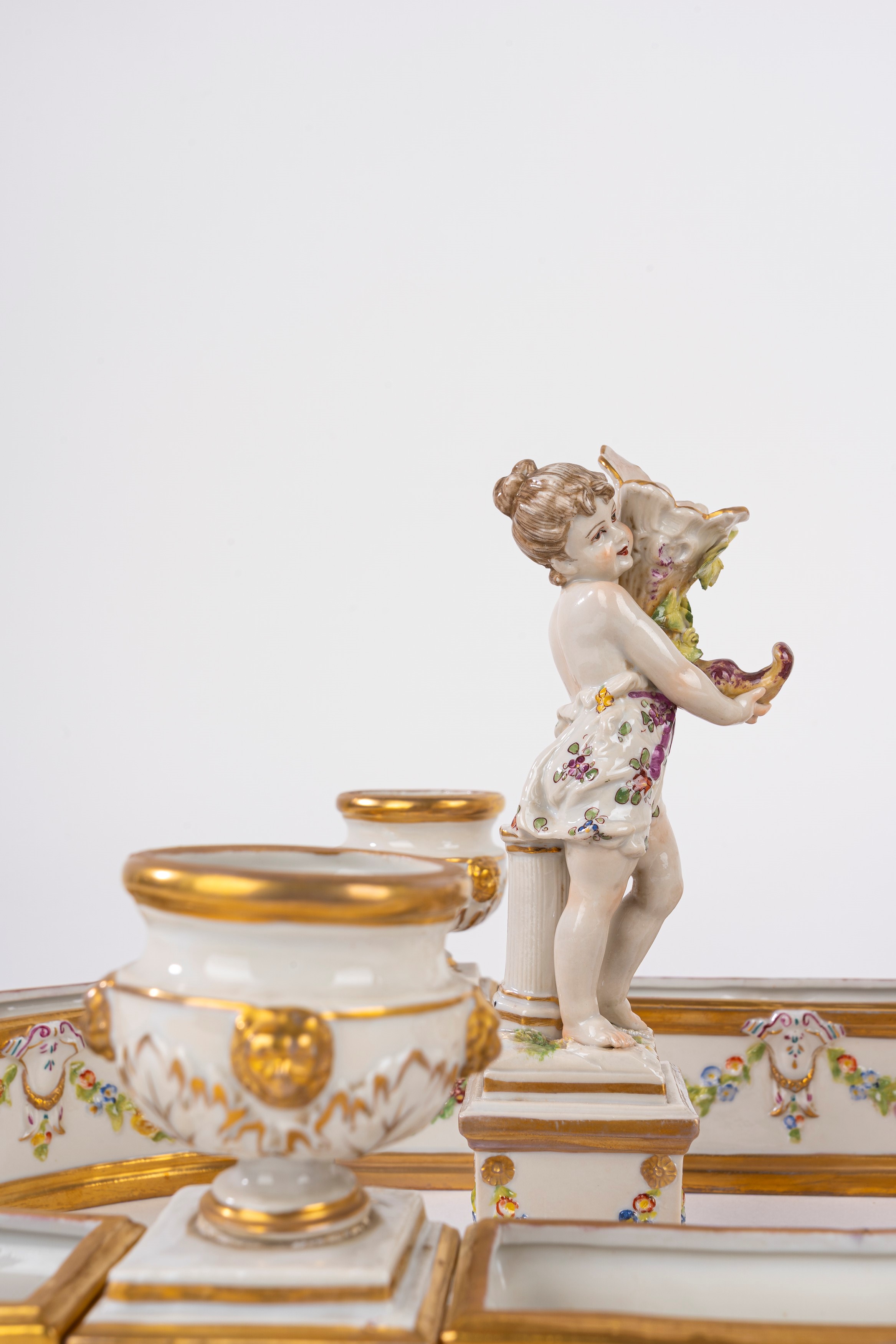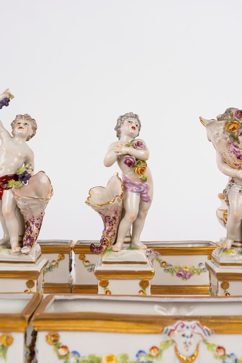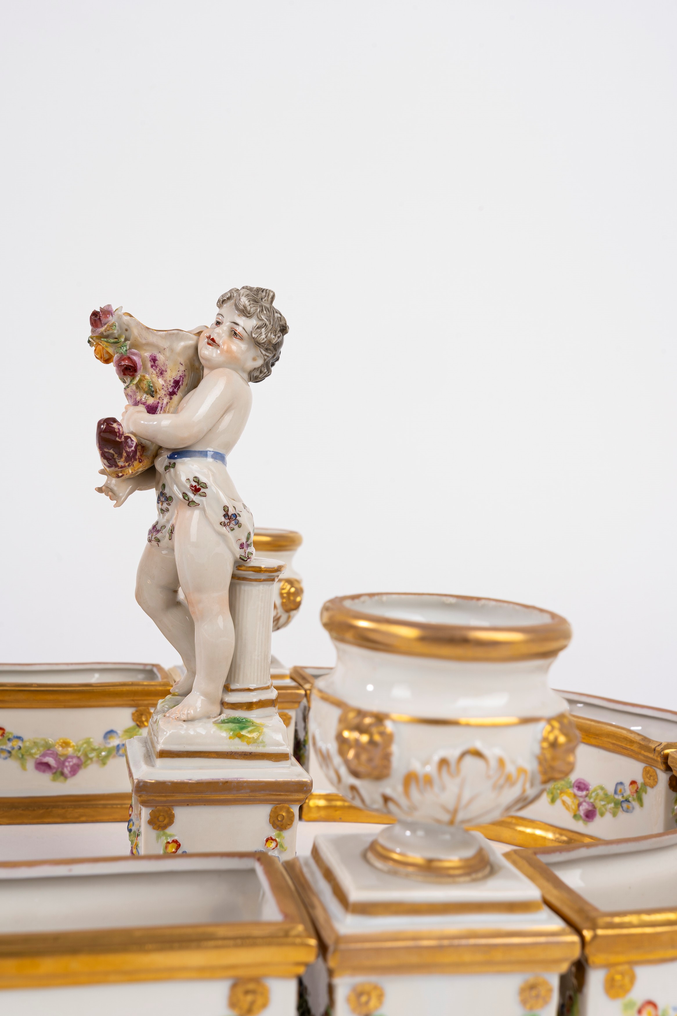 composto da quattro vasetti, quattro elementi curvilinei, quattro elementi orizzontali e quattro statuine raffiguranti puttini con cornucopie, insieme formano un centrotavola ovale