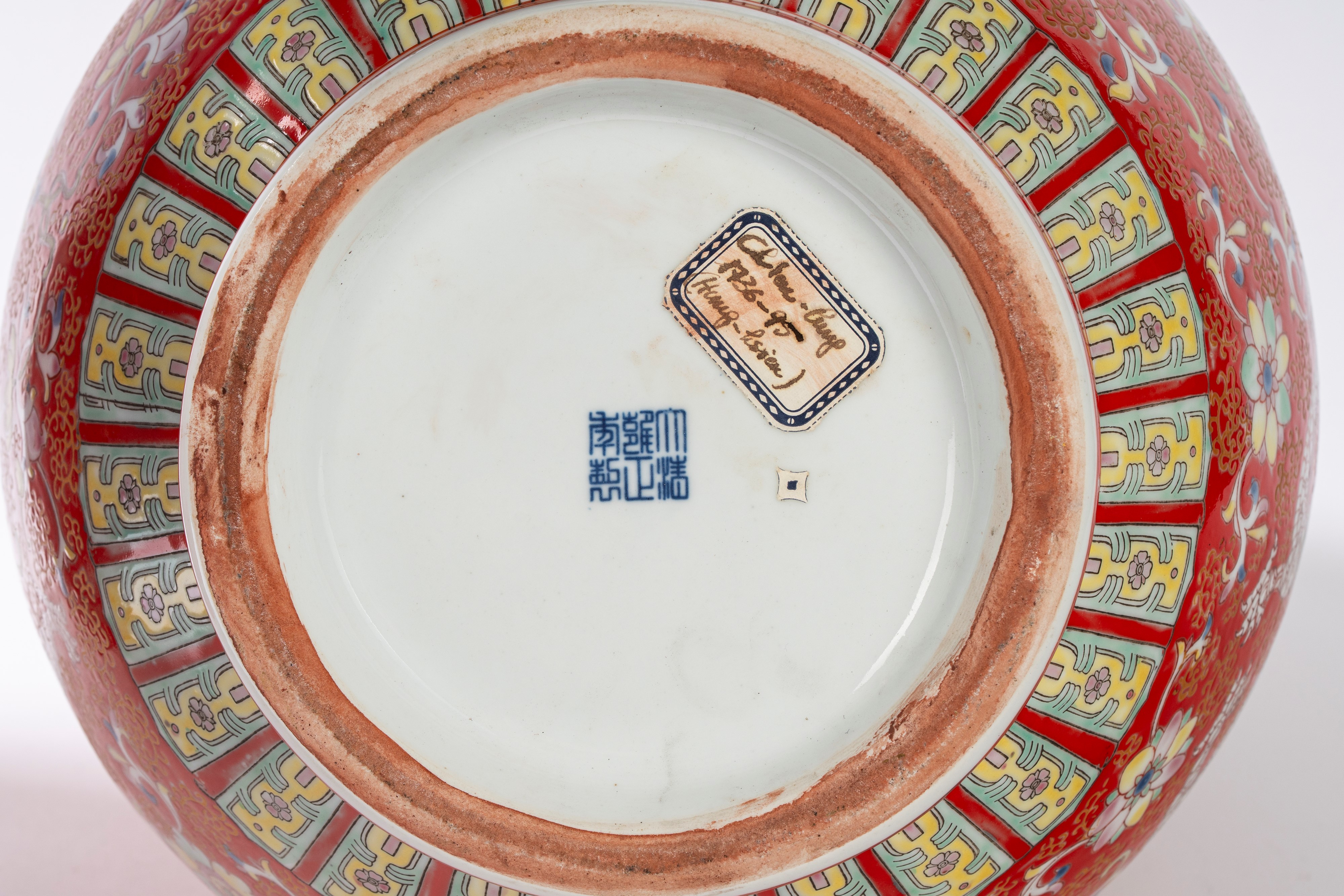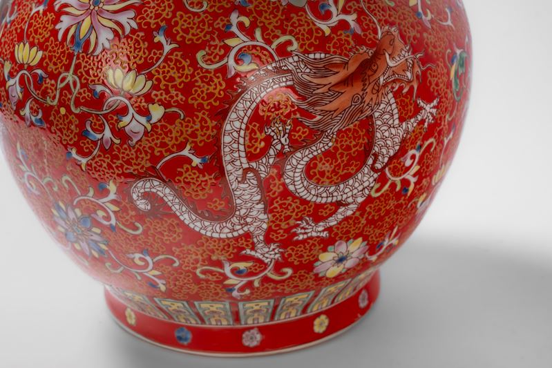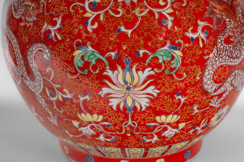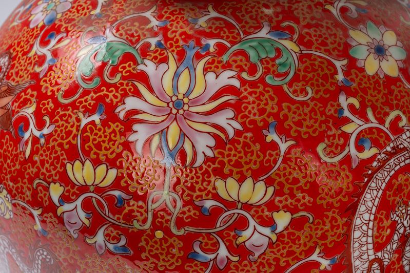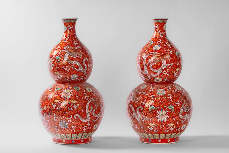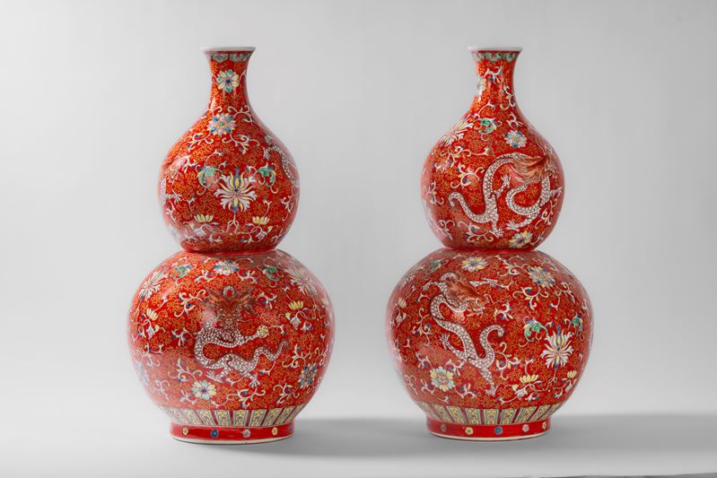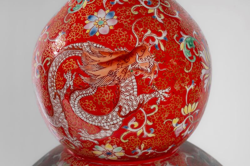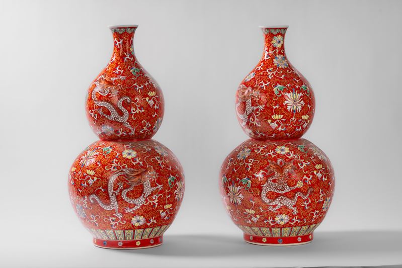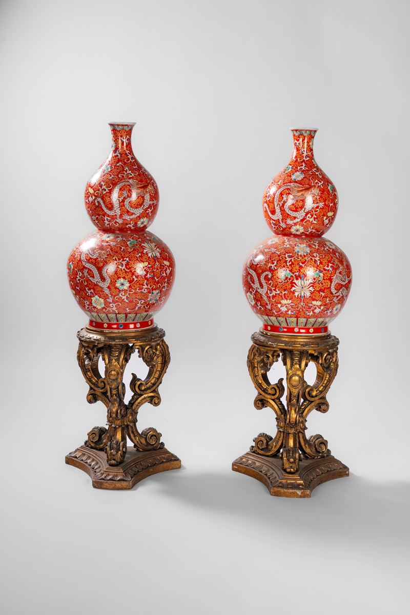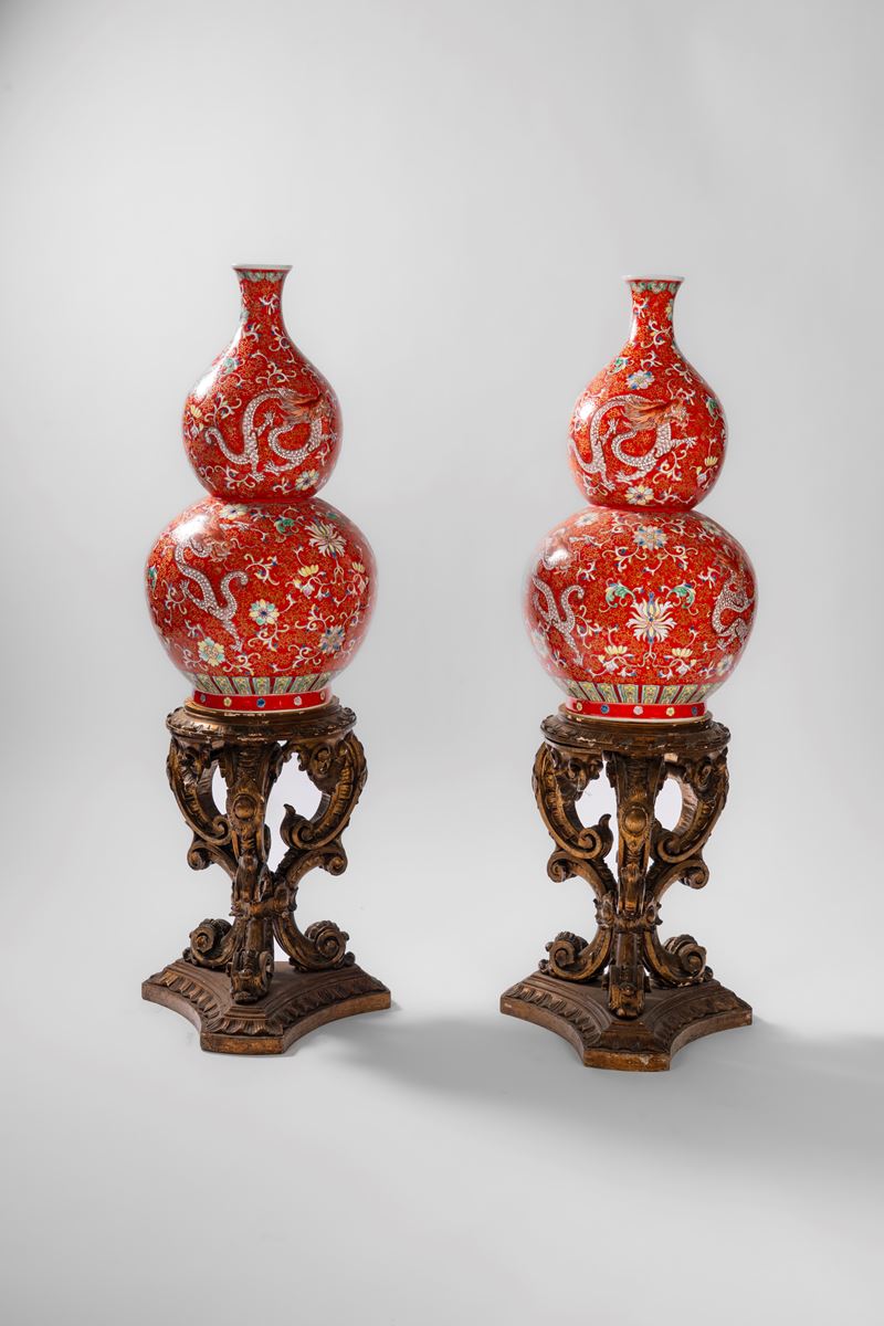 Coppia di grandi vasi a doppia zucca, con draghi, fiori e racemi, su fondo rosso, Cina, XX secolo. Insieme a grandi basi in legno intagliato e dorato fine XIX / Inizi XX secolo.