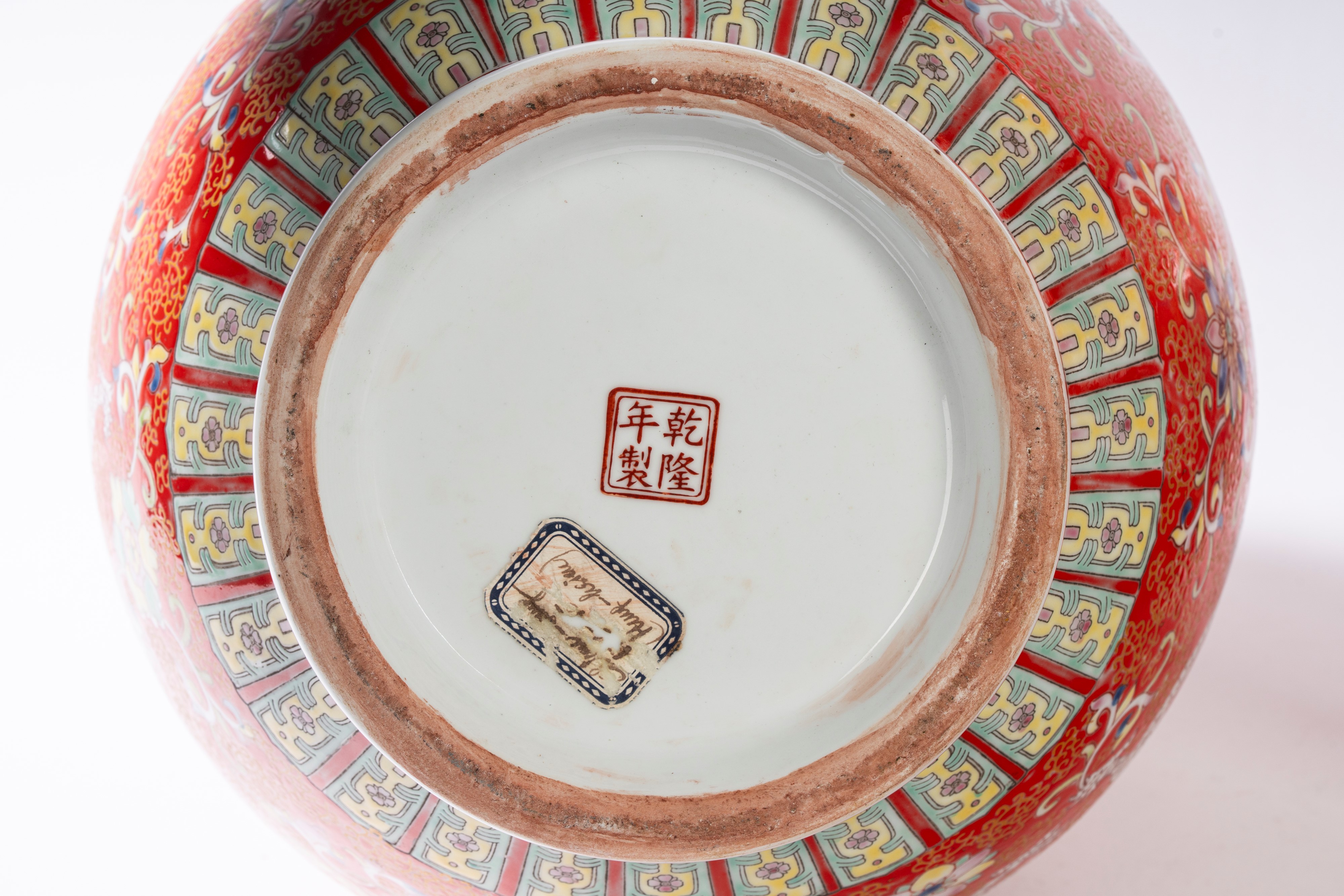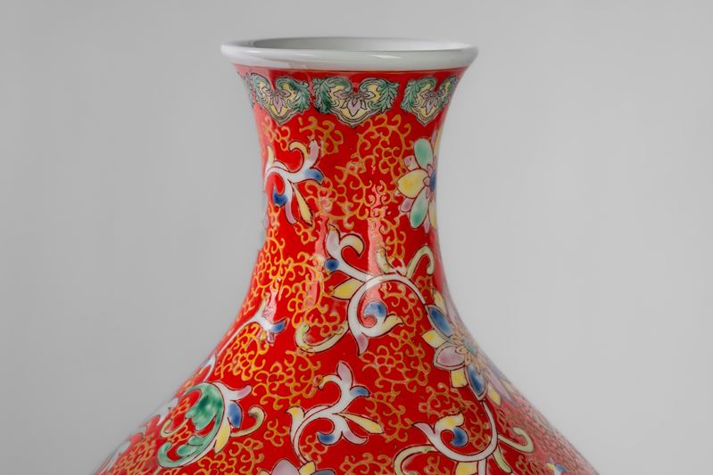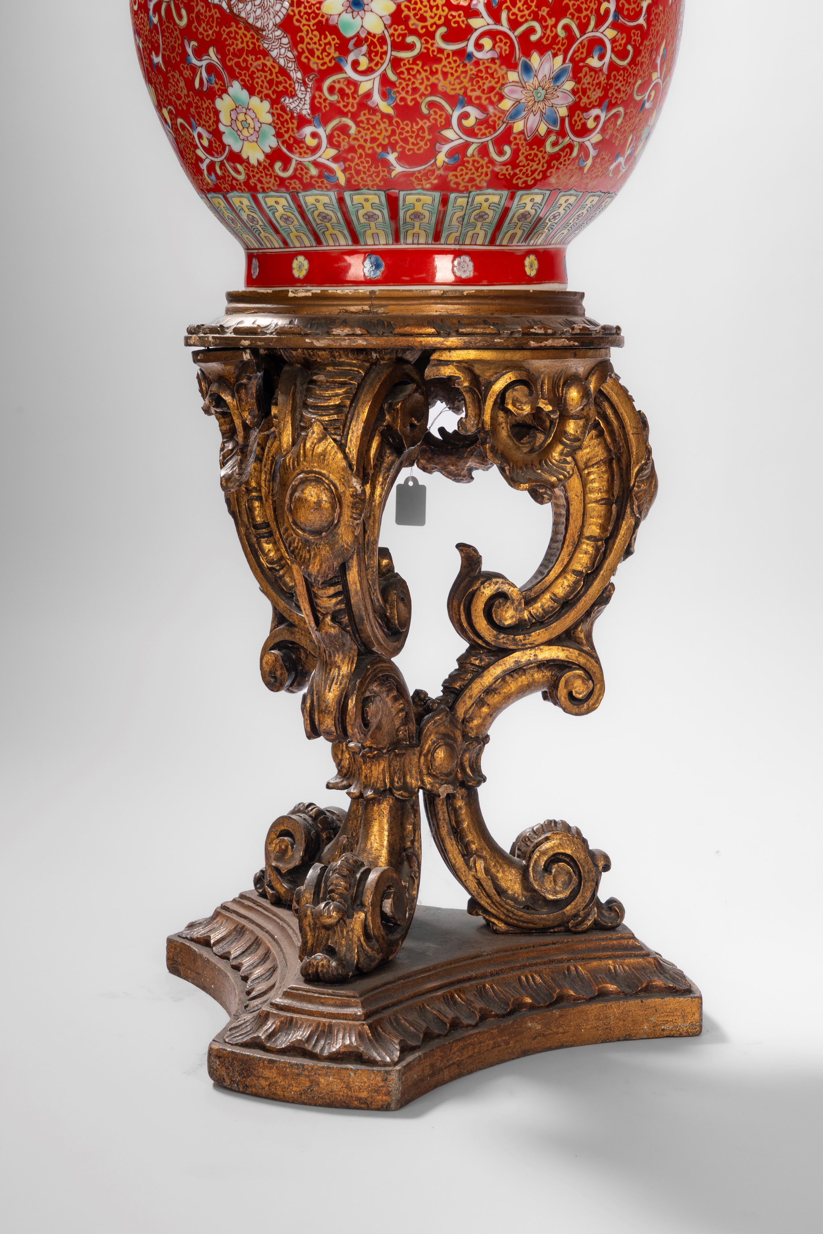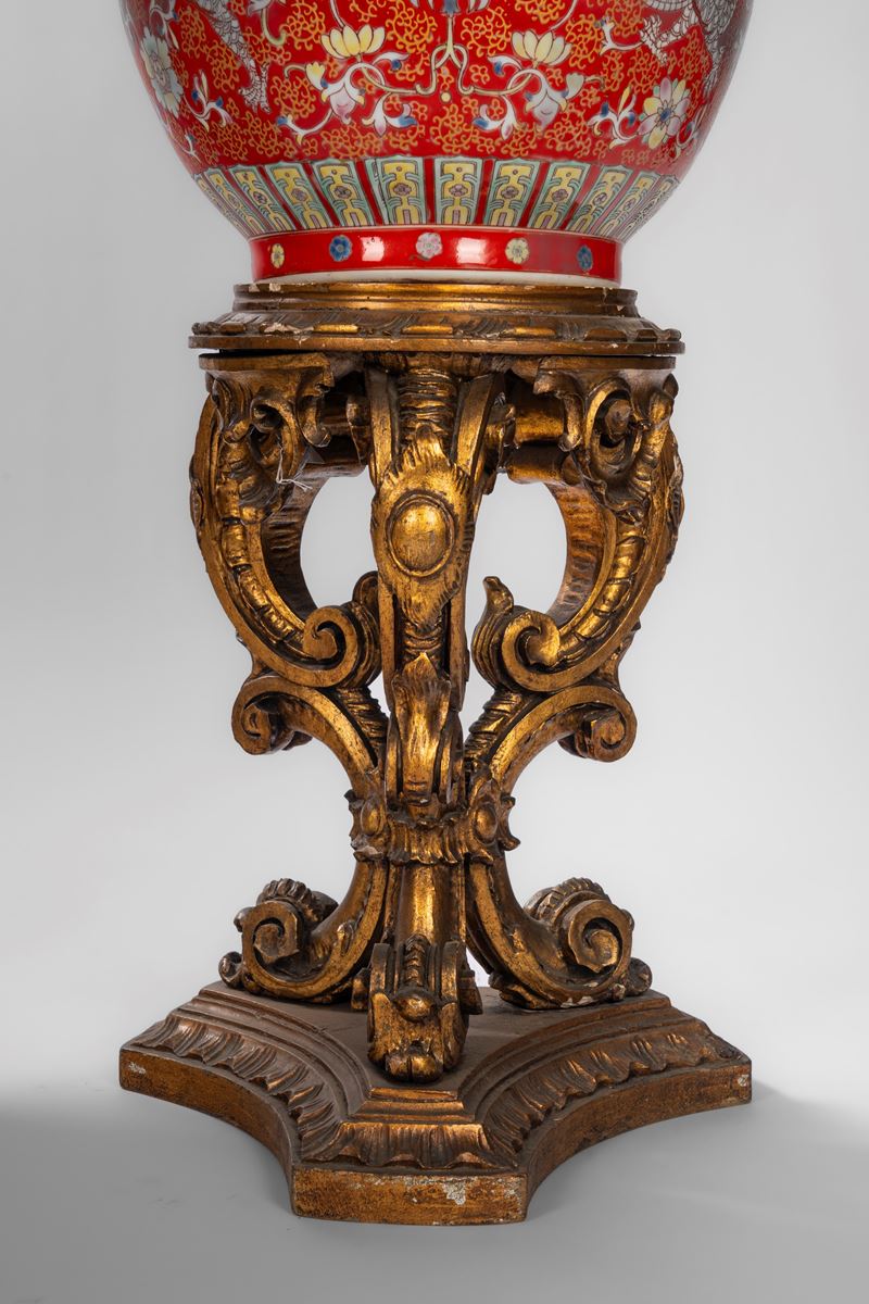 一对大型双葫芦形瓷瓶,红地,饰龙纹、花卉及卷草纹,中国,20世纪;配大型木雕鎏金底座,19世纪末–20世纪初
