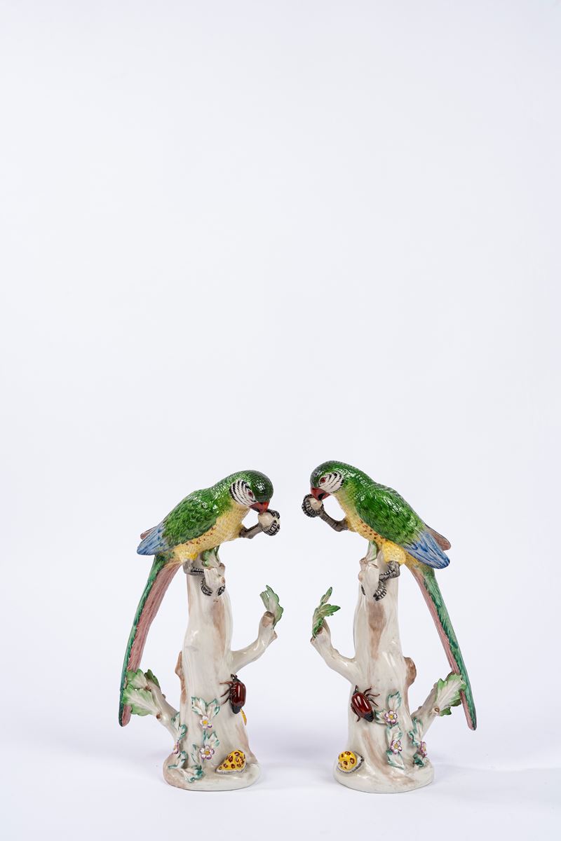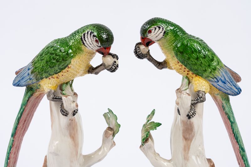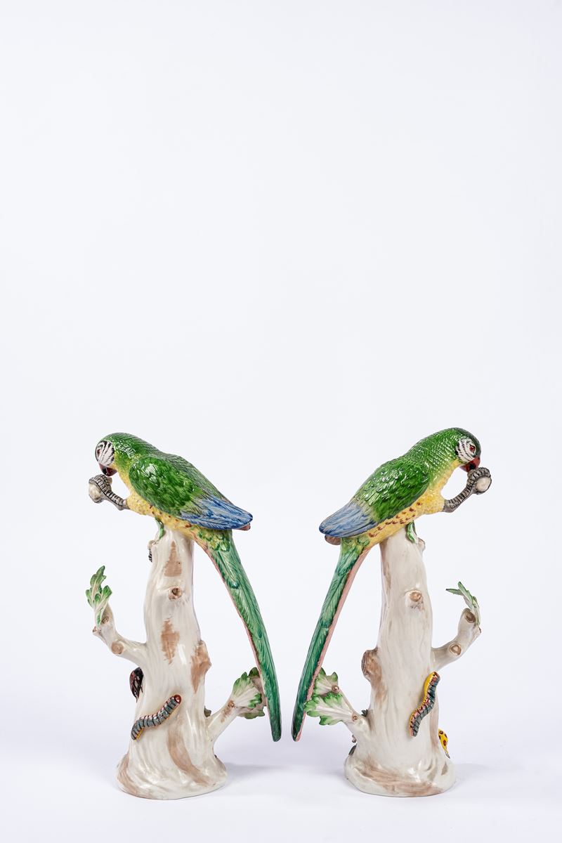 Coppia di pappagalli in porcellana policroma, manifattura Agostinelli Bassano