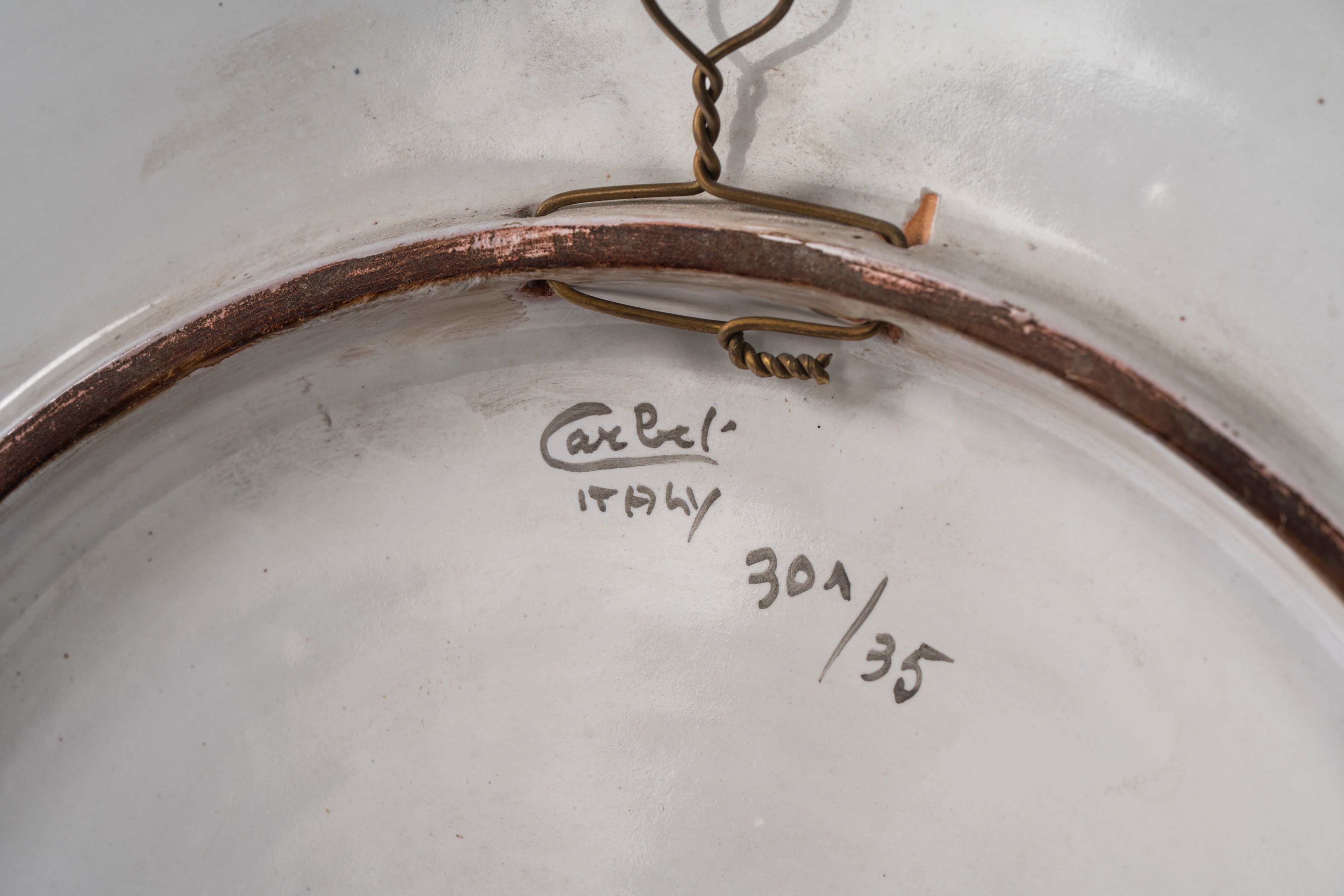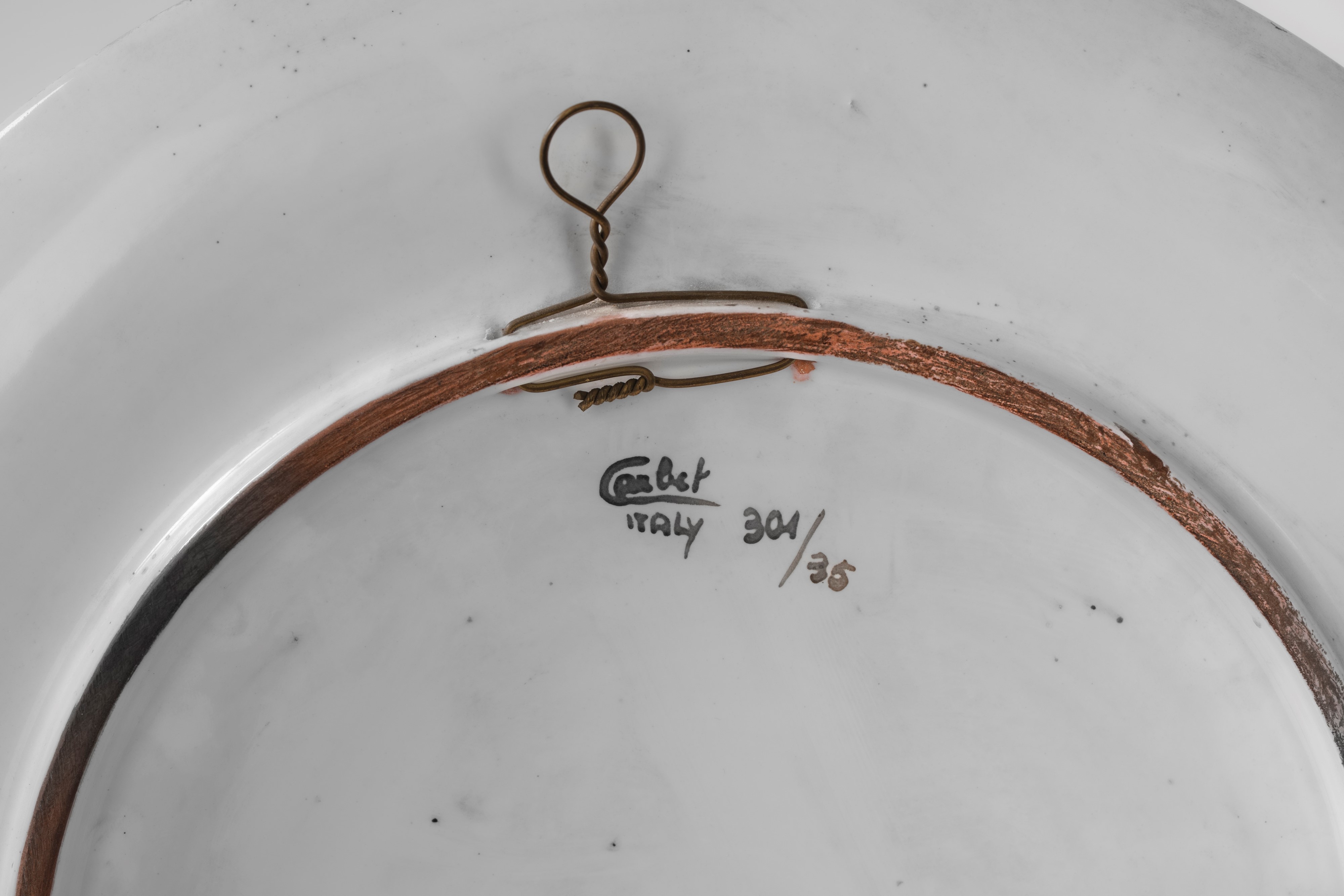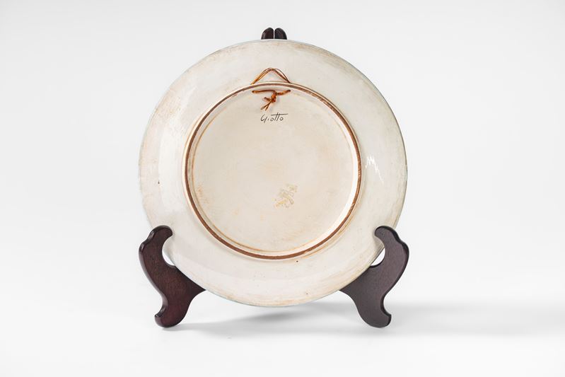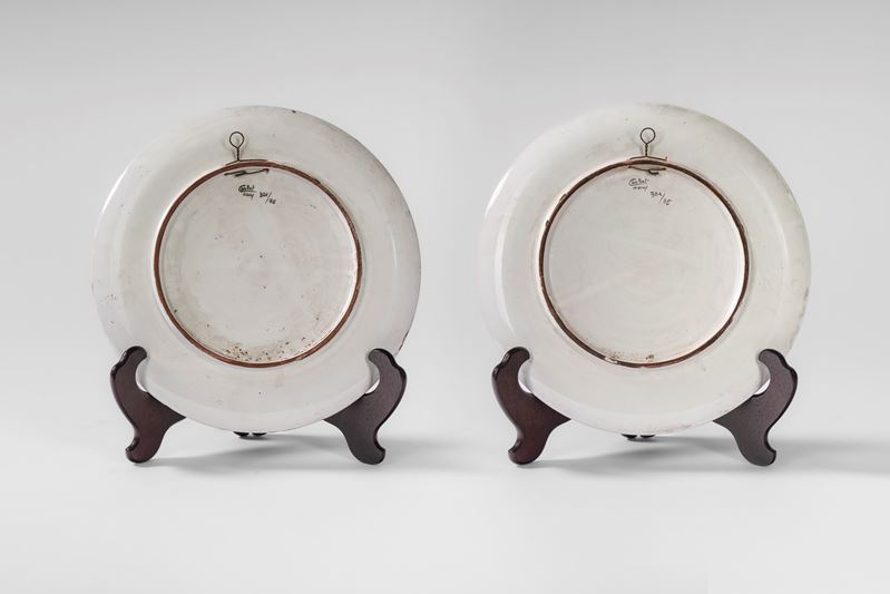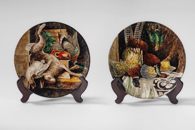 Coppia di piatti da parata in maiolica policroma con scene di cacciagione. Manifattura Carbet, Carotti e Bettucci, Firenze, prima metà secolo XX circa