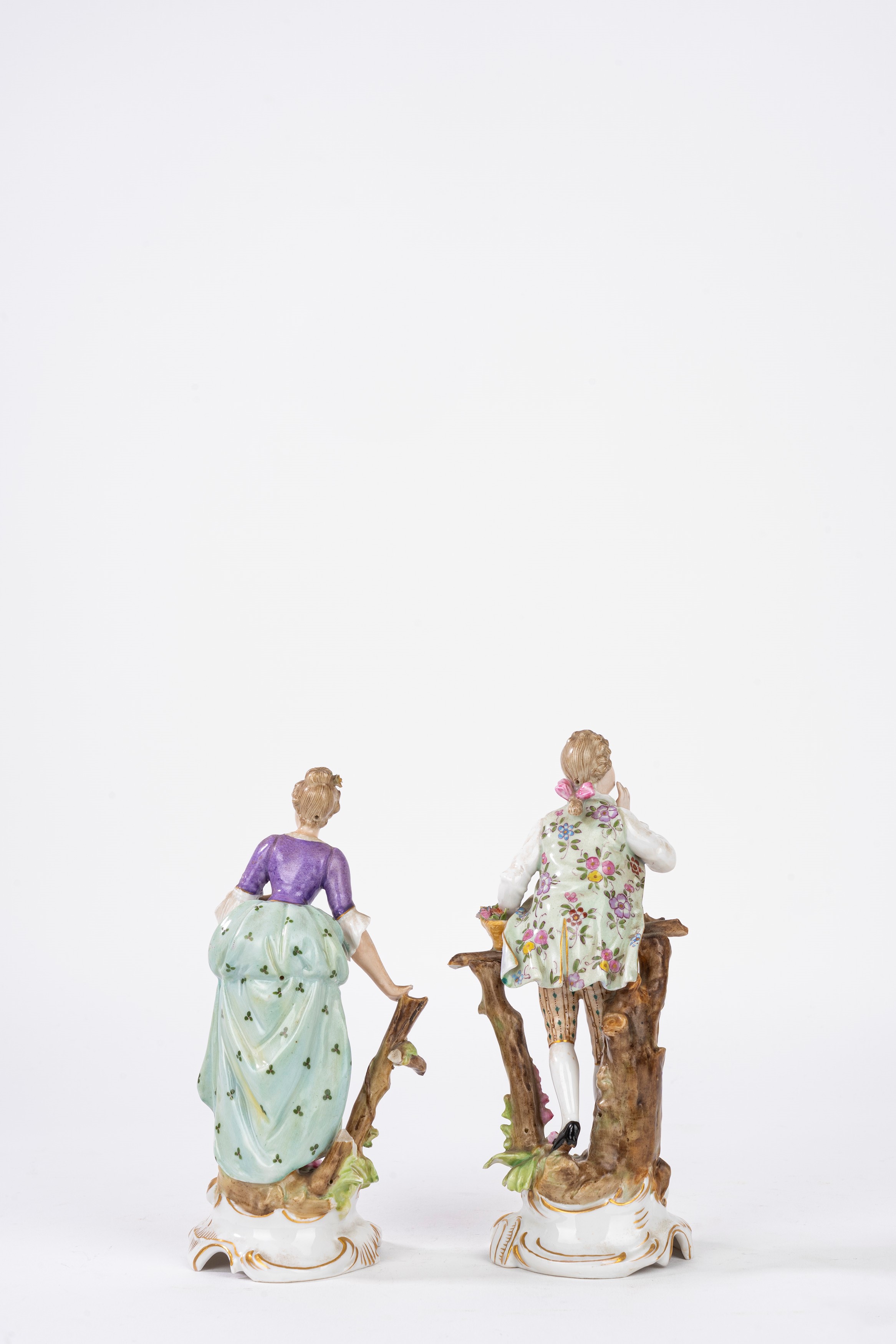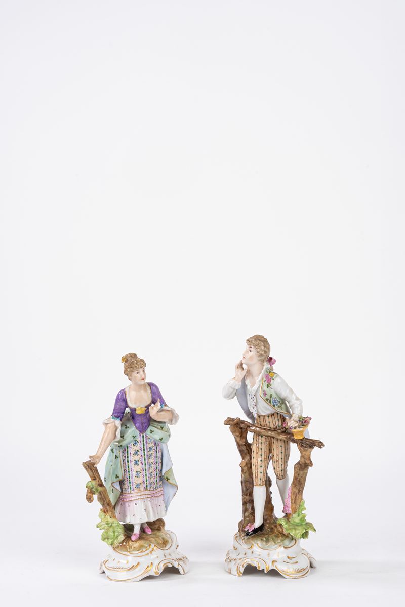 Coppia di statuine in porcellana policroma, prima metà del secolo XX