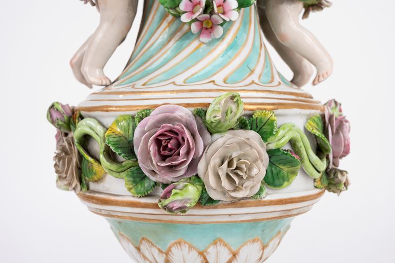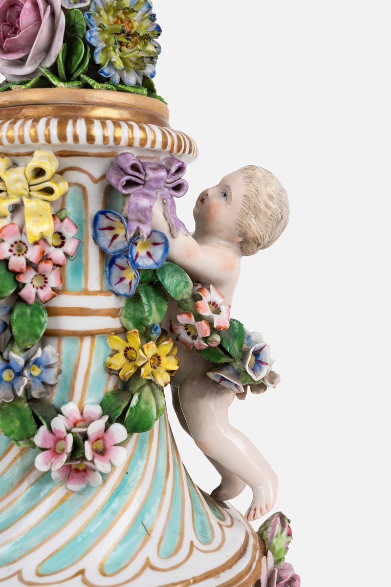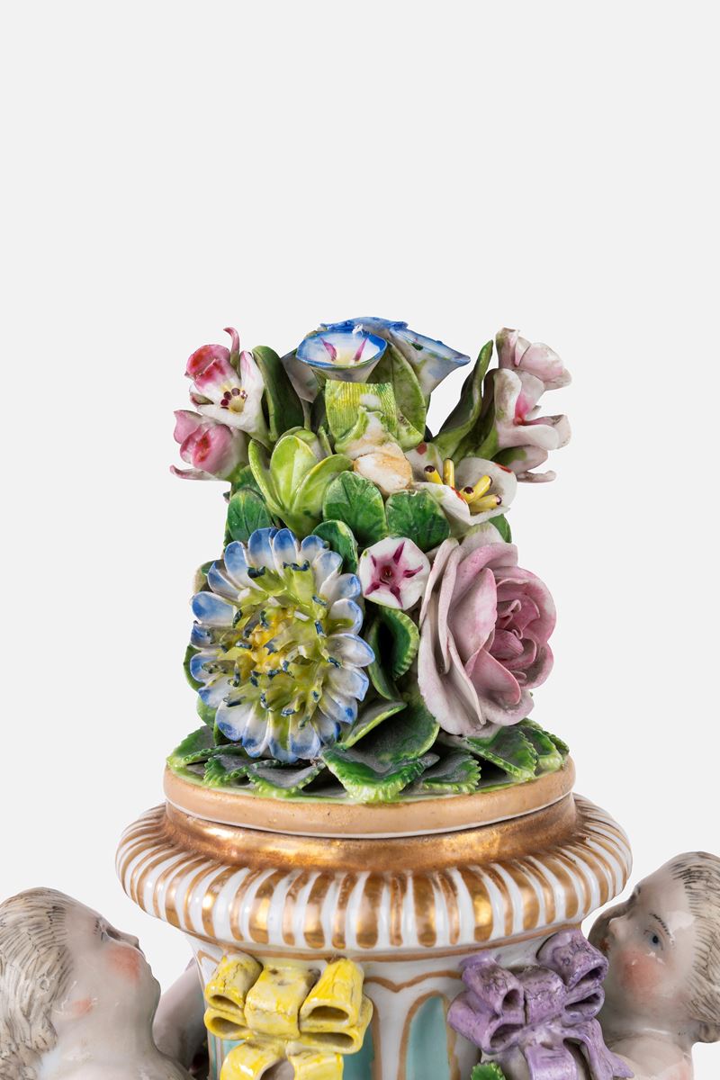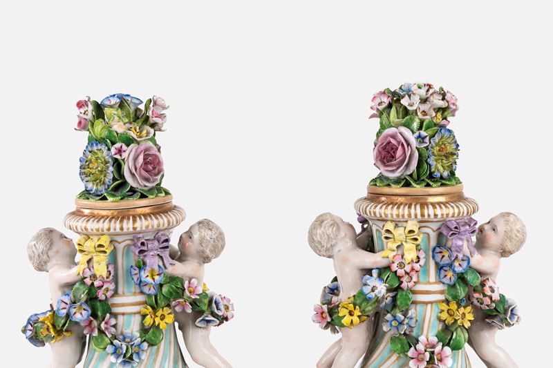 con puttini che reggono un festone di fiori e motivi scanalati, coperchi a guisa di bouquet di fiori